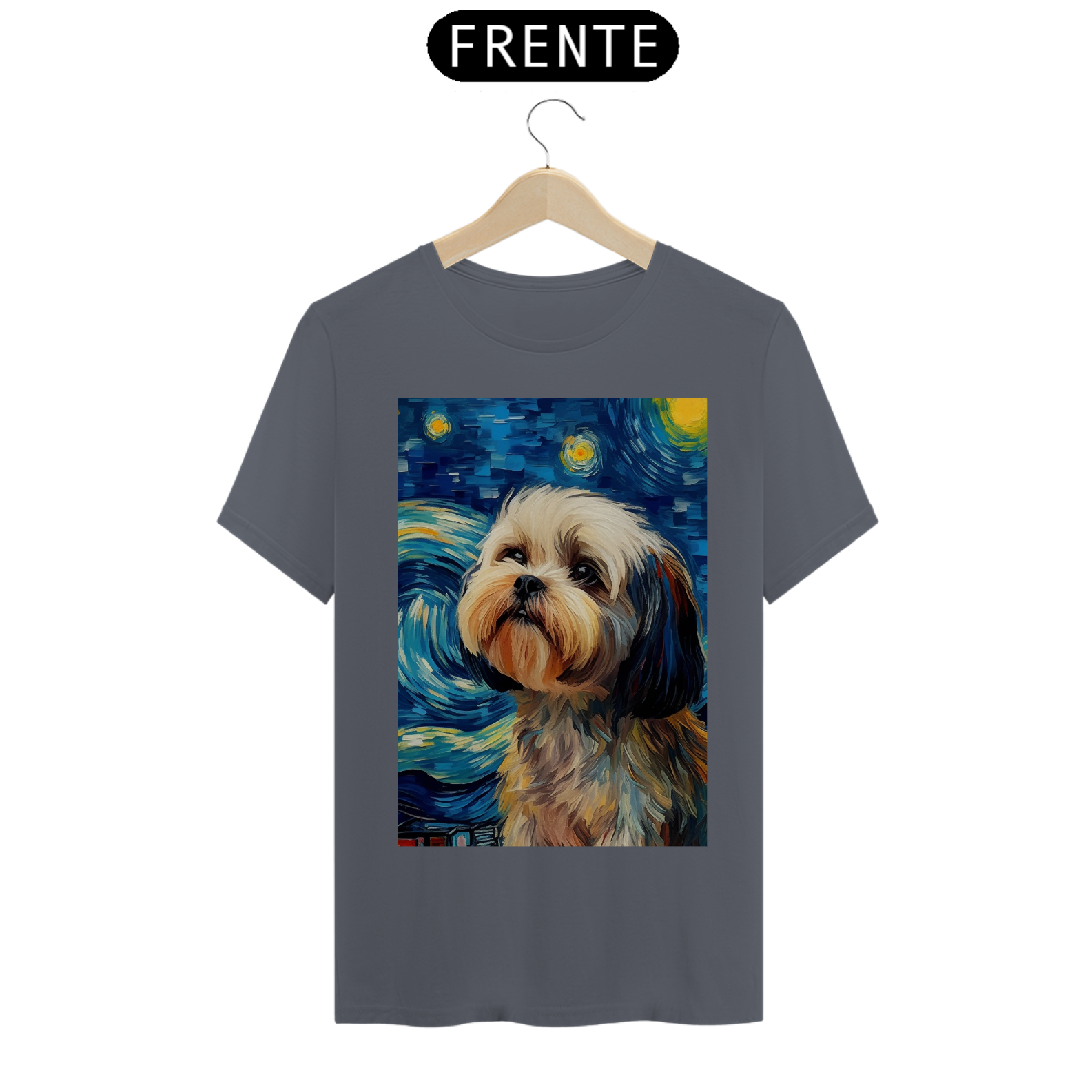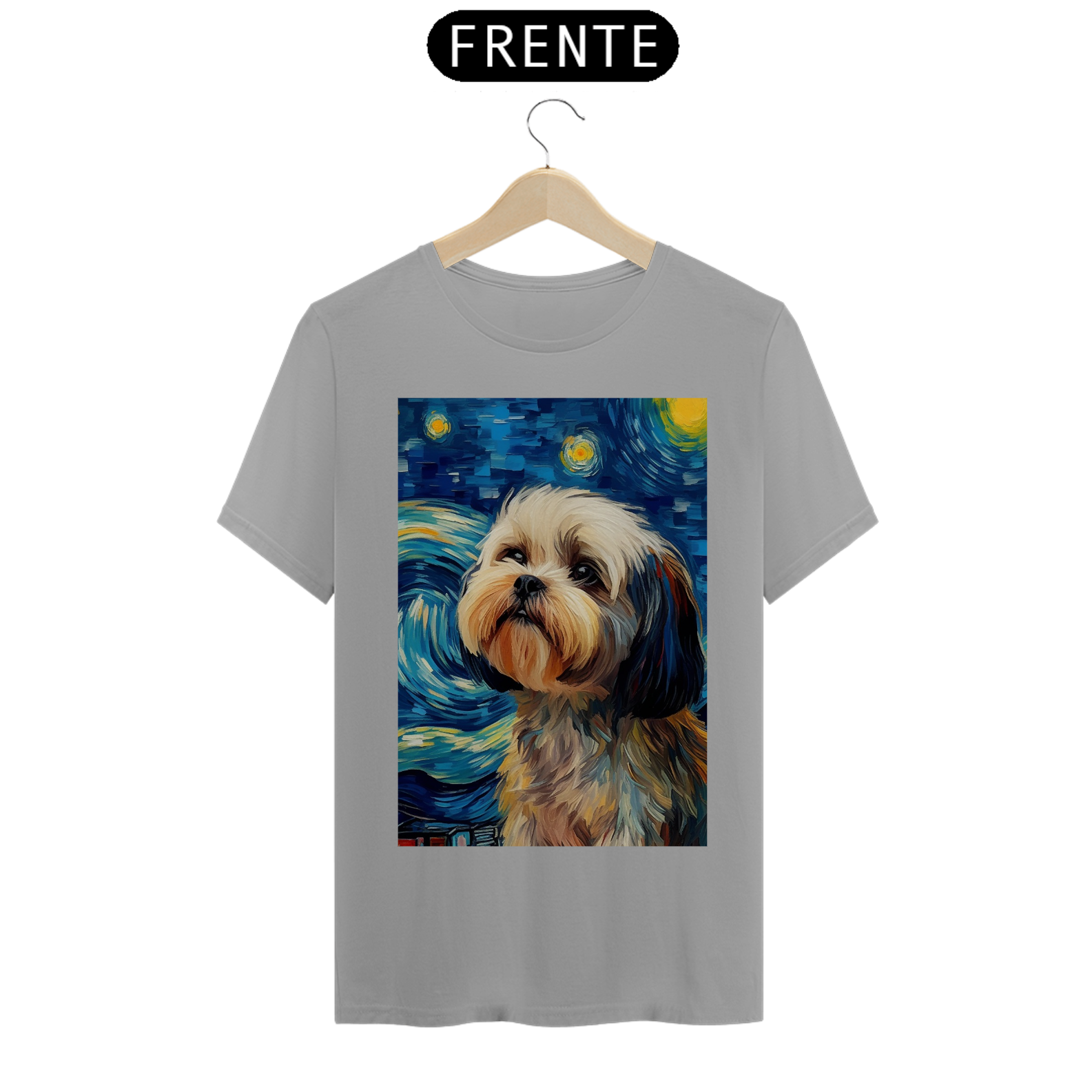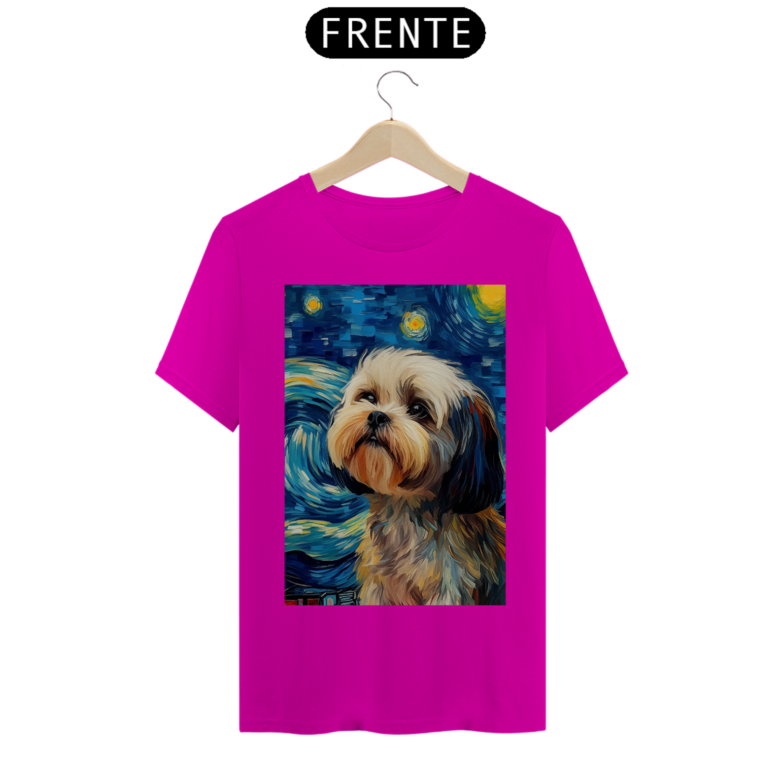 Encante-se com a doçura e a serenidade do "Shih Tzu na Noite Estrelada" com esta camiseta encantadora. Inspirada na beleza majestosa da raça Shih Tzu e na célebre obra "Noite Estrelada" de Van Gogh, esta peça de vestuário combina a graciosidade do animal com a expressividade artística. Sob um céu estrelado e redemoinhos de cor, um Shih Tzu adorável é imortalizado, criando uma visão celestial e encantadora. Vista esta camiseta para levar consigo a beleza da amizade canina e a magia artística de Van Gogh em uma fusão única de estilo e inspiração. "Shih Tzu na Noite Estrelada" é mais do que uma peça de roupa; é uma homenagem à doçura dos animais de estimação e à atemporalidade da arte.