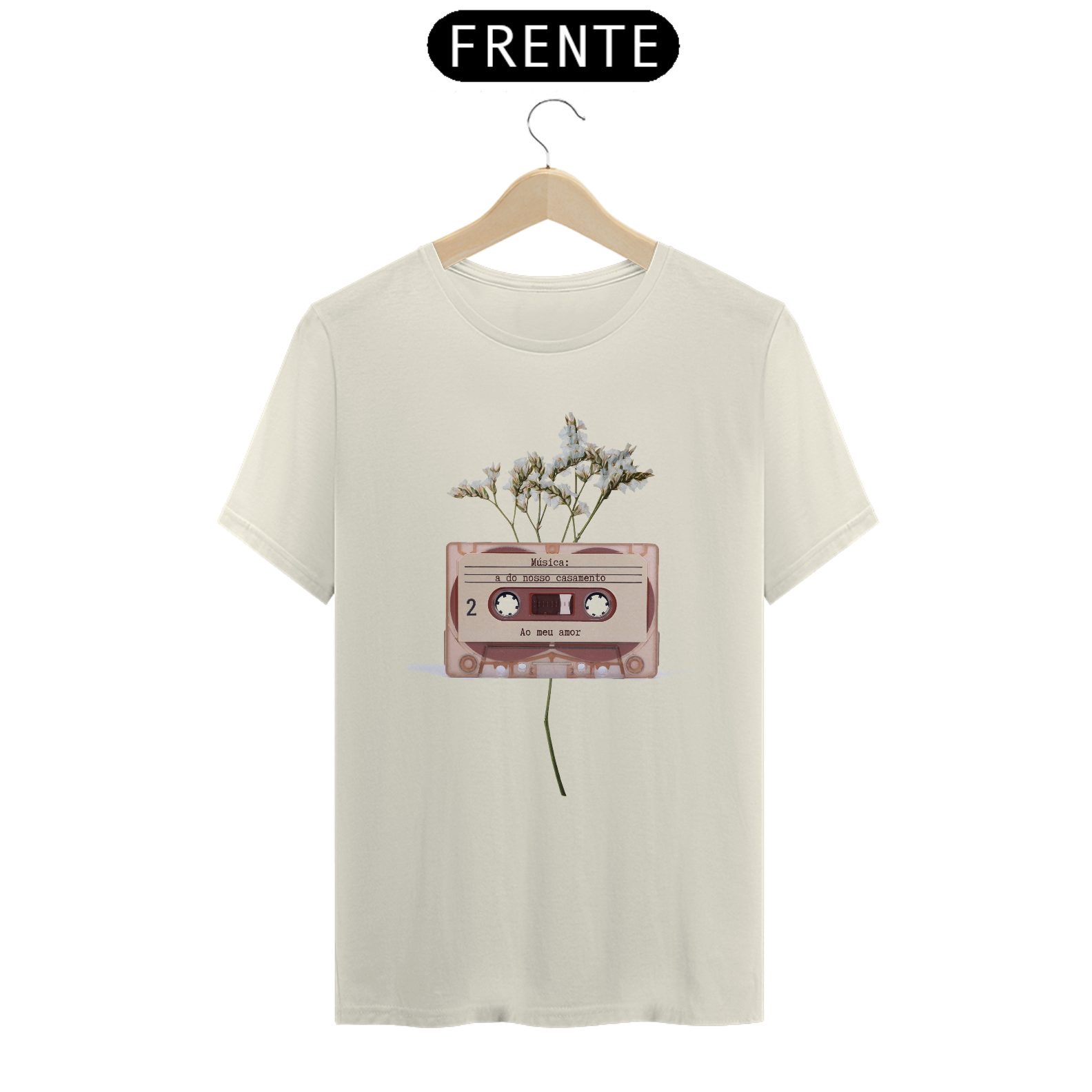 Uma fita cassete vintage adornada com flores delicadas remete à nostalgia e ao amor atemporal. A frase escrita, “Música: a do nosso casamento”, celebra momentos inesquecíveis gravados não só em fitas, mas no coração. Transforme suas memórias em arte que inspira e emociona.