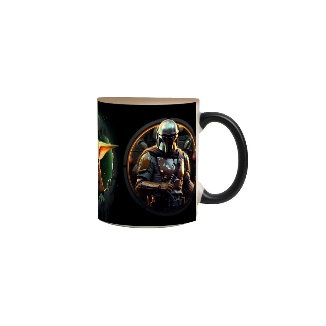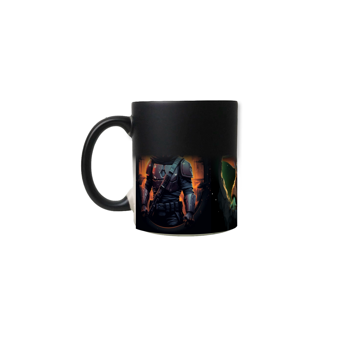 Revelação Mágica: Quando preenchida com uma bebida quente, a caneca revela uma imagem surpresa do Mandalorian em ação, junto com seu fiel companheiro, o Grogu (também conhecido como "Baby Yoda"). À medida que a bebida esfria, a imagem lentamente retorna ao design original, incentivando você a reviver a magia repetidas vezes.