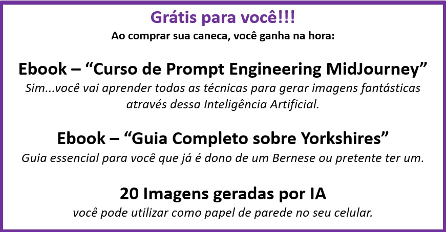 Caneca exclusiva de porcelana com arte IA. Apenas 1 unidade disponível! Ao comprar, você receberá 2 ebooks: "Tudo sobre Yorkshires" e outro te ensinando tudo sobre "Criação de Imagens com IA", além de 2 papéis de parede para celular.