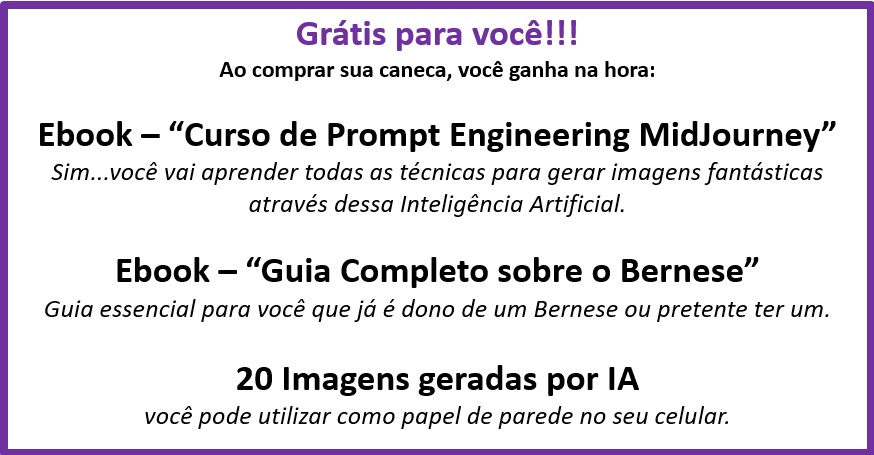 Caneca exclusiva de porcelana com arte IA. Apenas 1 unidade disponível! Ao comprar, você receberá 2 ebooks: "Tudo sobre o Bernese" e outro te ensinando tudo sobre "Criação de Imagens com IA", além de 2 papéis de parede para celular.