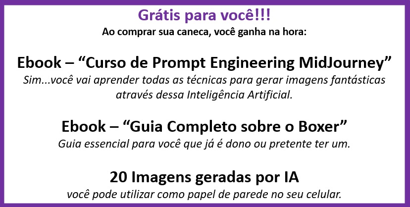Caneca exclusiva de porcelana com arte IA. Apenas 1 unidade disponível! Ao comprar, você receberá 2 ebooks: "Tudo sobre Boxers" e outro te ensinando tudo sobre "Criação de Imagens com IA", além de 2 papéis de parede para celular.