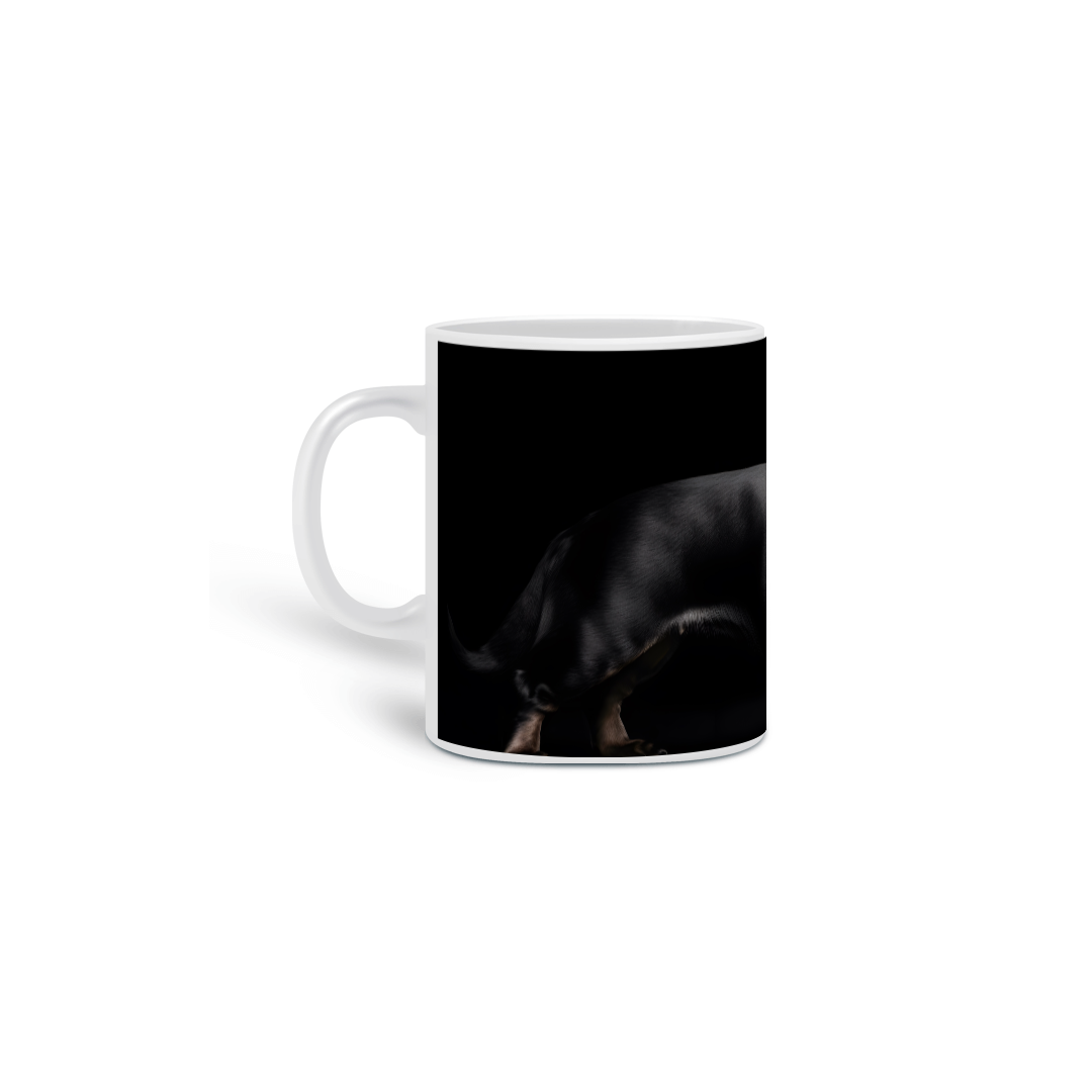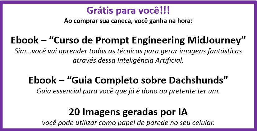 Caneca exclusiva de porcelana com arte IA. Apenas 1 unidade disponível! Ao comprar, você receberá 2 ebooks: "Tudo sobre o Dachshund(Salsicha)" e outro te ensinando tudo sobre "Criação de Imagens com IA", além de 20 papéis de parede para celular.
