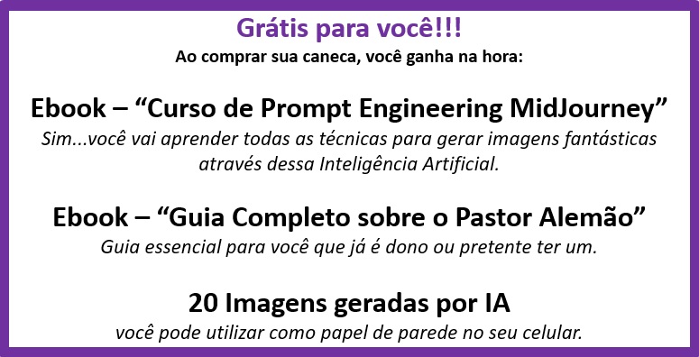 Caneca exclusiva de porcelana com arte IA. Apenas 1 unidade disponível! Ao comprar, você receberá 2 ebooks: "Tudo sobre o Pastor Alemão" e outro te ensinando tudo sobre "Criação de Imagens com IA", além de 20 papéis de parede para celular.