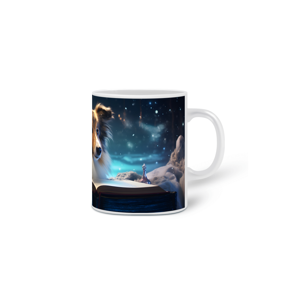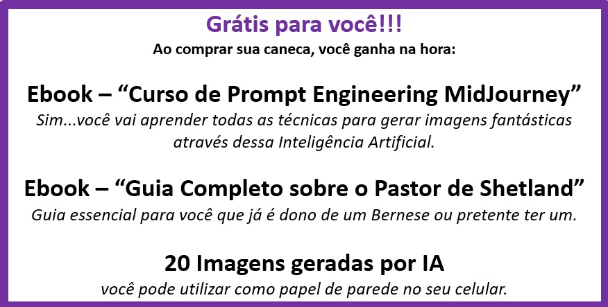 Caneca exclusiva de porcelana com arte IA. Apenas 1 unidade disponível! Ao comprar, você receberá 2 ebooks: "Tudo sobre Pastores de Shetland" e outro te ensinando tudo sobre "Criação de Imagens com IA", além de 20 papéis de parede para celular.
