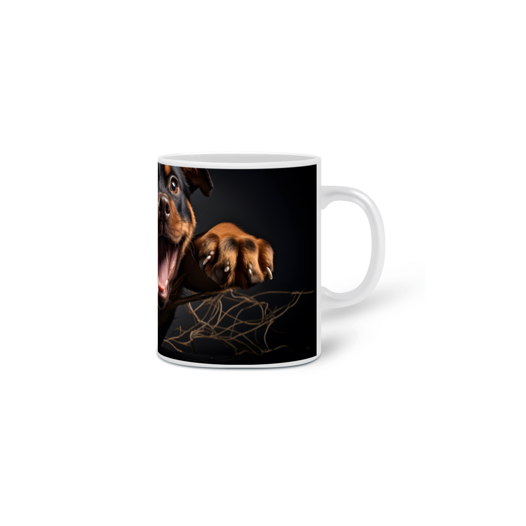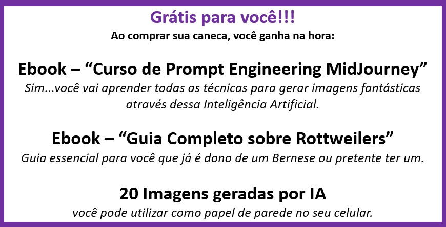 Caneca exclusiva de porcelana com arte IA. Apenas 1 unidade disponível! Ao comprar, você receberá 2 ebooks: "Tudo sobre Rottweilers" e outro te ensinando tudo sobre "Criação de Imagens com IA", além de 20 papéis de parede para celular.