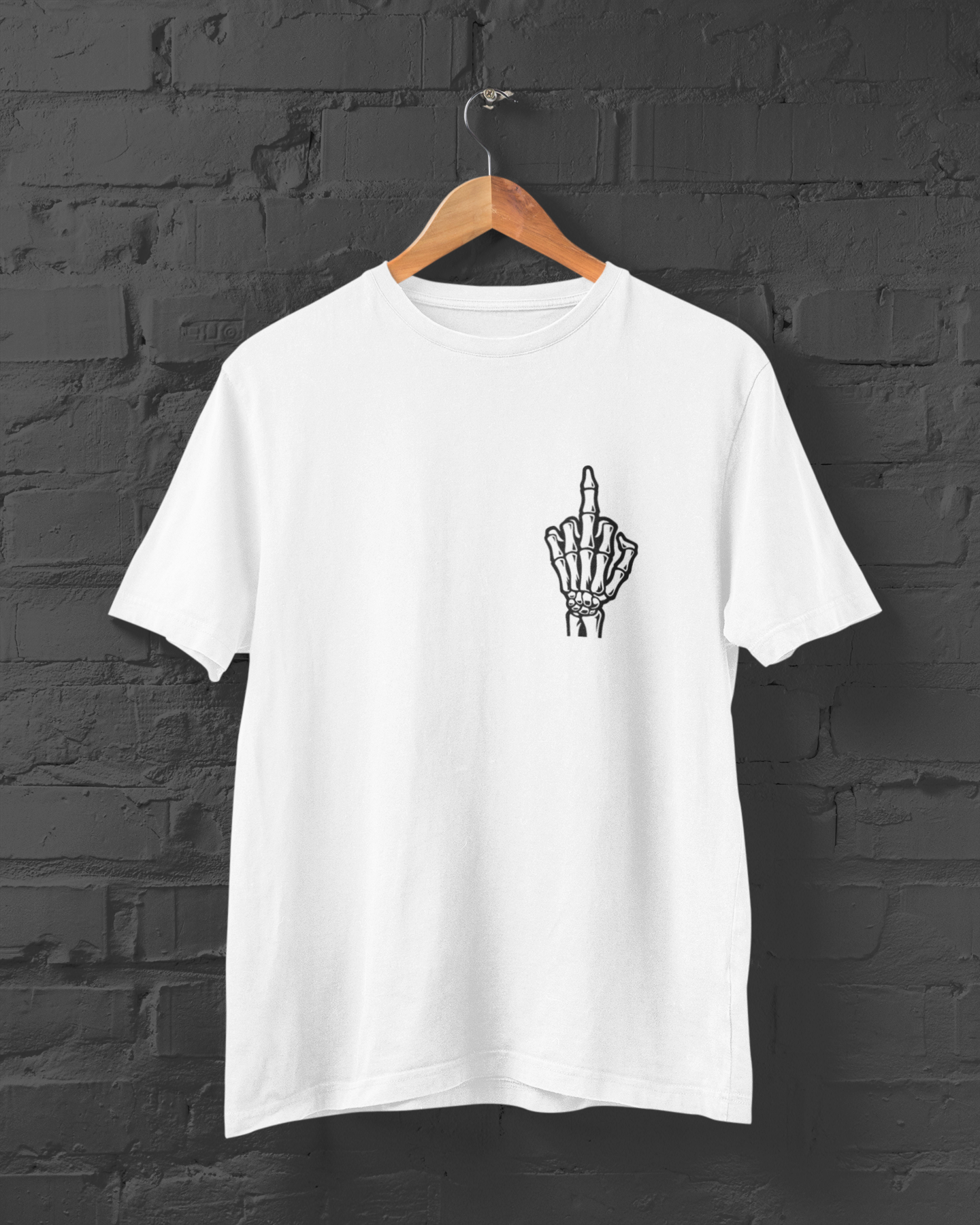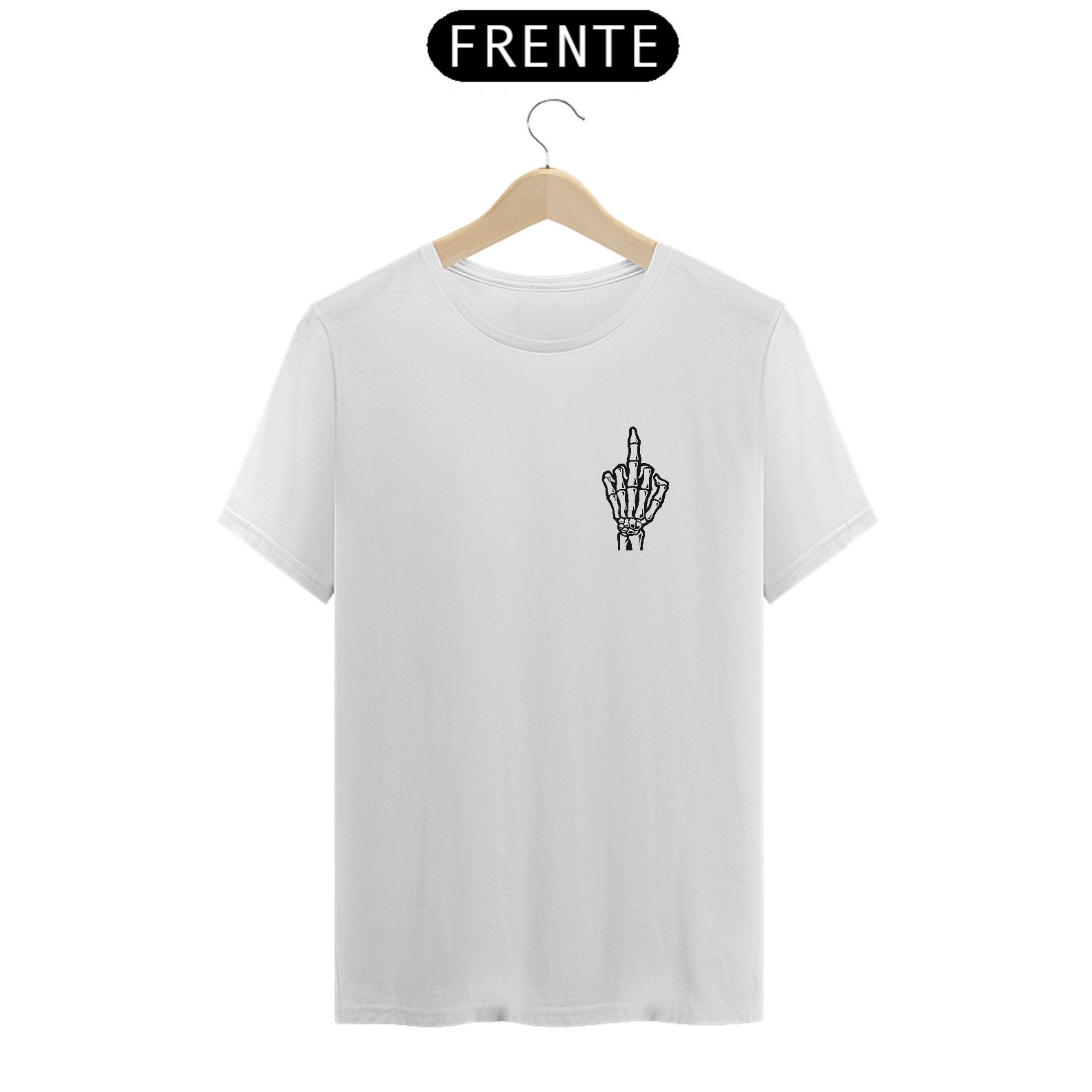 O famoso gesto universal do FO#@-SE em versão discreta. Agora em estampa de caveira para dizer sem falar o que está estagnado na garganta a muito tempo. Coloque para fora sem se exaltar, somente com o sorriso sarcástico no rosto e a felicidade no semblante de quem se libertou das amarras do falso senso de comportamento comum.