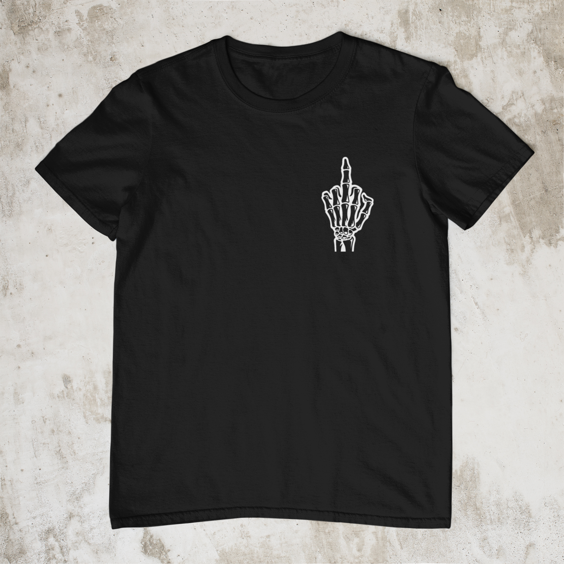 O famoso gesto universal do FO#@-SE em versão discreta. Agora em estampa de caveira para dizer sem falar o que está estagnado na garganta a muito tempo. Coloque para fora sem se exaltar, somente com o sorriso sarcástico no rosto e a felicidade no semblante de quem se libertou das amarras do falso senso de comportamento comum.