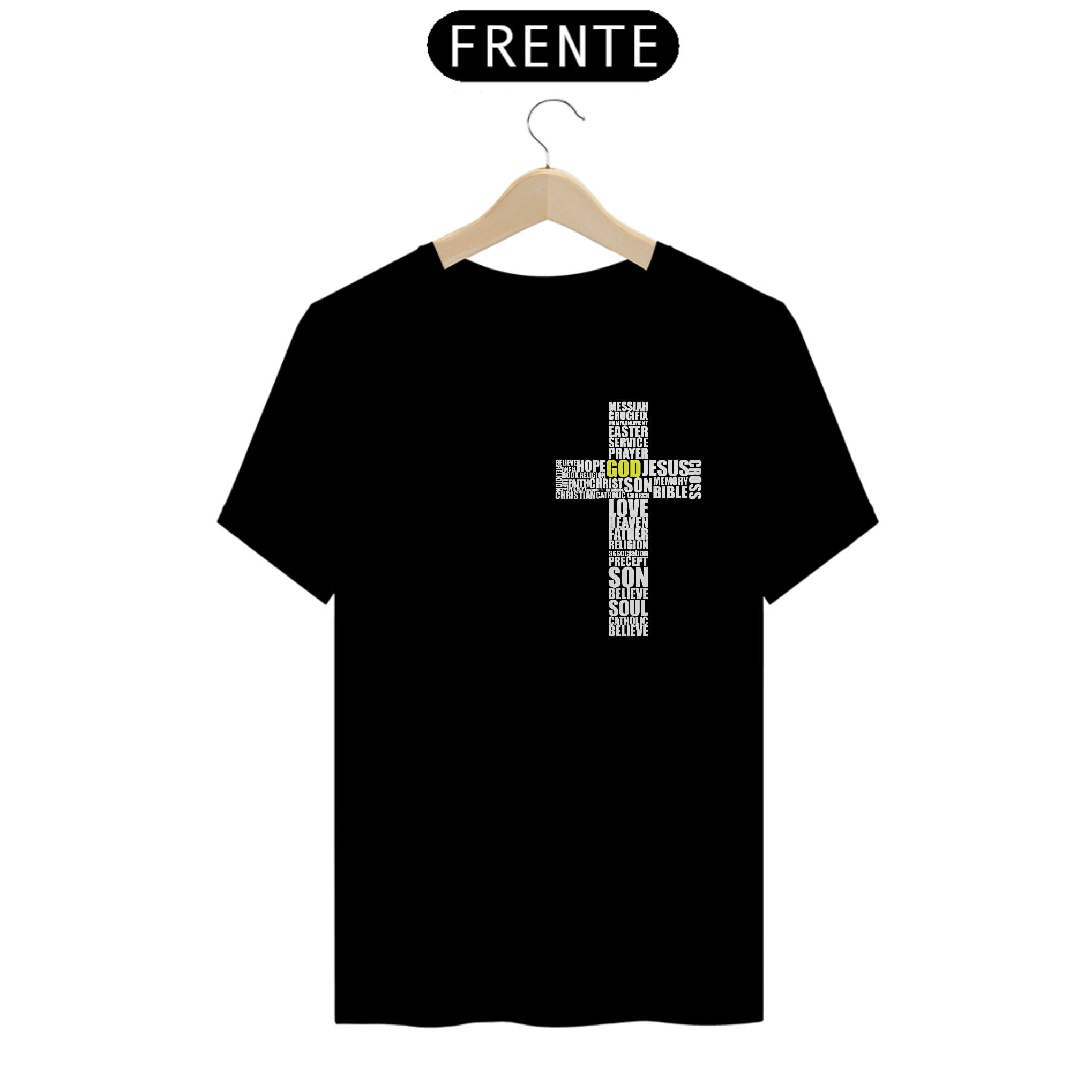 O fundo preto intensifica o impacto de cada termo, destacando-os como joias incrustadas no tecido, criando uma representação poderosa de Cristo. Esta camiseta não é só um item de moda; é uma declaração de fé ousada e expressiva, um convite para refletir sobre sua jornada espiritual.