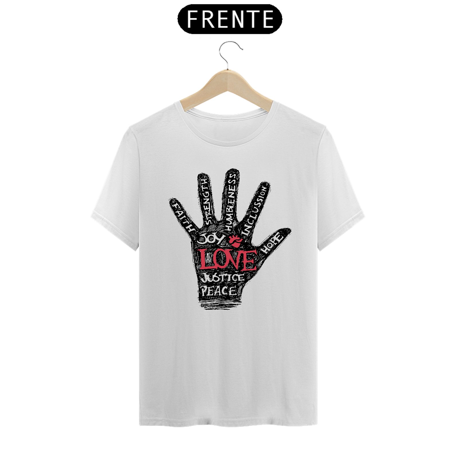 Envolva-se com os valores que mais importam com nossa camiseta premium. Este design exclusivo reúne palavras inspiradoras como Faith (Fé), Joy (Alegria), Strength (Força), Humbleness (Humildade), Inclusion (Inclusão), Hope (Esperança), Justice (Justiça) e Peace (Paz), criando uma peça de vestuário que não apenas expressa estilo, mas também carrega um poderoso significado.