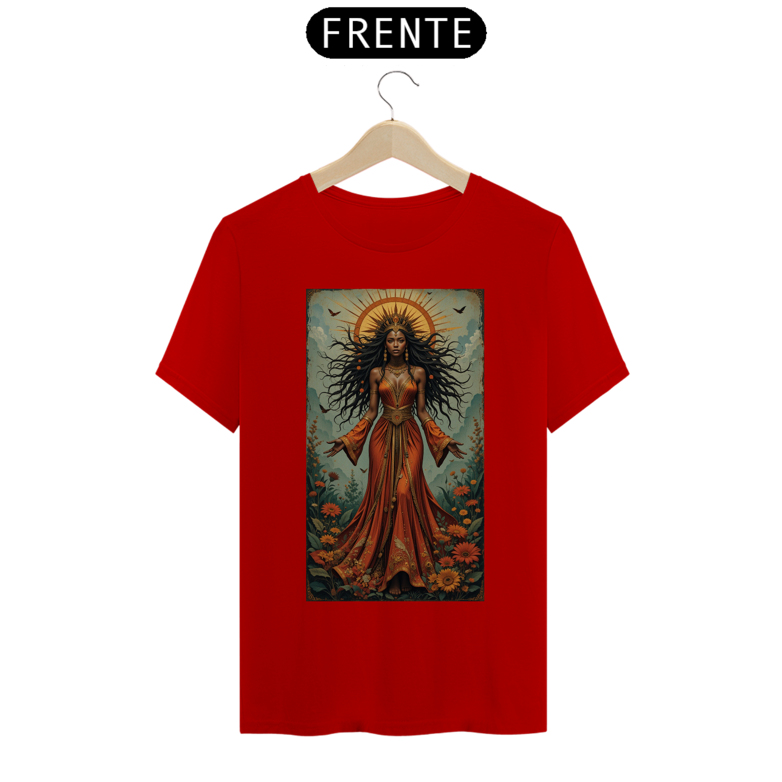 Esta estampa celebra Iansã, senhora dos raios, dos trovões e das mudanças. Sagrada por natureza, ela é a força feminina que gira, enfrenta, rompe e renasce — sem pedir licença.