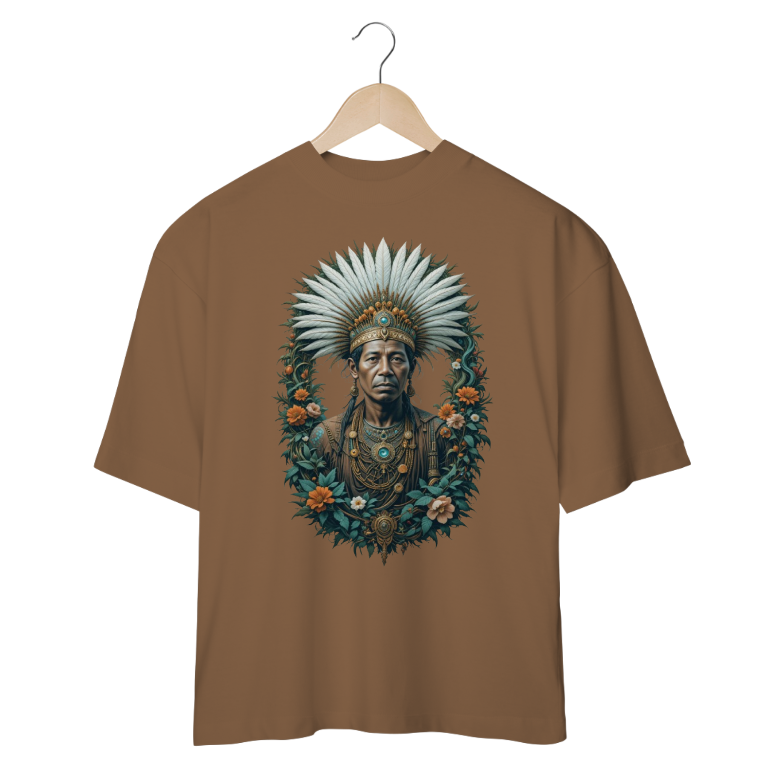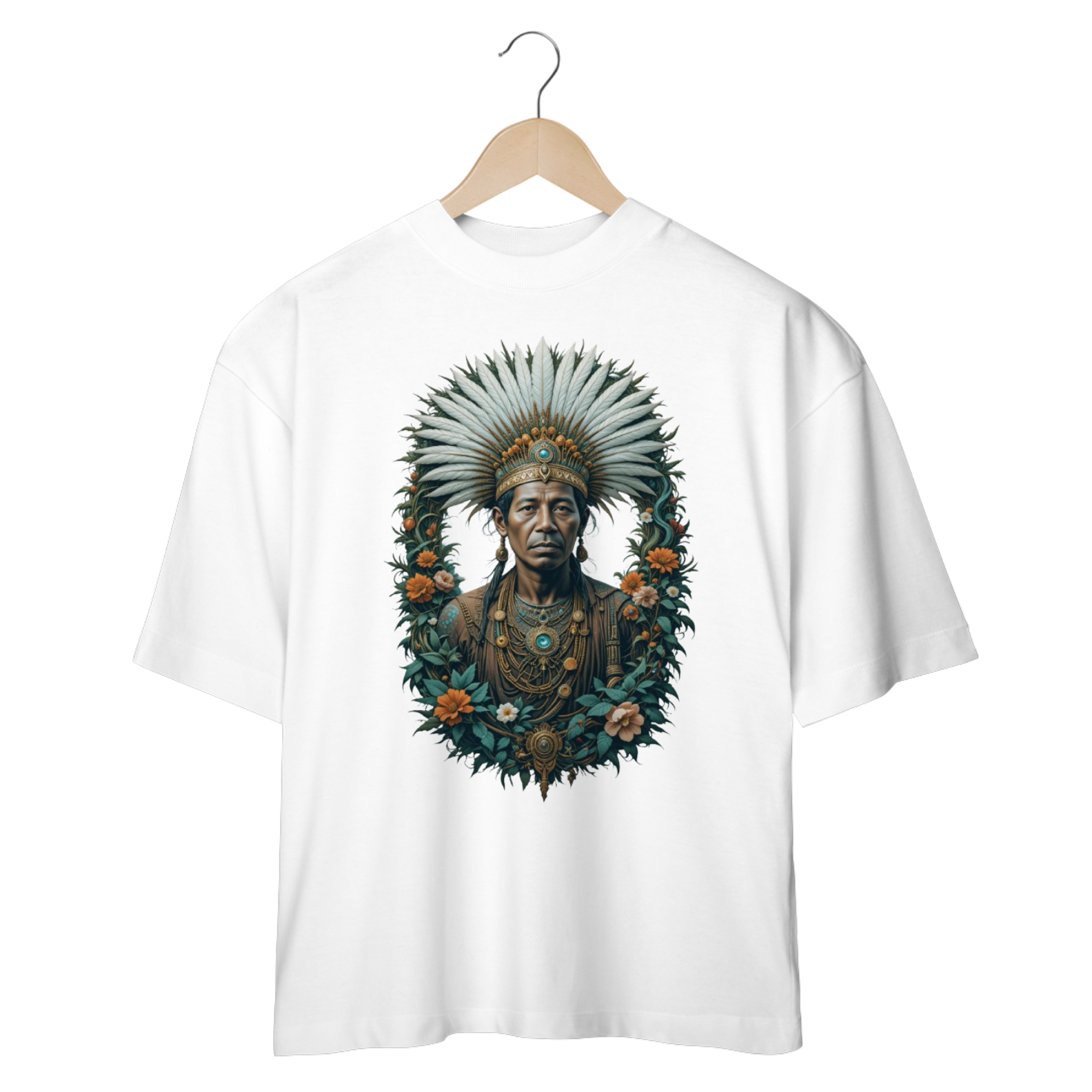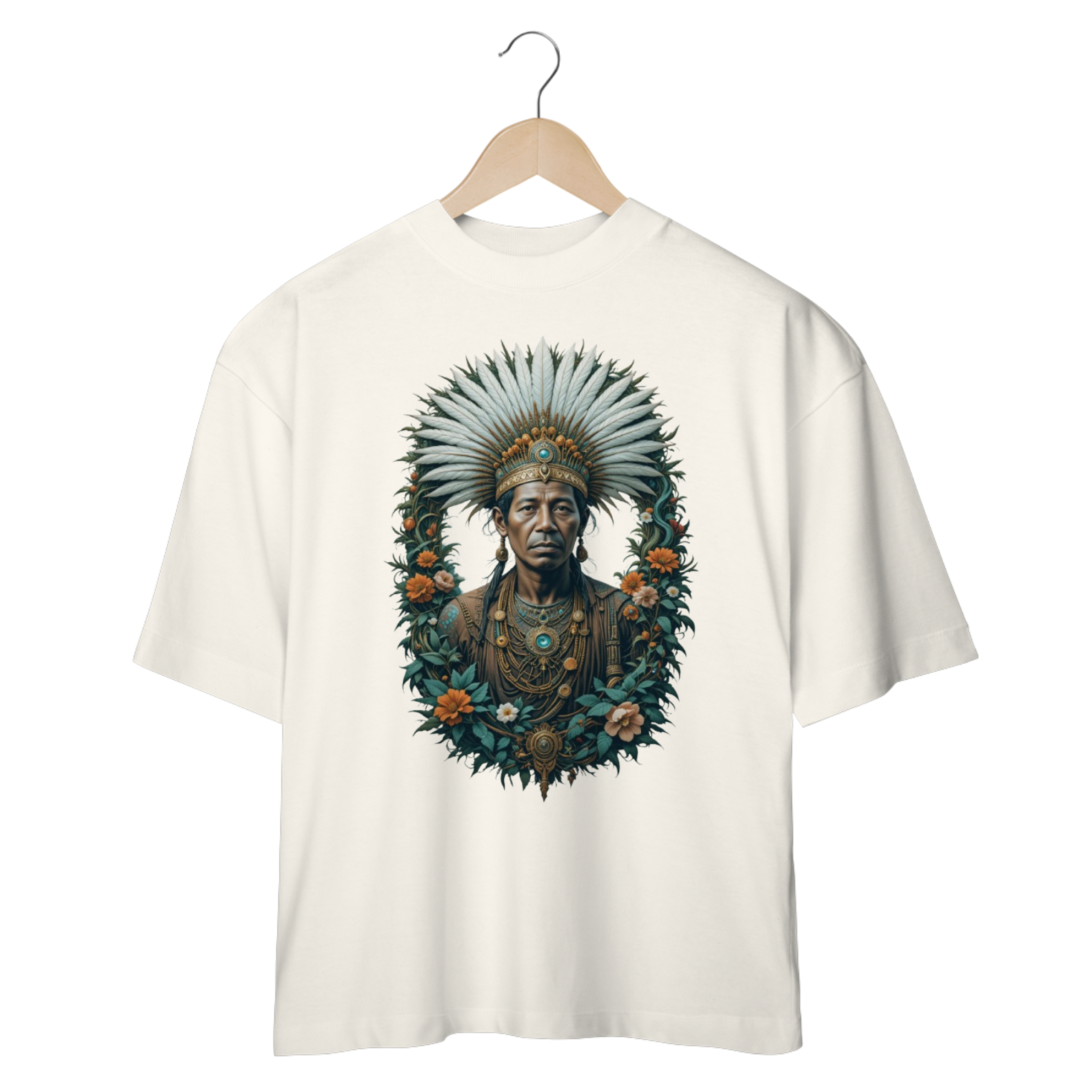 Conecte-se com a energia serena e a sabedoria profunda do Caboclo Pena Branca com nossa camiseta oversized exclusiva. Esta peça é mais do que moda; é um portal para a força da mata, a paz interior e a proteção espiritual.