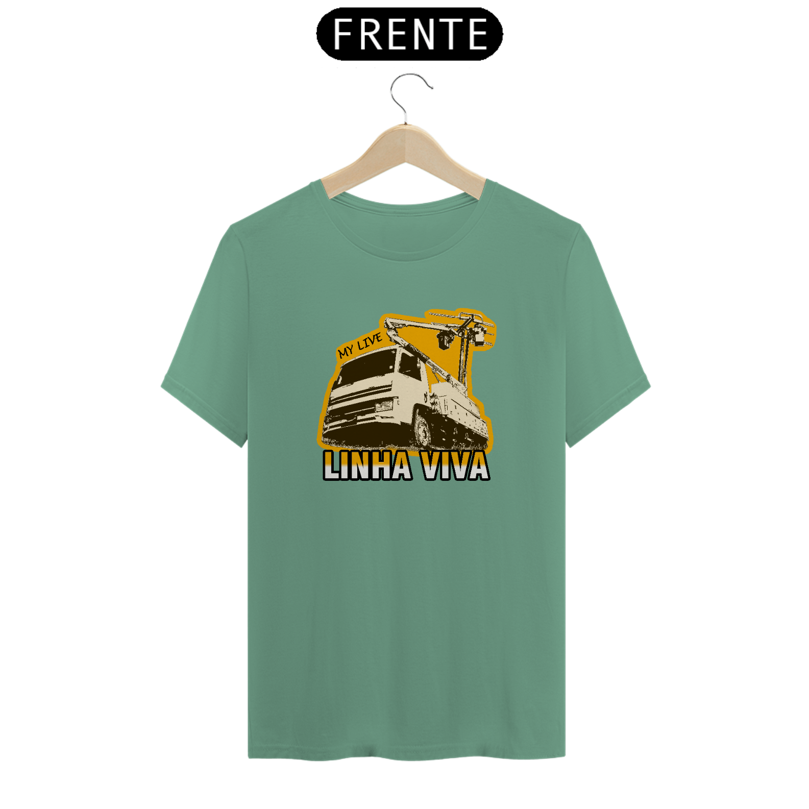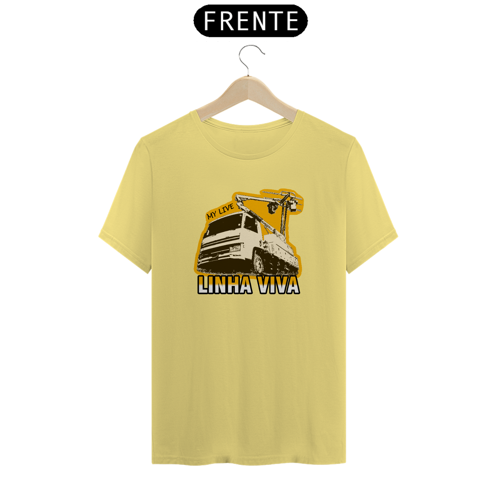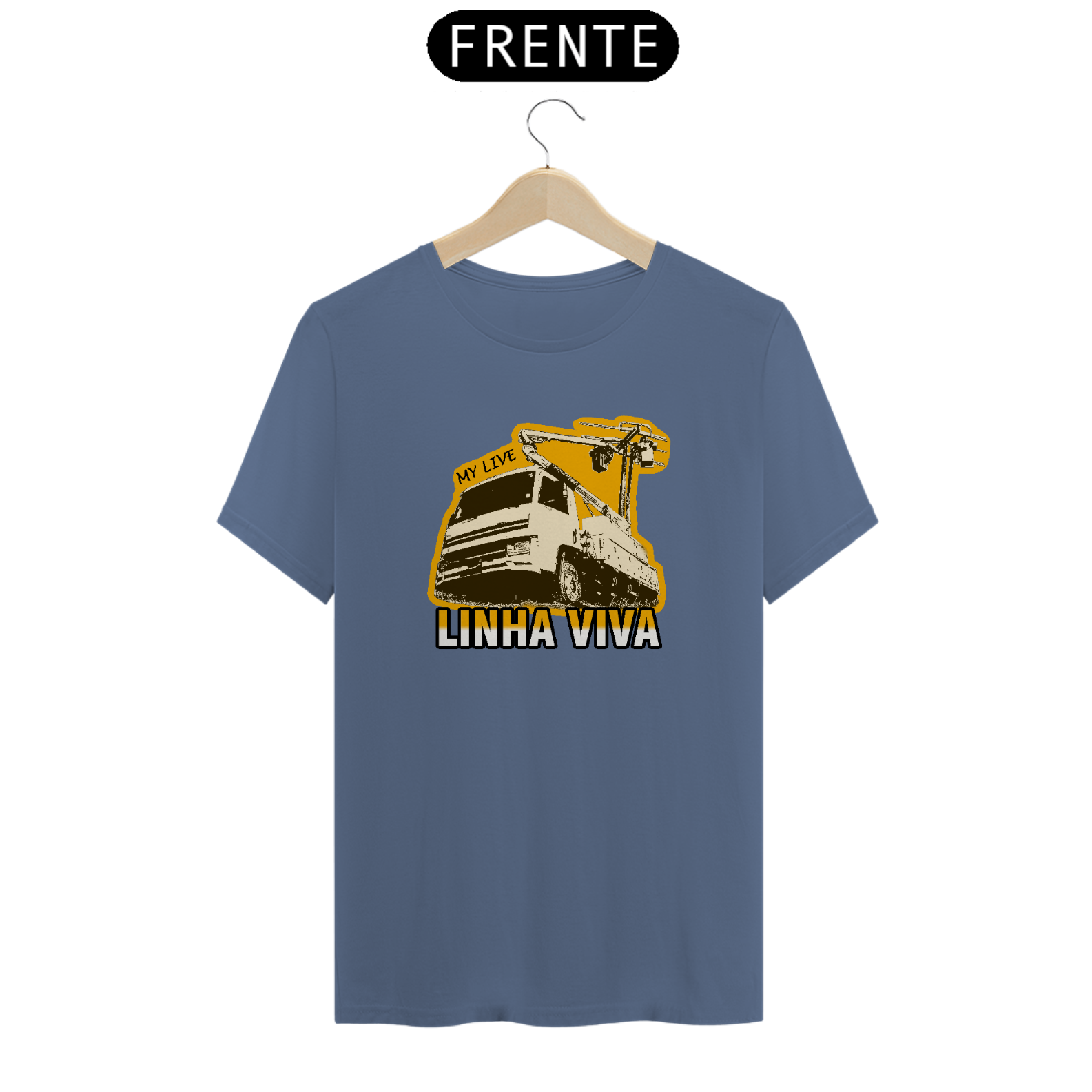 A estampa "LINHA VIVA" homenageia uma das equipes mais essenciais do setor elétrico: os profissionais que trabalham diretamente em redes de média e alta tensão energizadas. O design traz a icônica imagem de um caminhão com cesto aéreo, onde eletricistas executam seu trabalho com extrema precisão e segurança, garantindo que a energia continue fluindo sem interrupções.