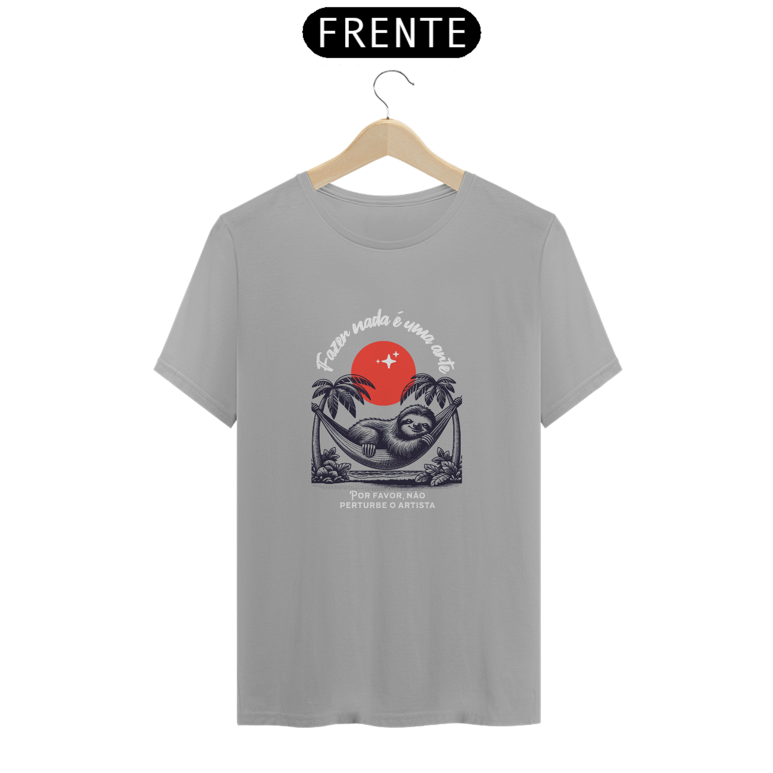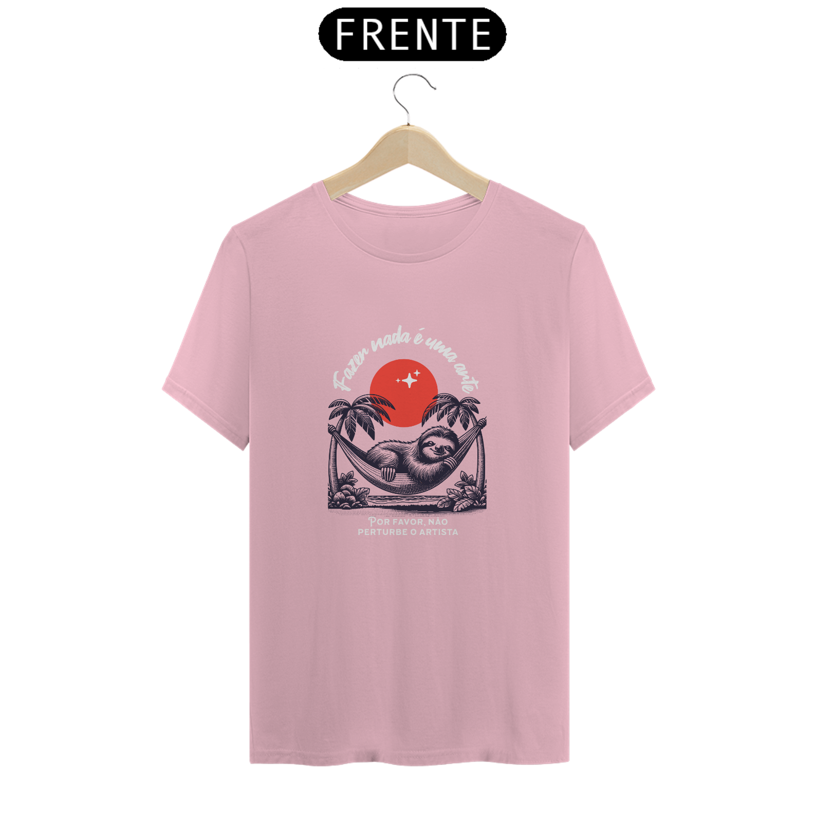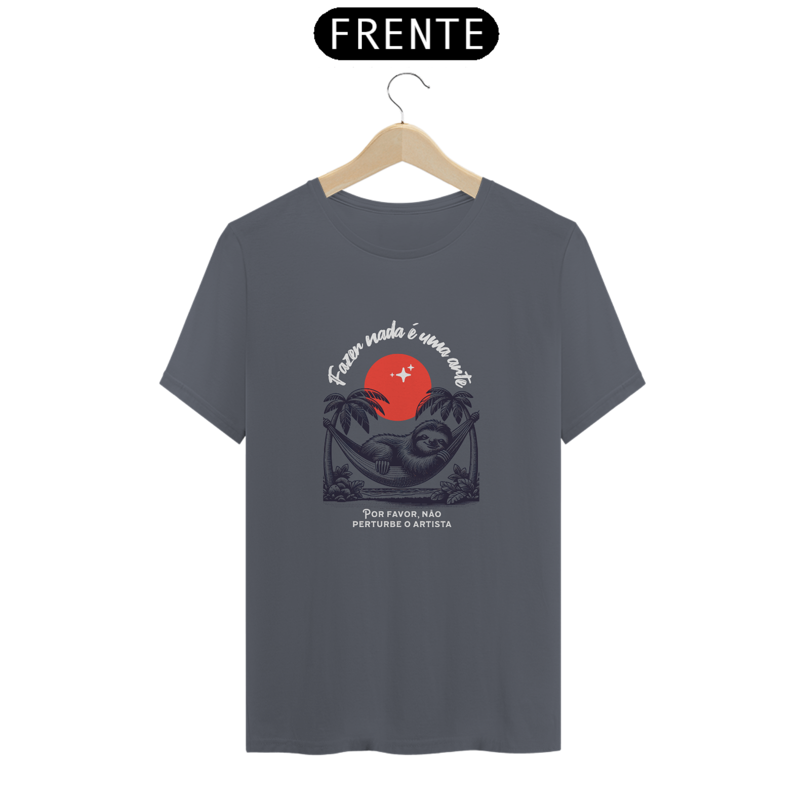 Mais do que vestir, essa camiseta é um manifesto. A estampa traz um bicho-preguiça relaxando na rede sob o pôr do sol, com a frase "Fazer nada é uma arte" e o toque irônico: "Por favor, não perturbe o artista".