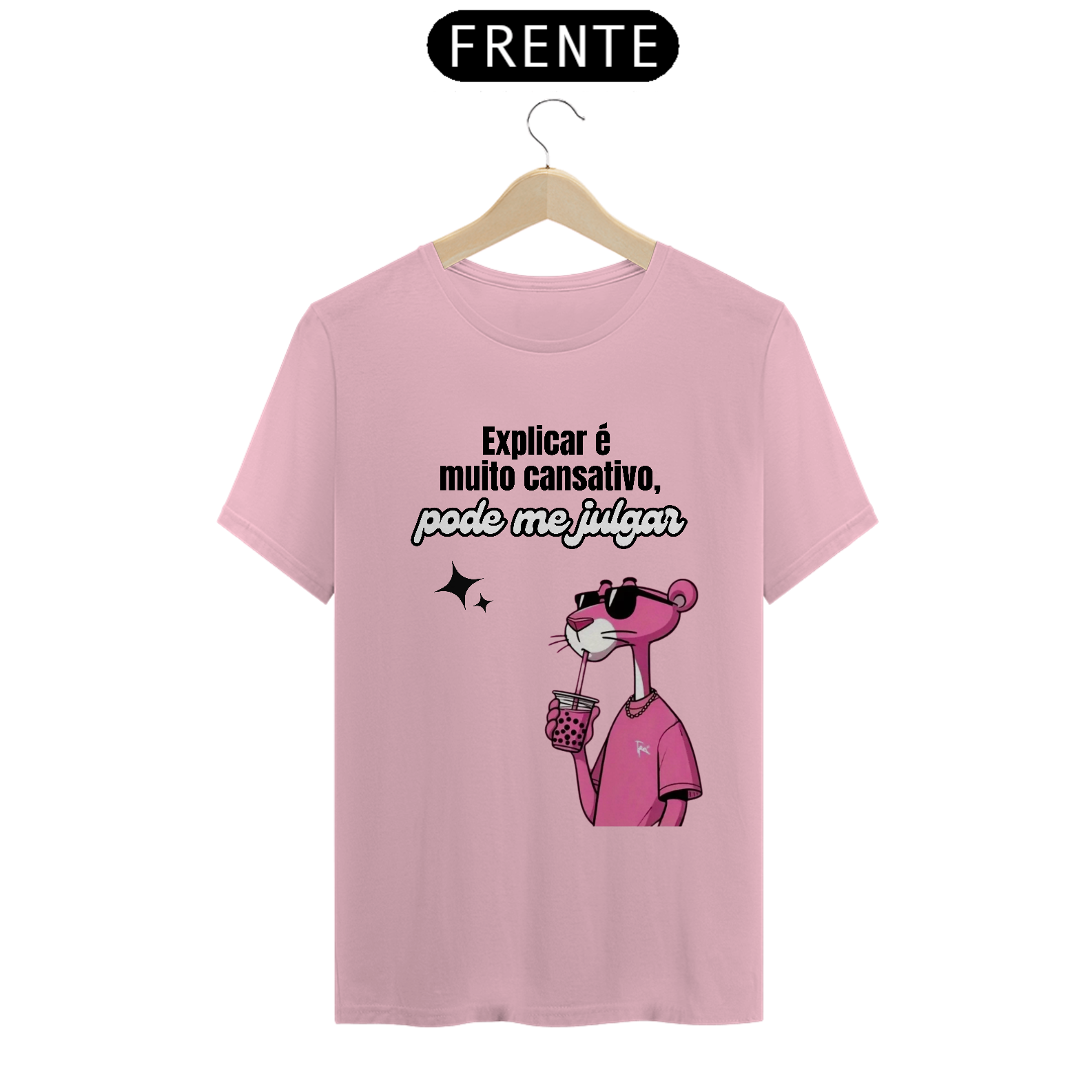 Atitude e estilo em uma só peça! Com a icônica Pantera Cor-de-Rosa e a frase “Explicar é muito cansativo, pode me julgar”, essa camiseta é perfeita para quem não tem paciência pra dar satisfação e prefere viver no próprio ritmo. Feita com tecido leve e confortável, ela une humor e personalidade com um toque retrô-pop. Use e abuse do seu direito de ser incompreendida com charme!