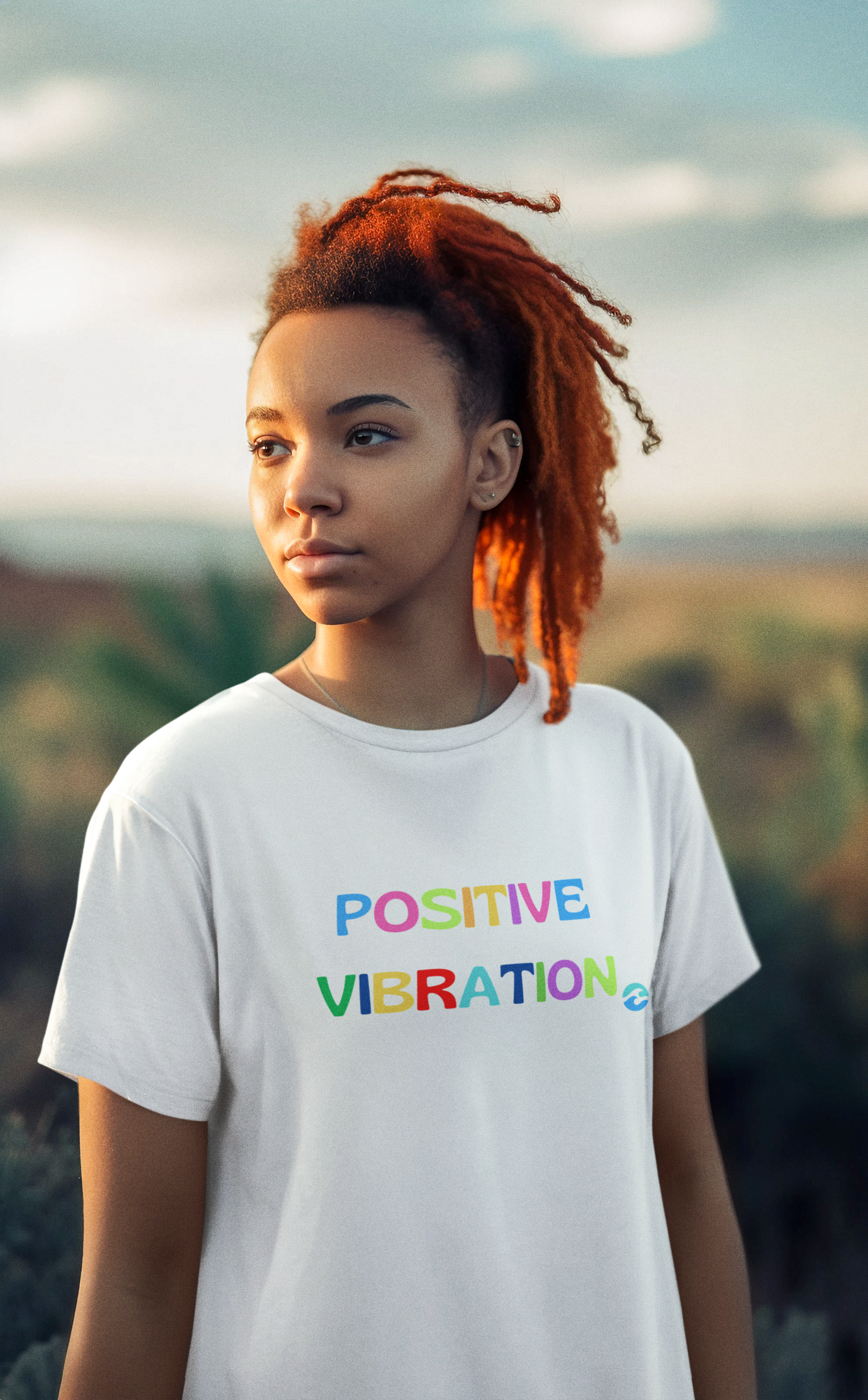 Espalhe boas energias por onde for com nossa t-shirt "Positive Vibration"! Com um toque de cor e alegria, essa peça é perfeita para quem acredita no poder das vibrações positivas.