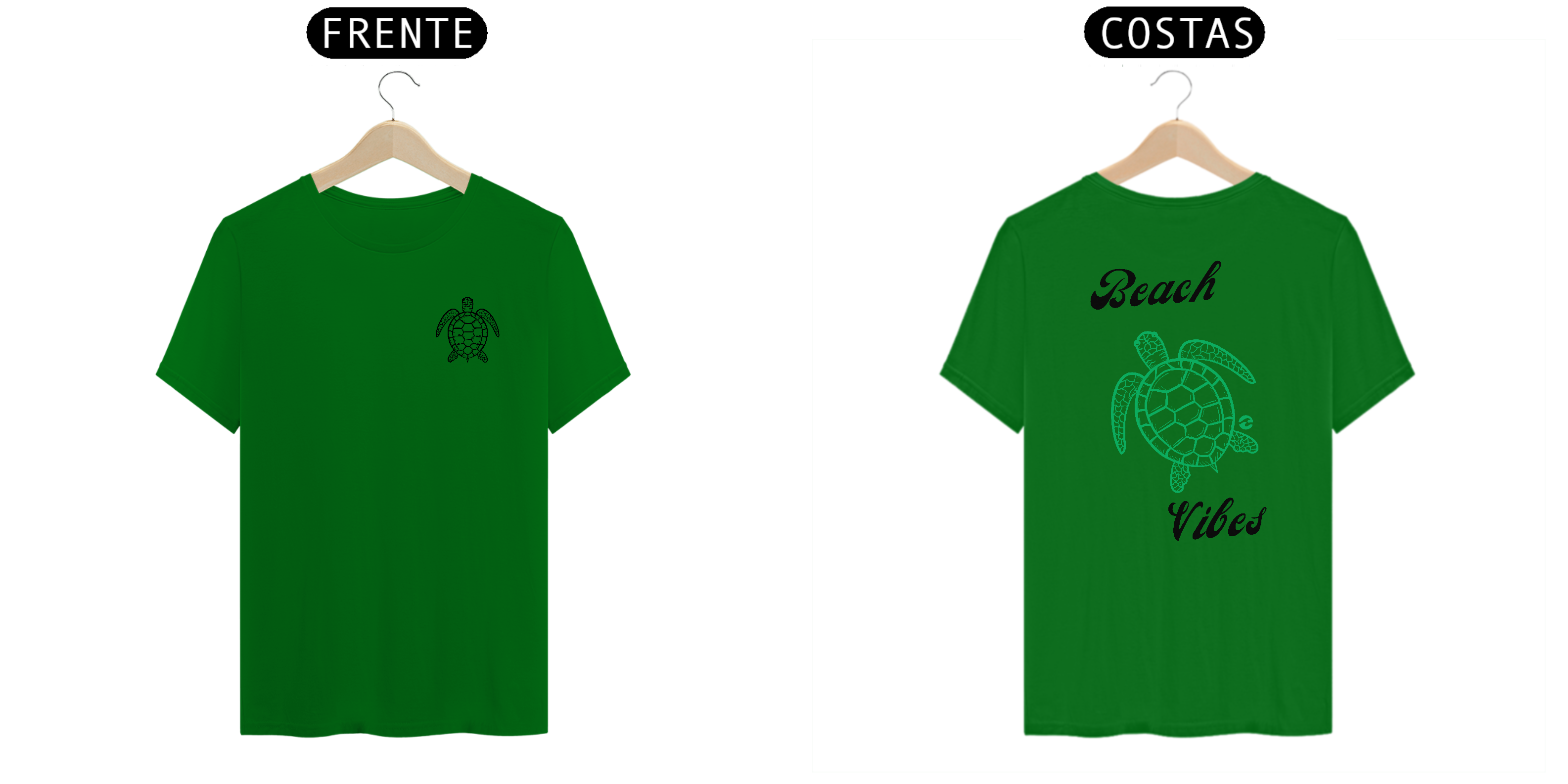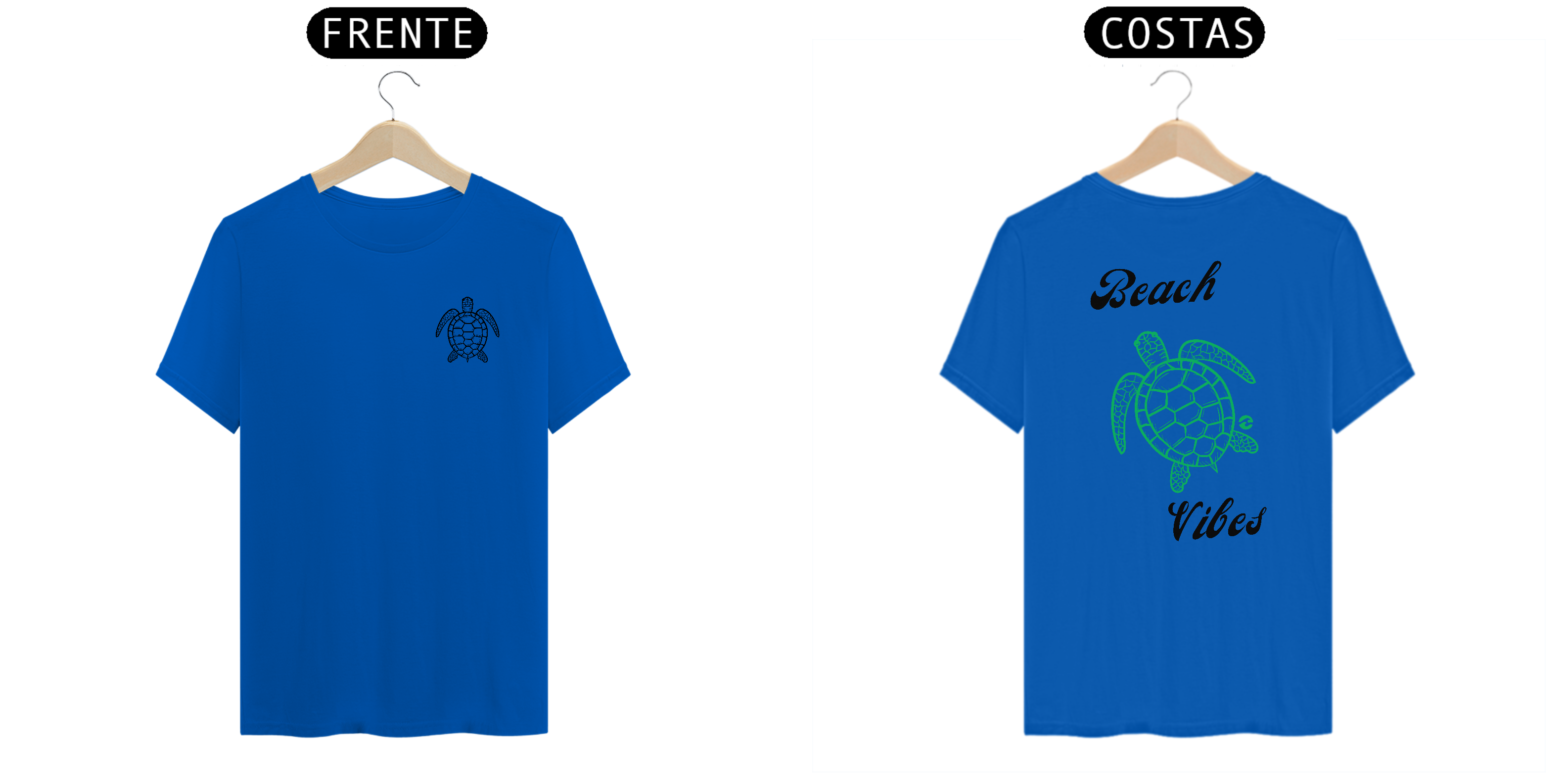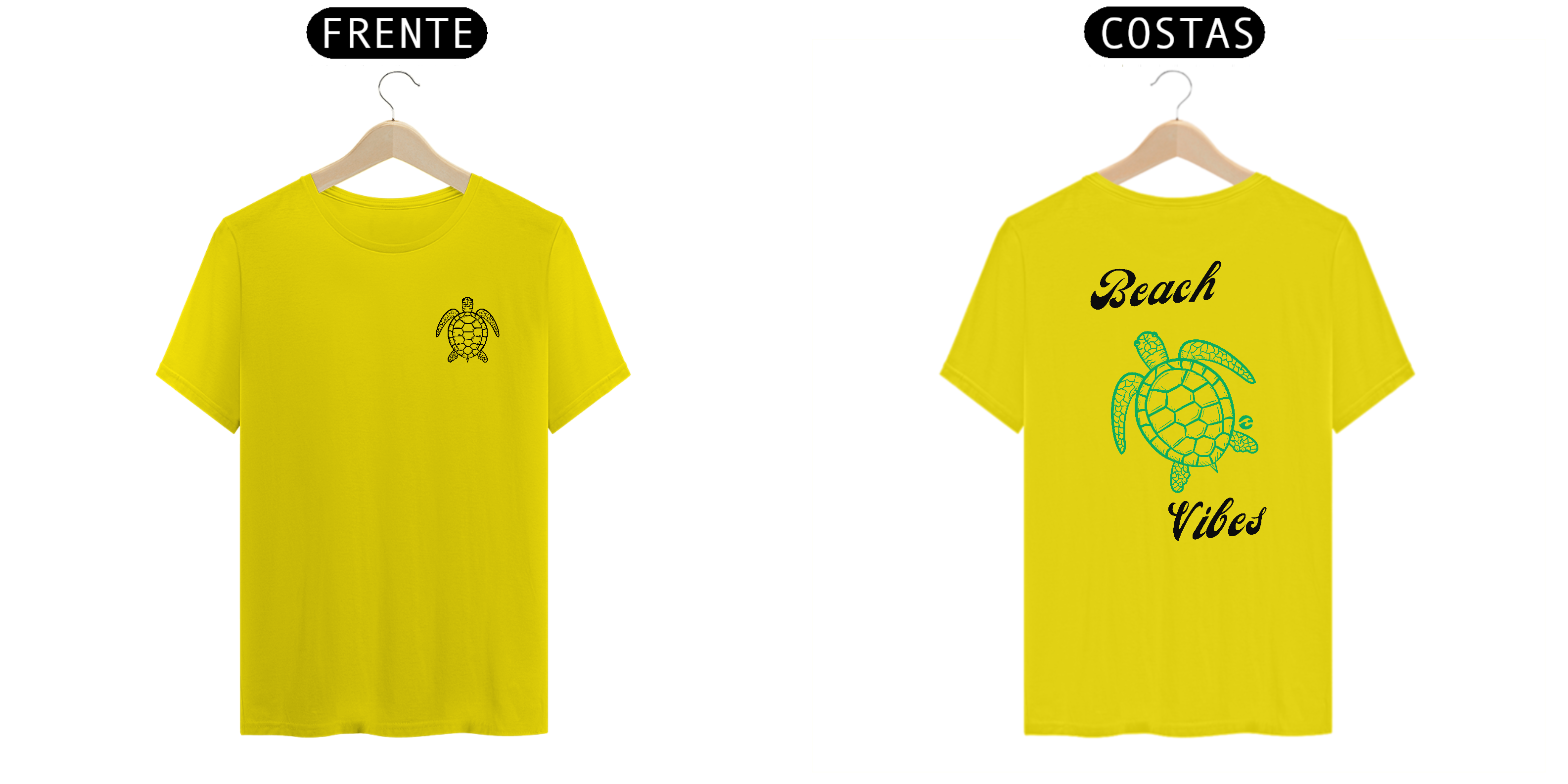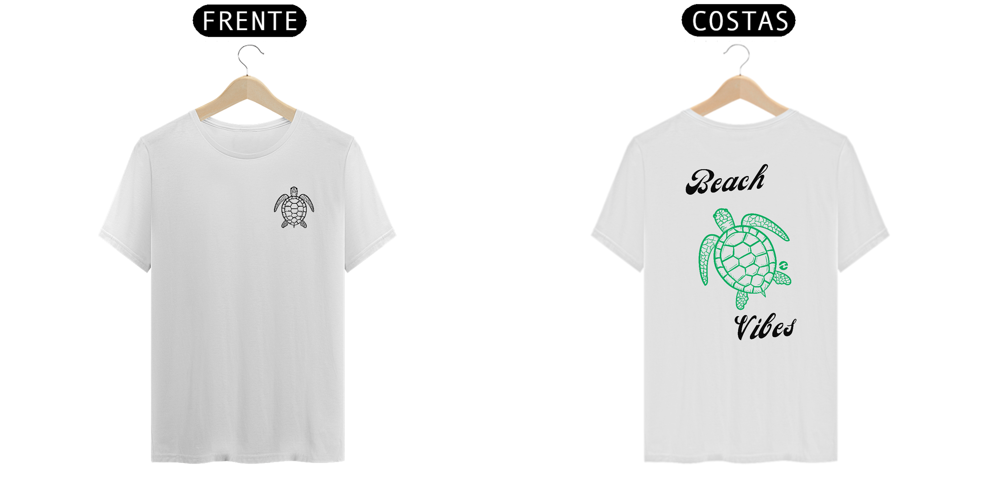 • Estampa na Frente e Costas: Na frente, uma pequena tartaruga marinha representa o toque sutil da peça. Nas costas, a mesma tartaruga em tamanho maior junto com a frase "Beach Vibes" destaca a vibe relaxante da praia.