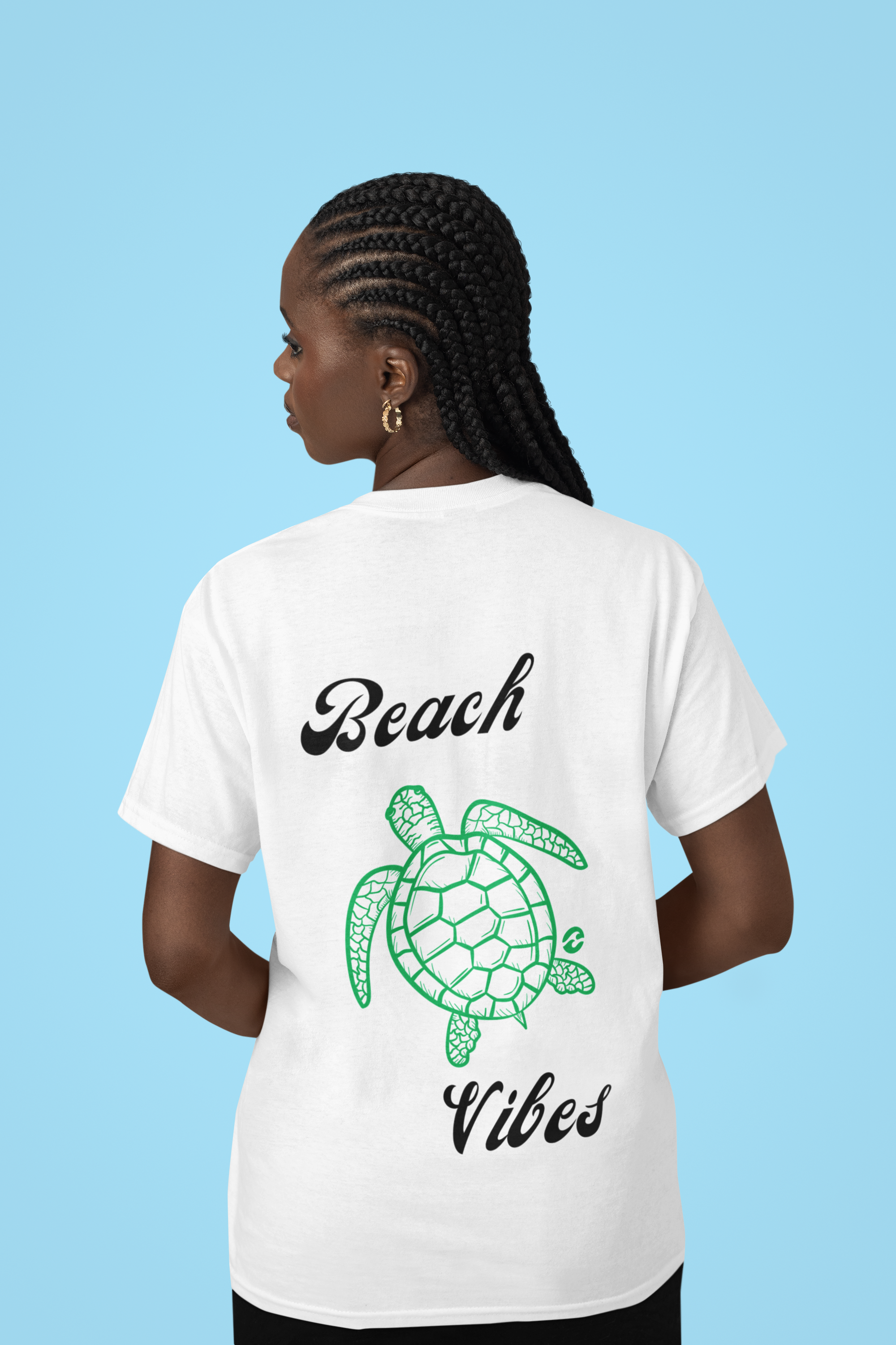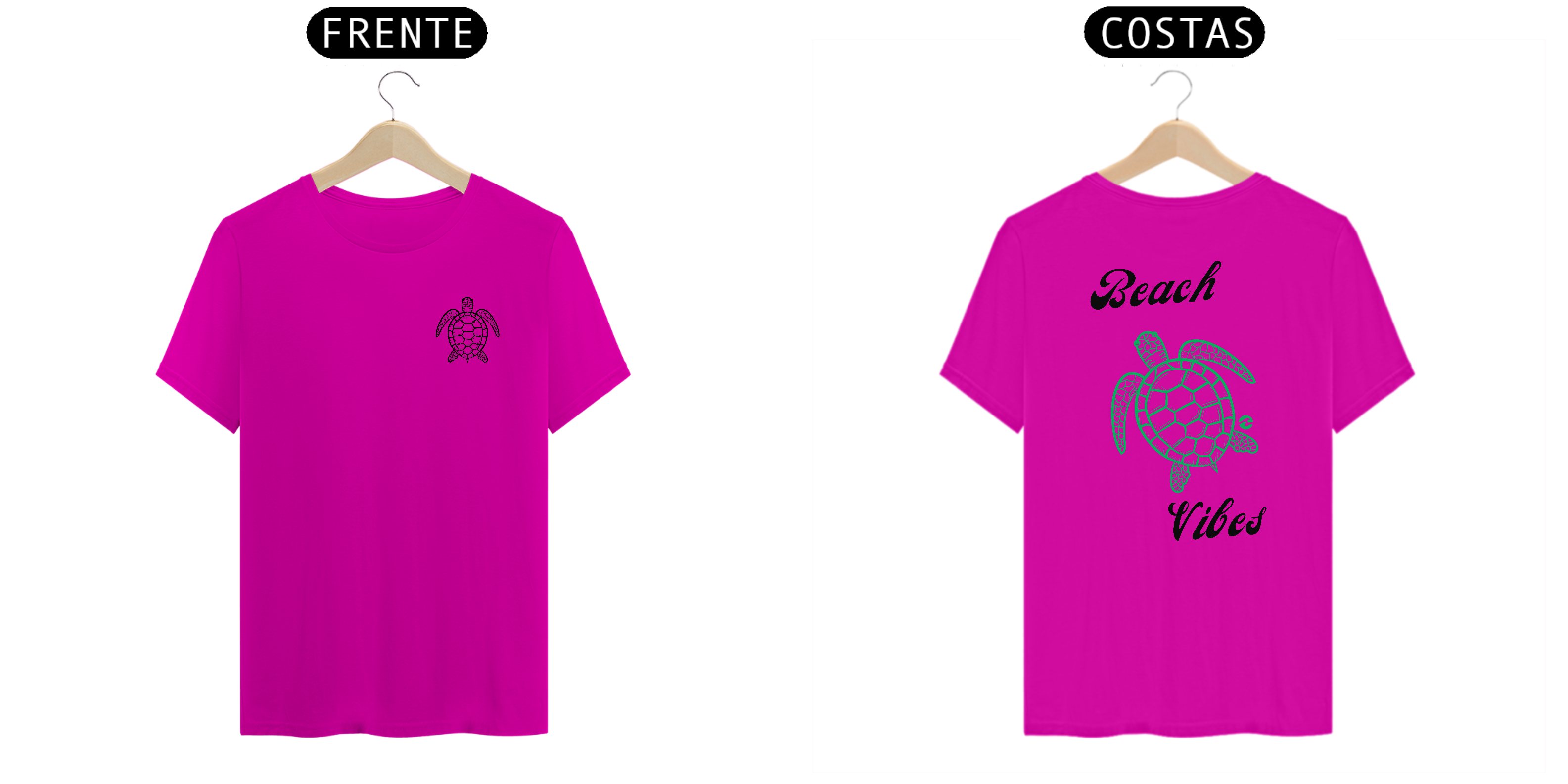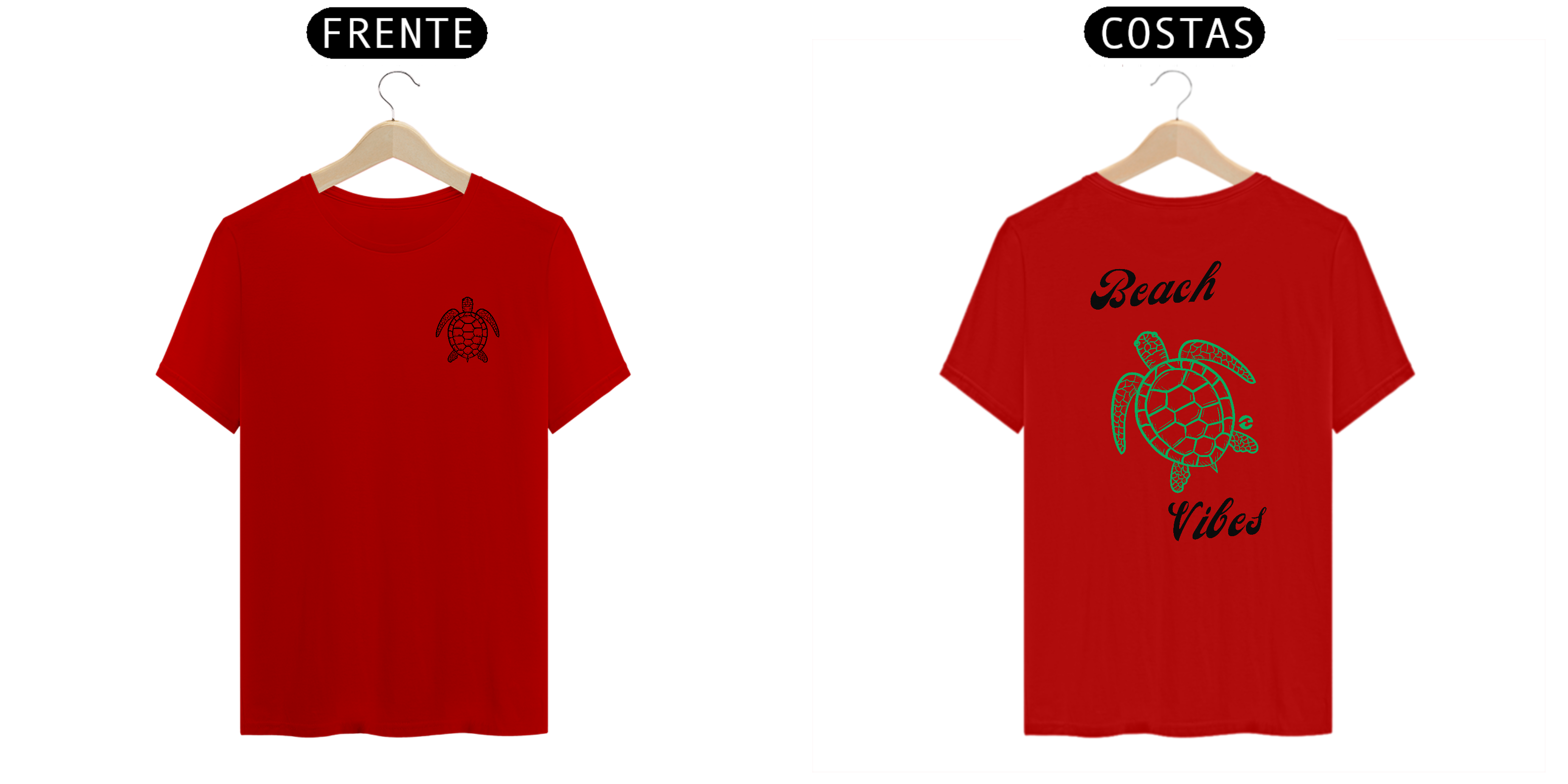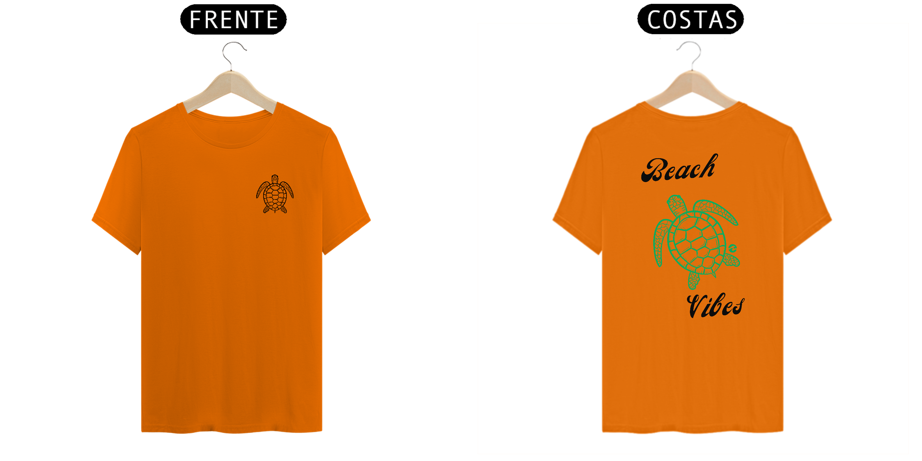• Estampa na Frente e Costas: Na frente, uma pequena tartaruga marinha representa o toque sutil da peça. Nas costas, a mesma tartaruga em tamanho maior junto com a frase "Beach Vibes" destaca a vibe relaxante da praia.