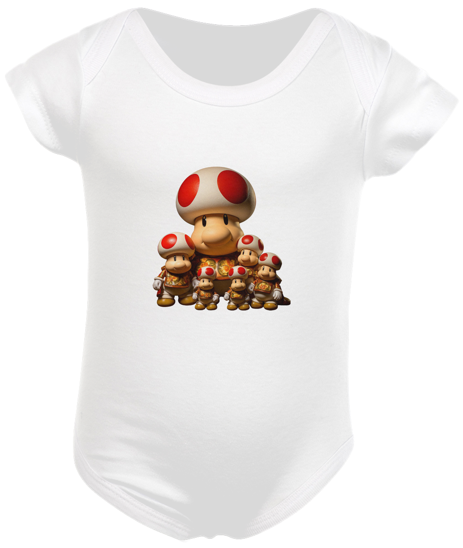 Composição: 100% algodão, meia malha penteada, costura reforçada, viés na gola, mangas curtas.