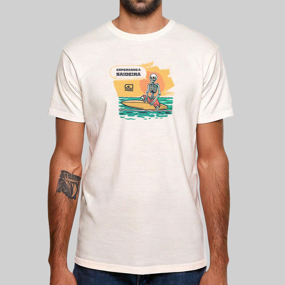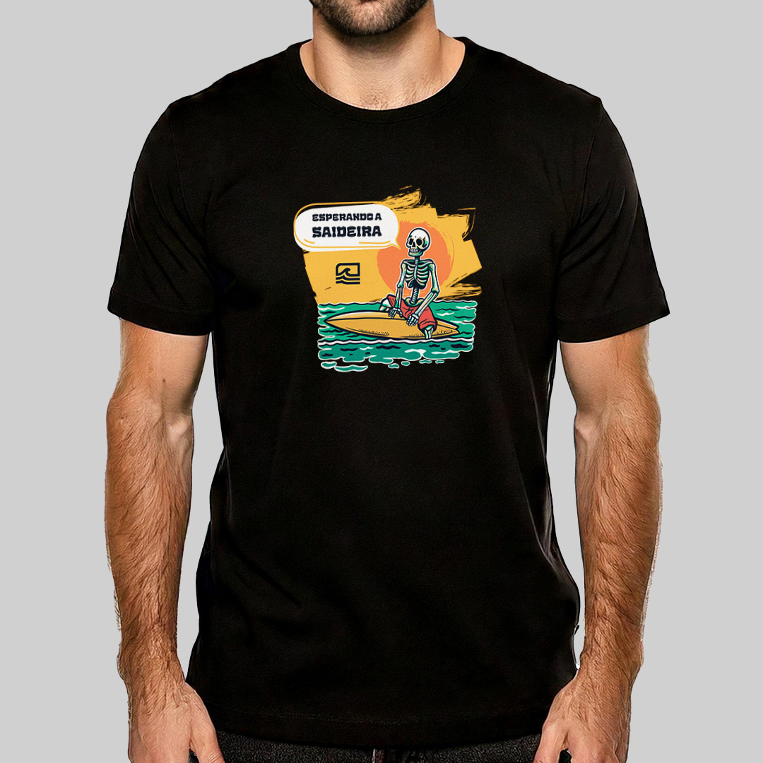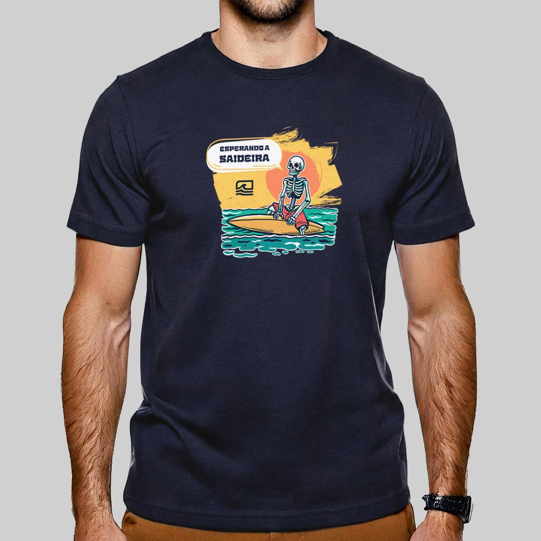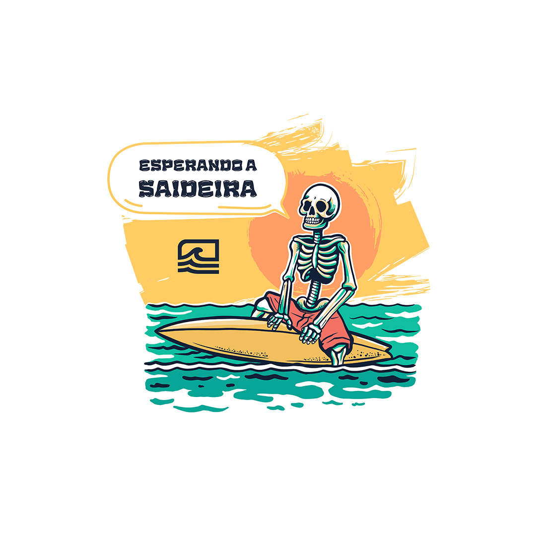 A estampa "Esperando a Saideira" retrata aquele dilema clássico de todo surfista: quando precisamos sair do mar, a saideira nunca aparece! Com uma ilustração detalhada de uma caveira sentada na prancha, olhando para o outside, ela representa a eterna espera pela última onda perfeita. Para quem vive pelo surf e sabe que "só mais uma" nunca é suficiente.