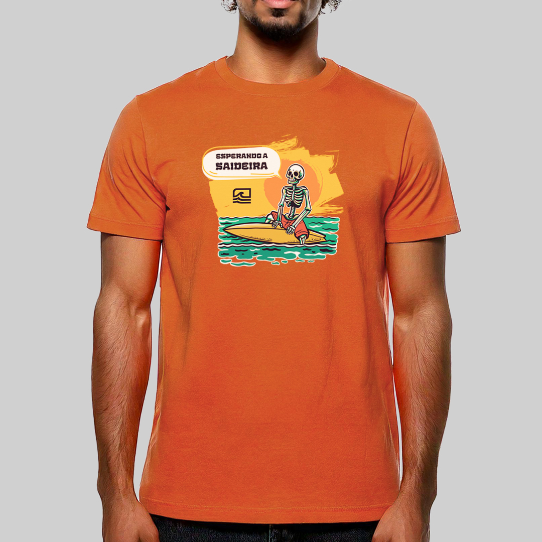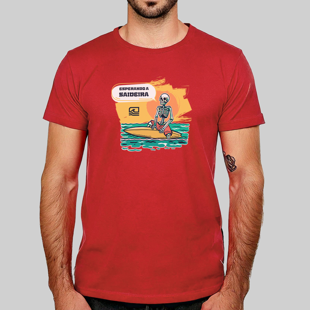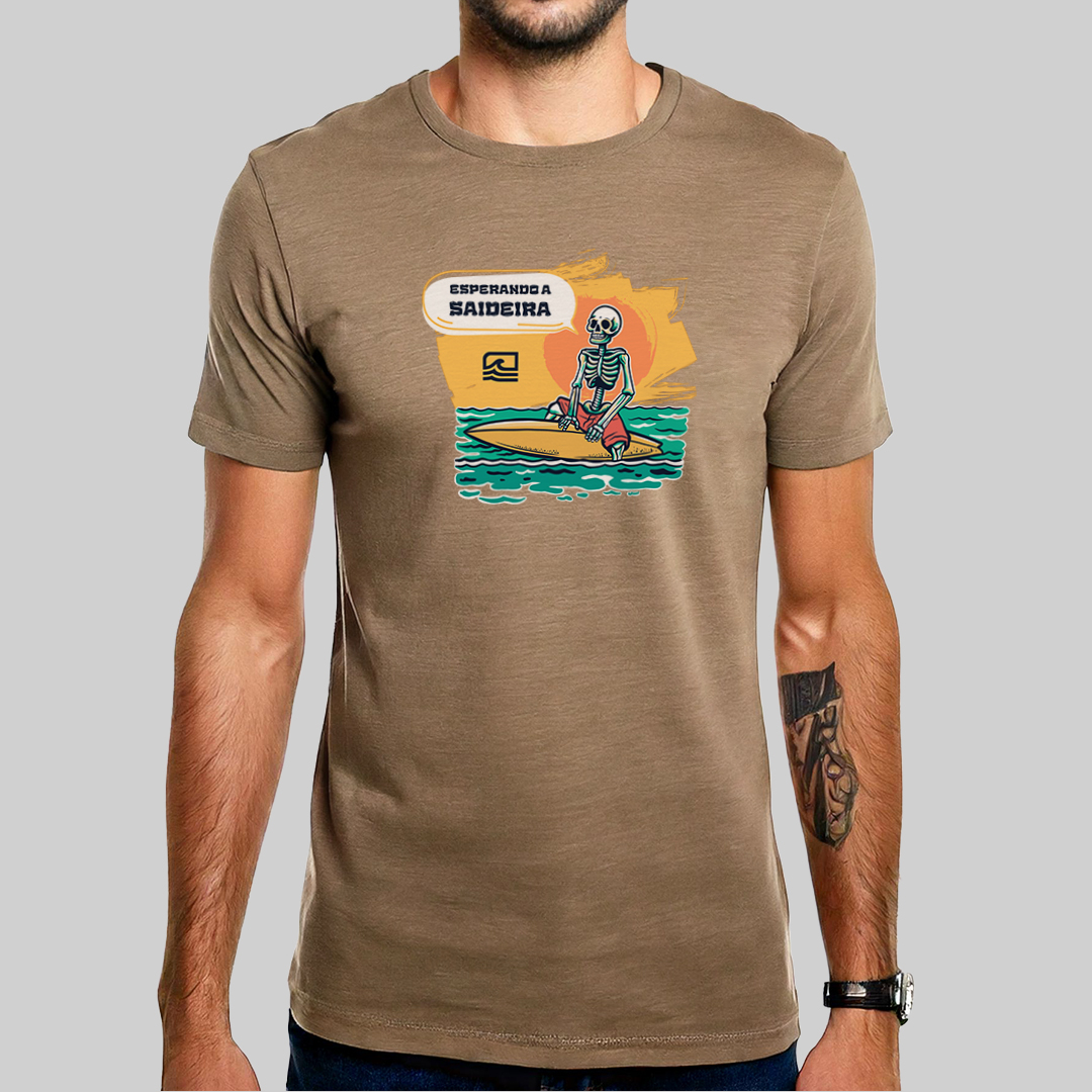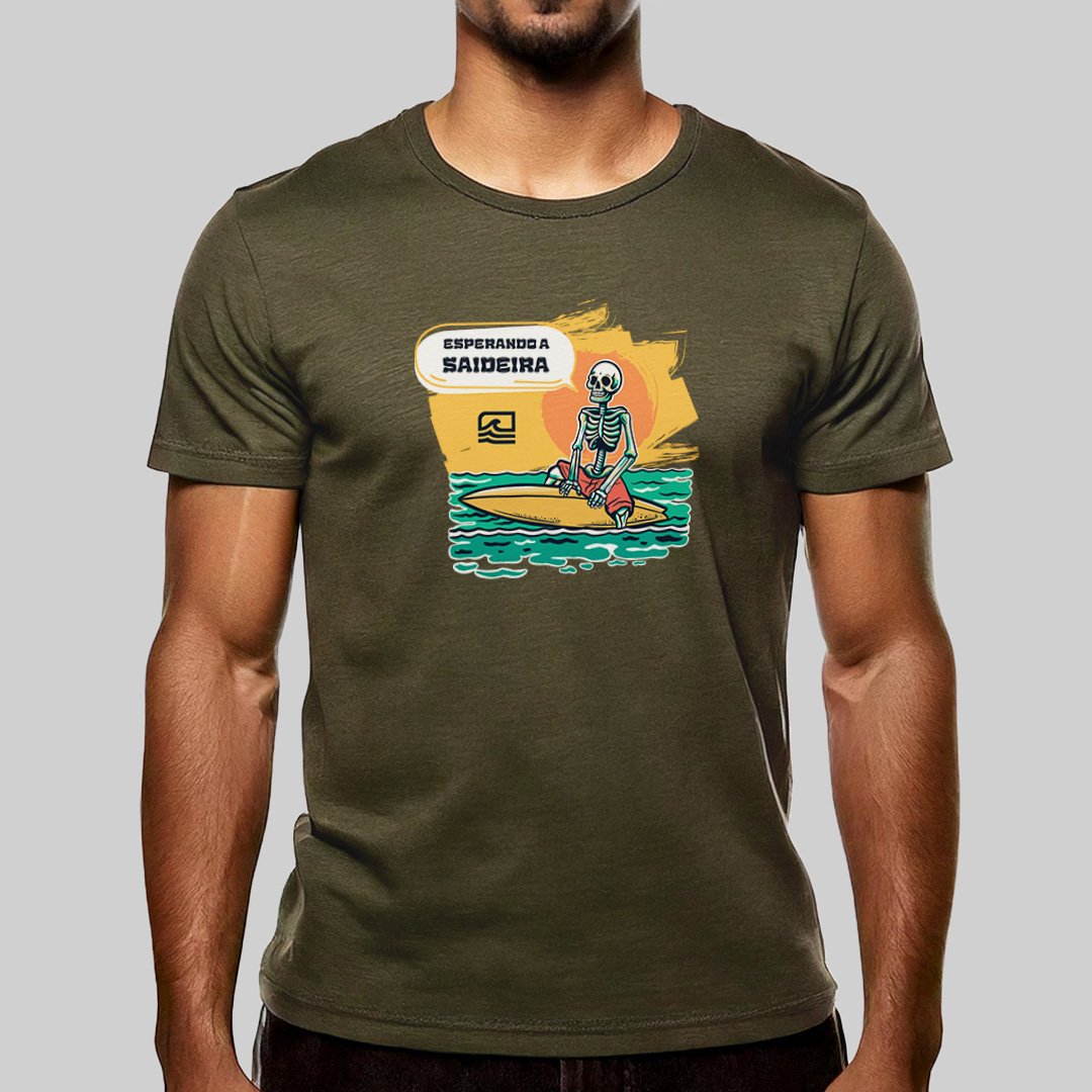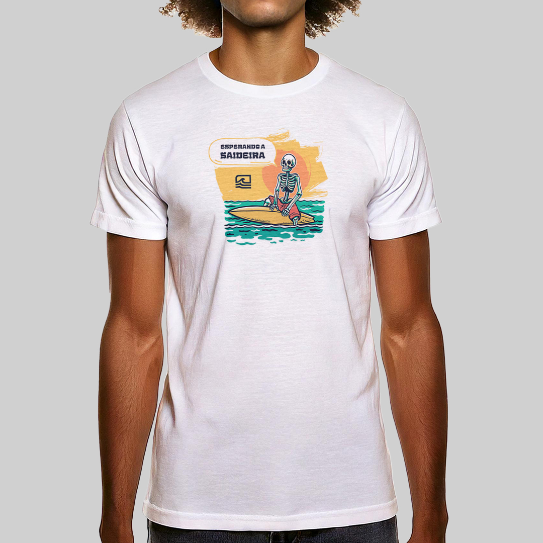 A estampa "Esperando a Saideira" retrata aquele dilema clássico de todo surfista: quando precisamos sair do mar, a saideira nunca aparece! Com uma ilustração detalhada de uma caveira sentada na prancha, olhando para o outside, ela representa a eterna espera pela última onda perfeita. Para quem vive pelo surf e sabe que "só mais uma" nunca é suficiente.