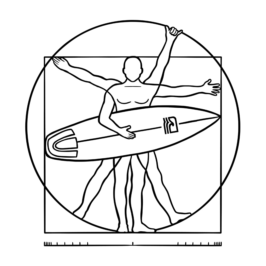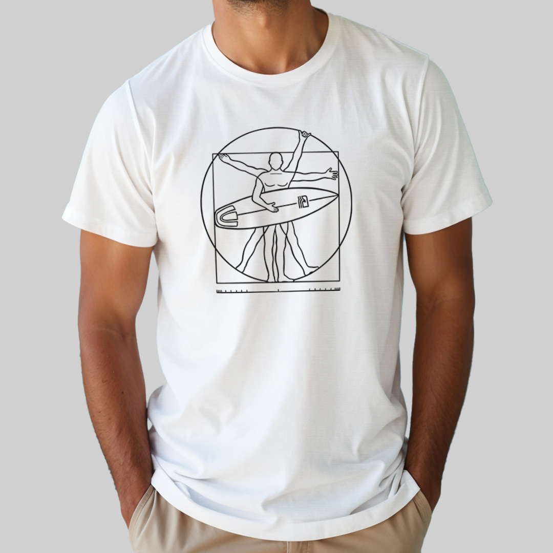 A estampa "Surfista Vitruviano" traz uma releitura criativa do clássico "Homem Vitruviano" de Leonardo da Vinci, adaptado para o universo do surf. Com traços minimalistas, a ilustração mostra a icônica figura renascentista segurando uma prancha em um dos braços, simbolizando o equilíbrio perfeito entre arte, ciência e a paixão pelo mar. Para surfistas que veem no surf uma verdadeira obra-prima da natureza!