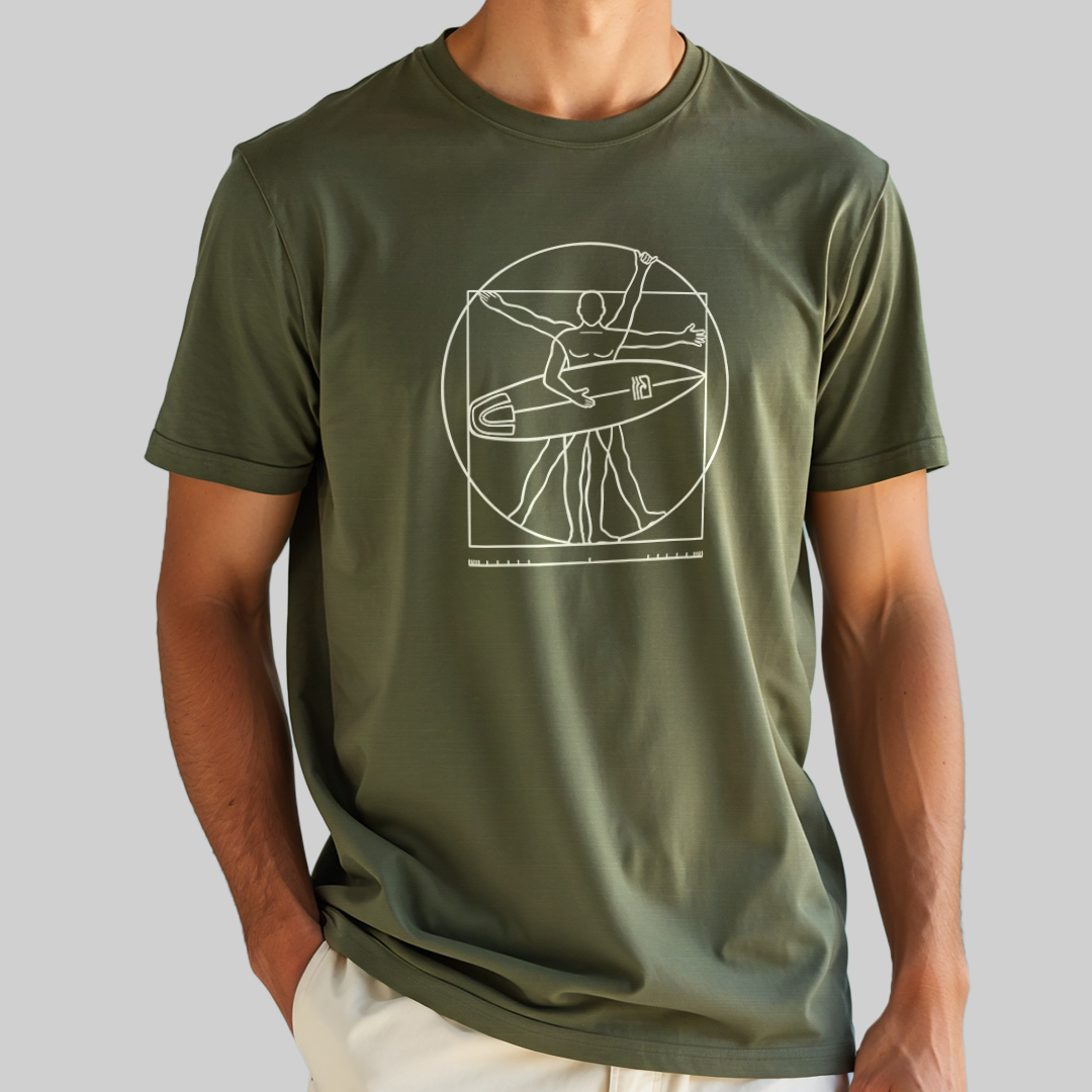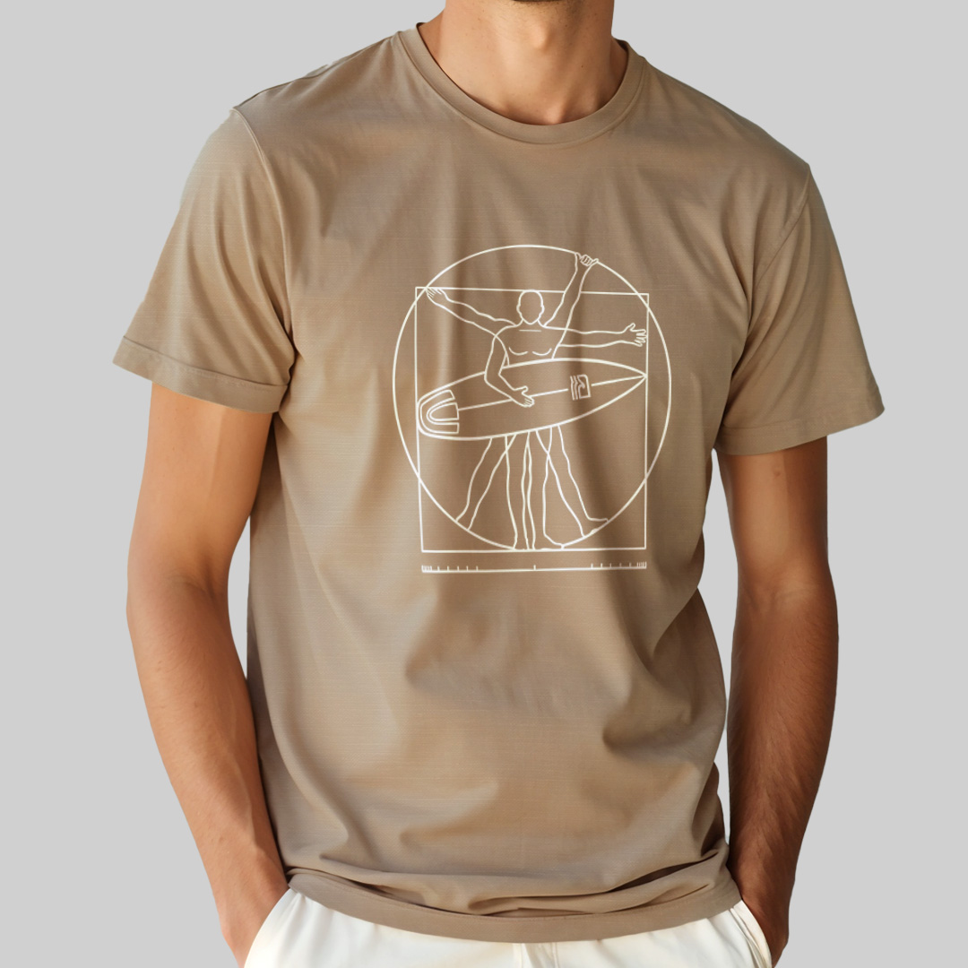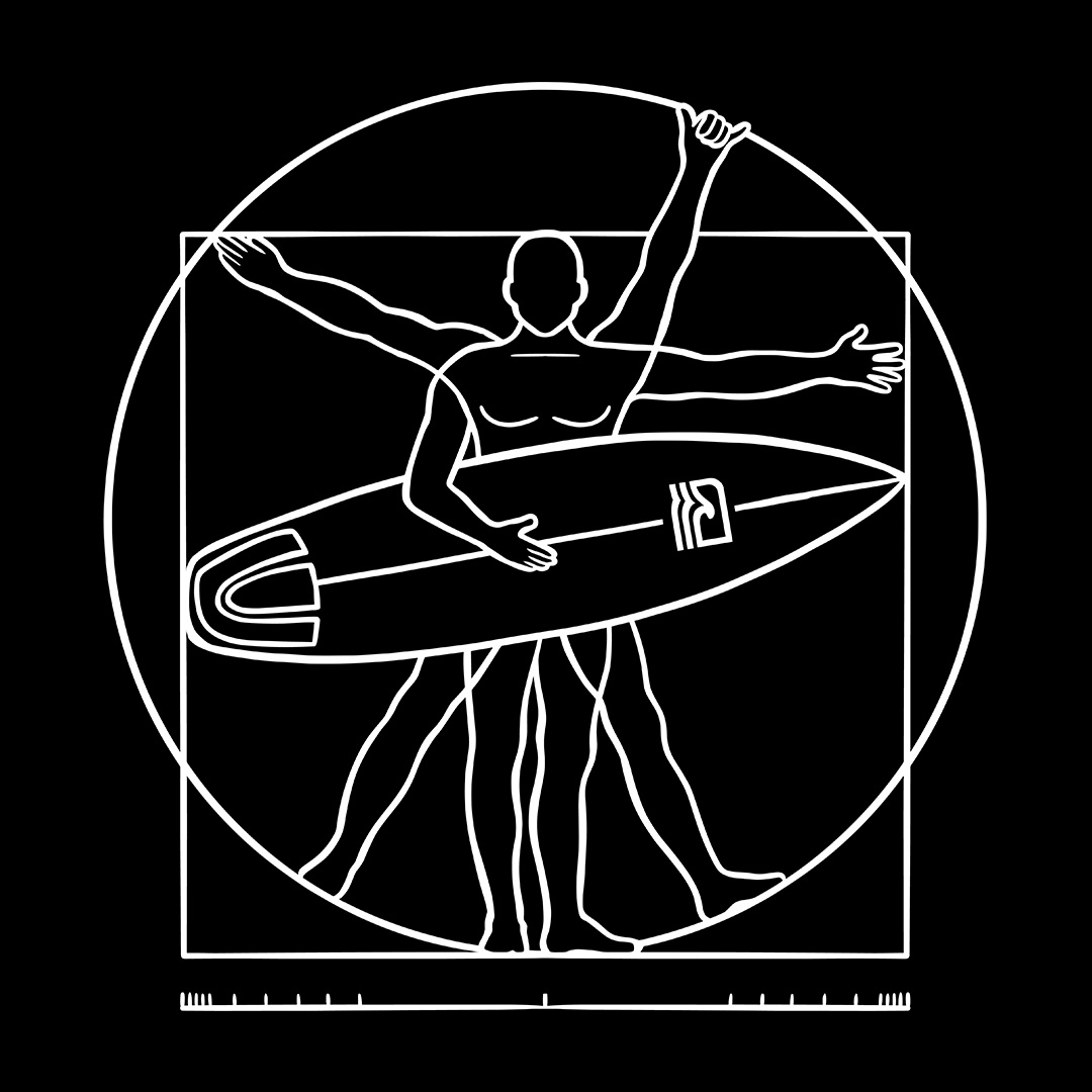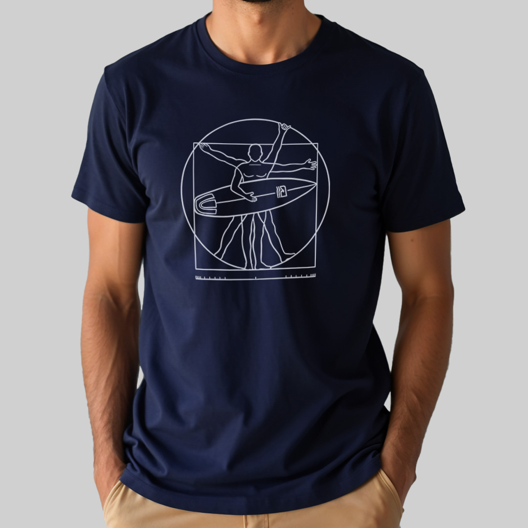 A estampa "Surfista Vitruviano" traz uma releitura criativa do clássico "Homem Vitruviano" de Leonardo da Vinci, adaptado para o universo do surf. Com traços minimalistas, a ilustração mostra a icônica figura renascentista segurando uma prancha em um dos braços, simbolizando o equilíbrio perfeito entre arte, ciência e a paixão pelo mar. Para surfistas que veem no surf uma verdadeira obra-prima da natureza!