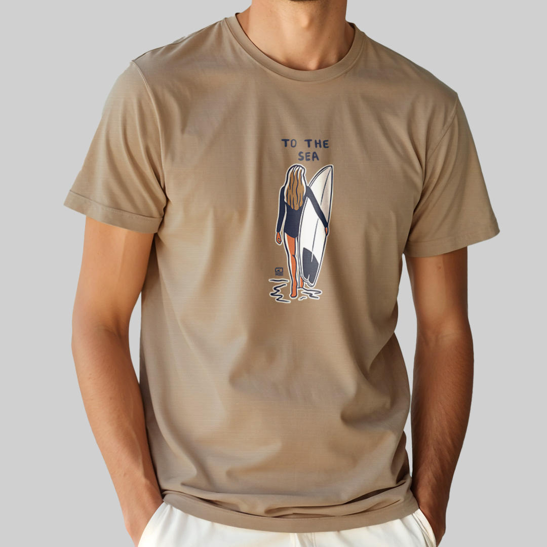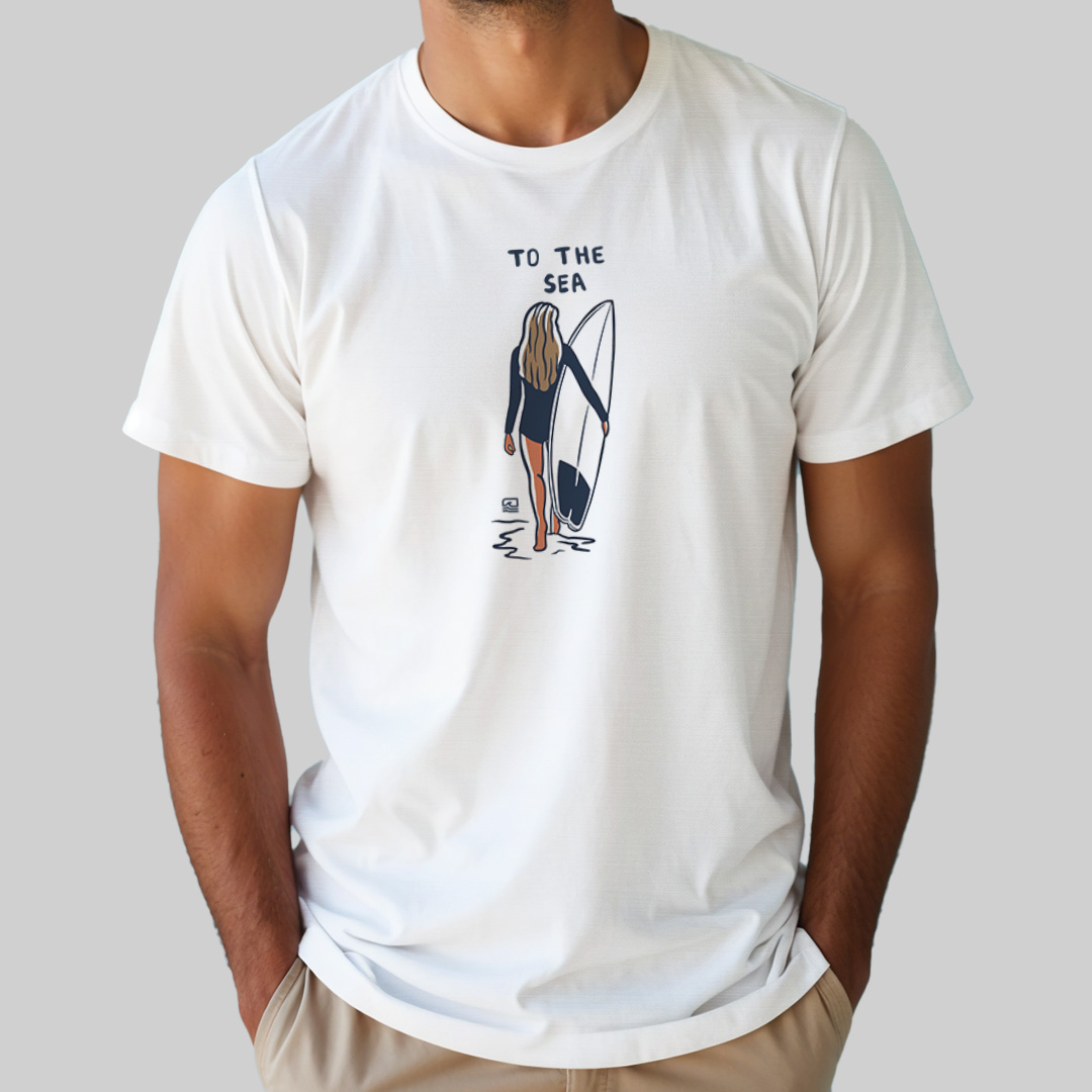 A estampa "To the Sea" é uma homenagem ao momento especial de conexão entre a surfista e o mar. Com traços simples e elegantes, a arte mostra uma mulher segurando sua prancha e caminhando em direção ao oceano, simbolizando o amor e a busca pelas ondas. Ideal para quem vive o surf de forma leve e autêntica, essa camiseta representa a essência da jornada até o mar, onde a liberdade e a aventura se encontram.