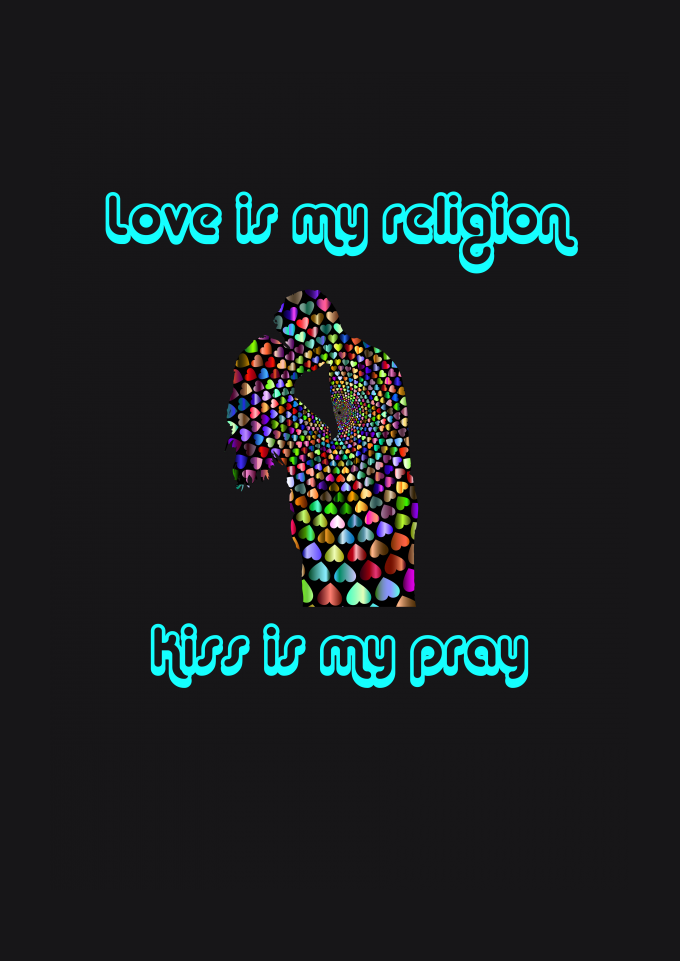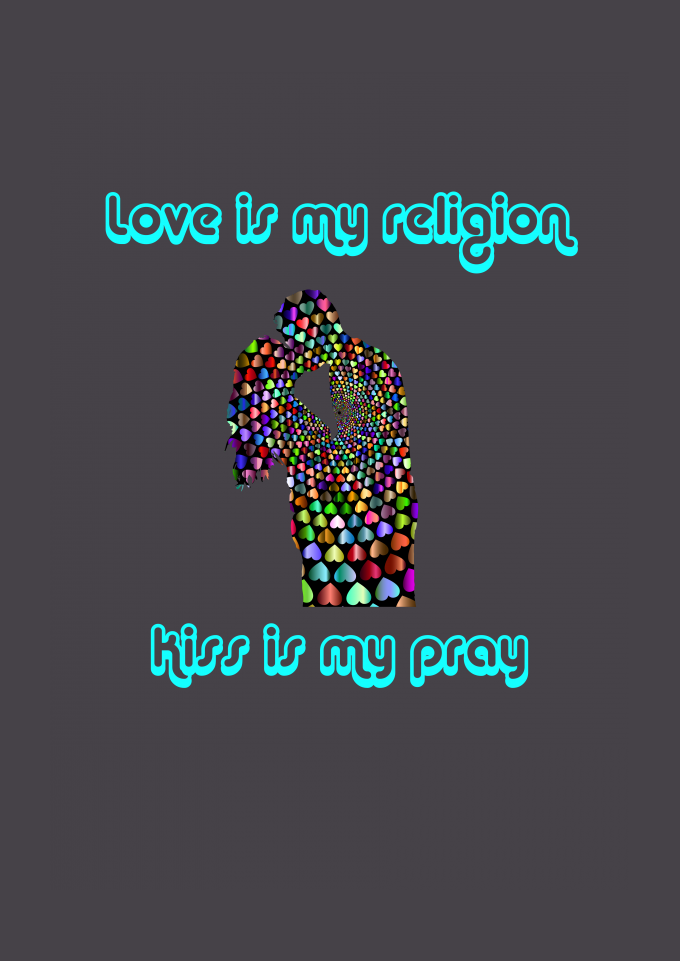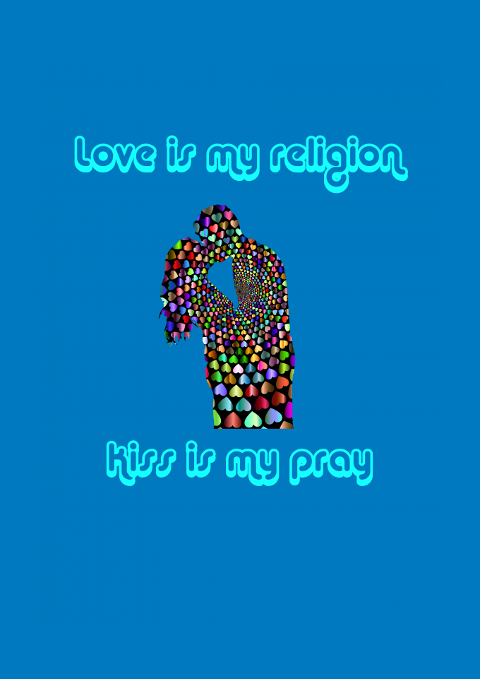 Casal se beijando e uma frase dizendo "Love is my religion Kiss is my pray" (Amor é minha religião Beijo é minha oração".