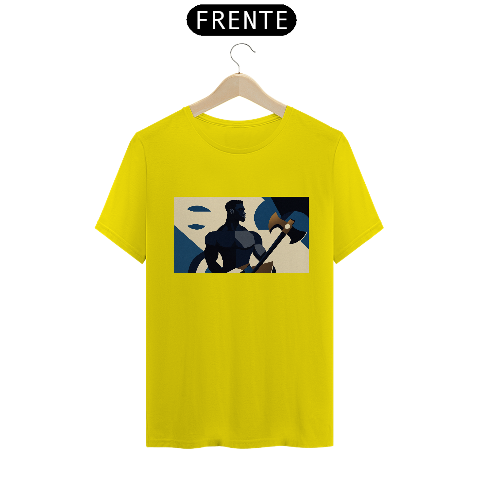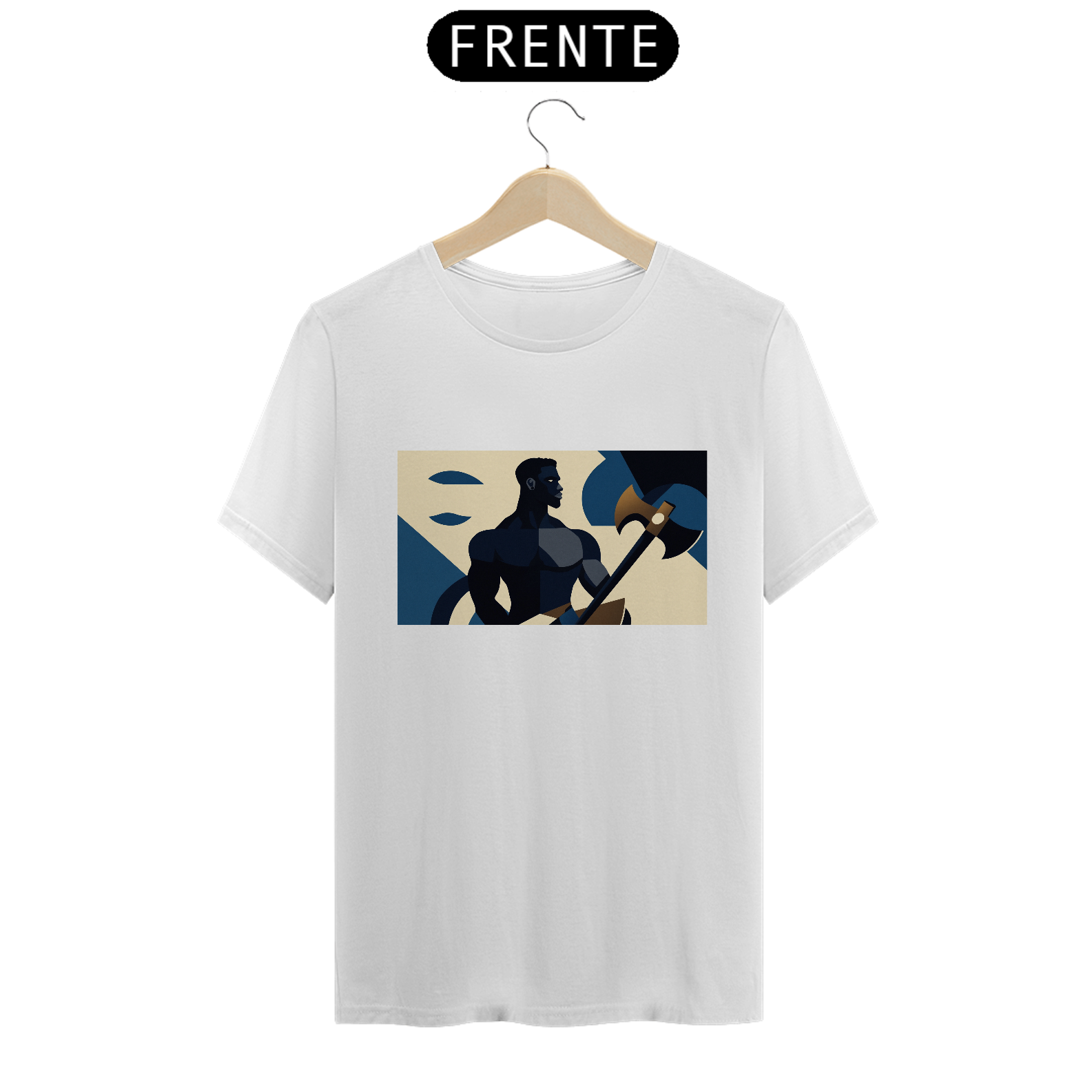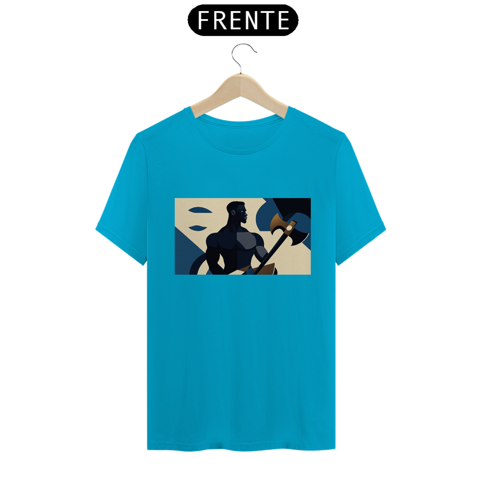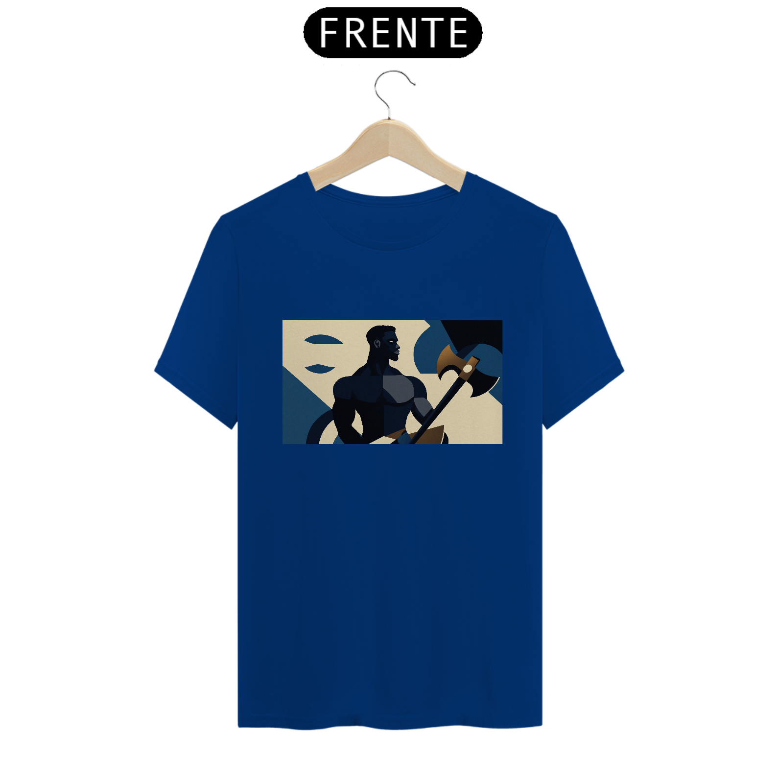 Camiseta "Xangô Poderoso": Inspirada no estilo de propaganda industrial, traz Xangô segurando seu machado, símbolo de justiça e força. Tons azuis e bege criam um visual marcante e atemporal. Vista poder!