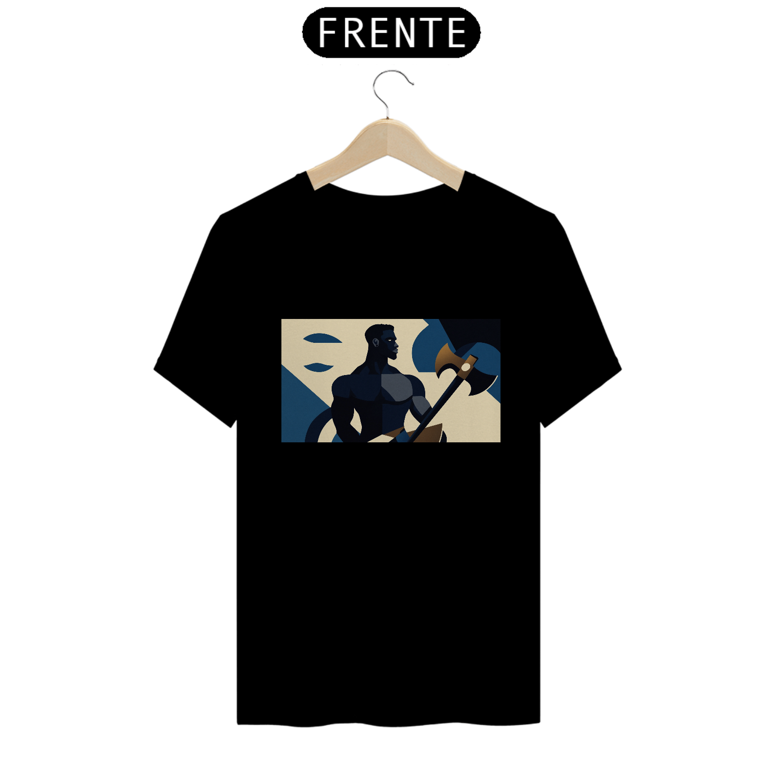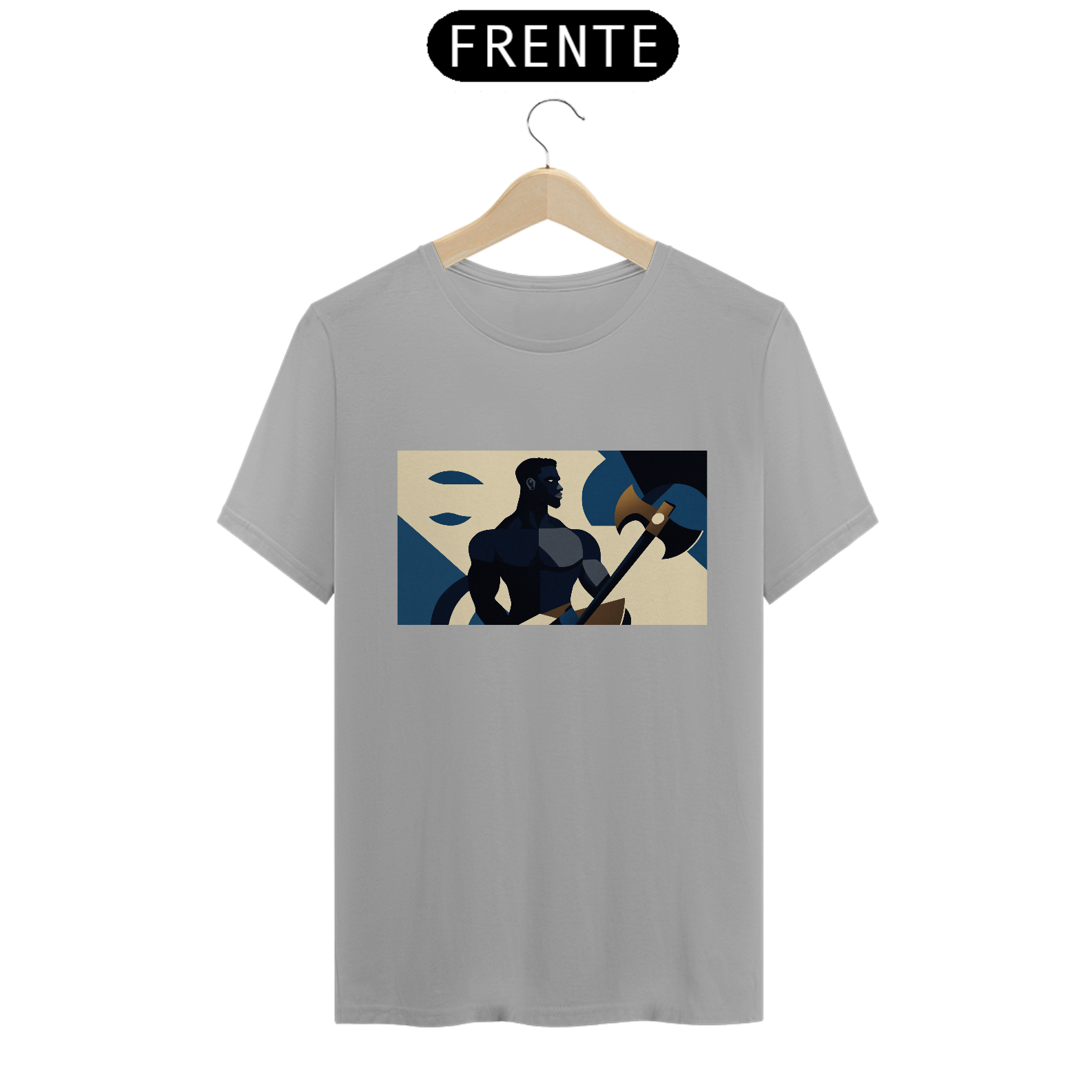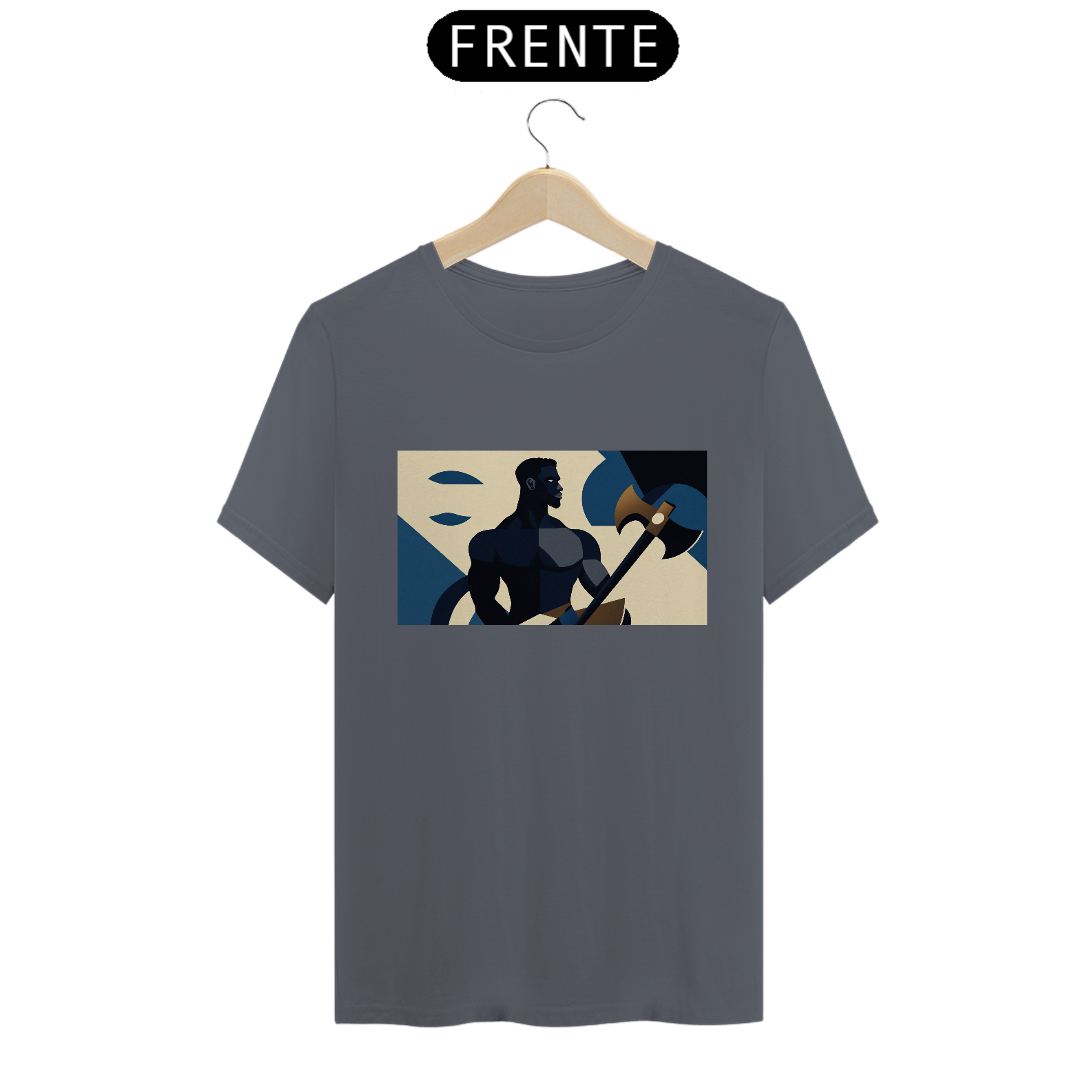Camiseta "Xangô Poderoso": Inspirada no estilo de propaganda industrial, traz Xangô segurando seu machado, símbolo de justiça e força. Tons azuis e bege criam um visual marcante e atemporal. Vista poder!