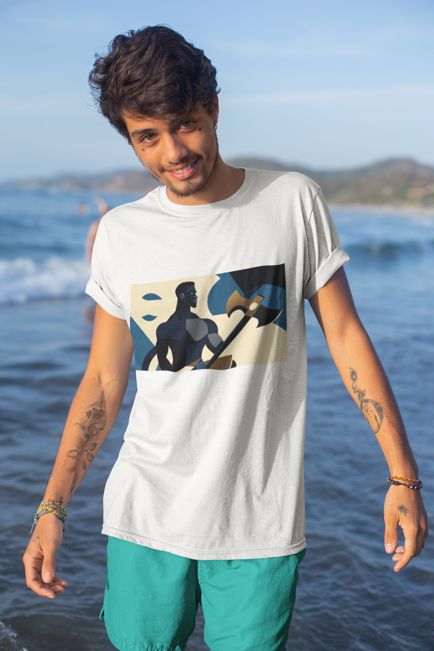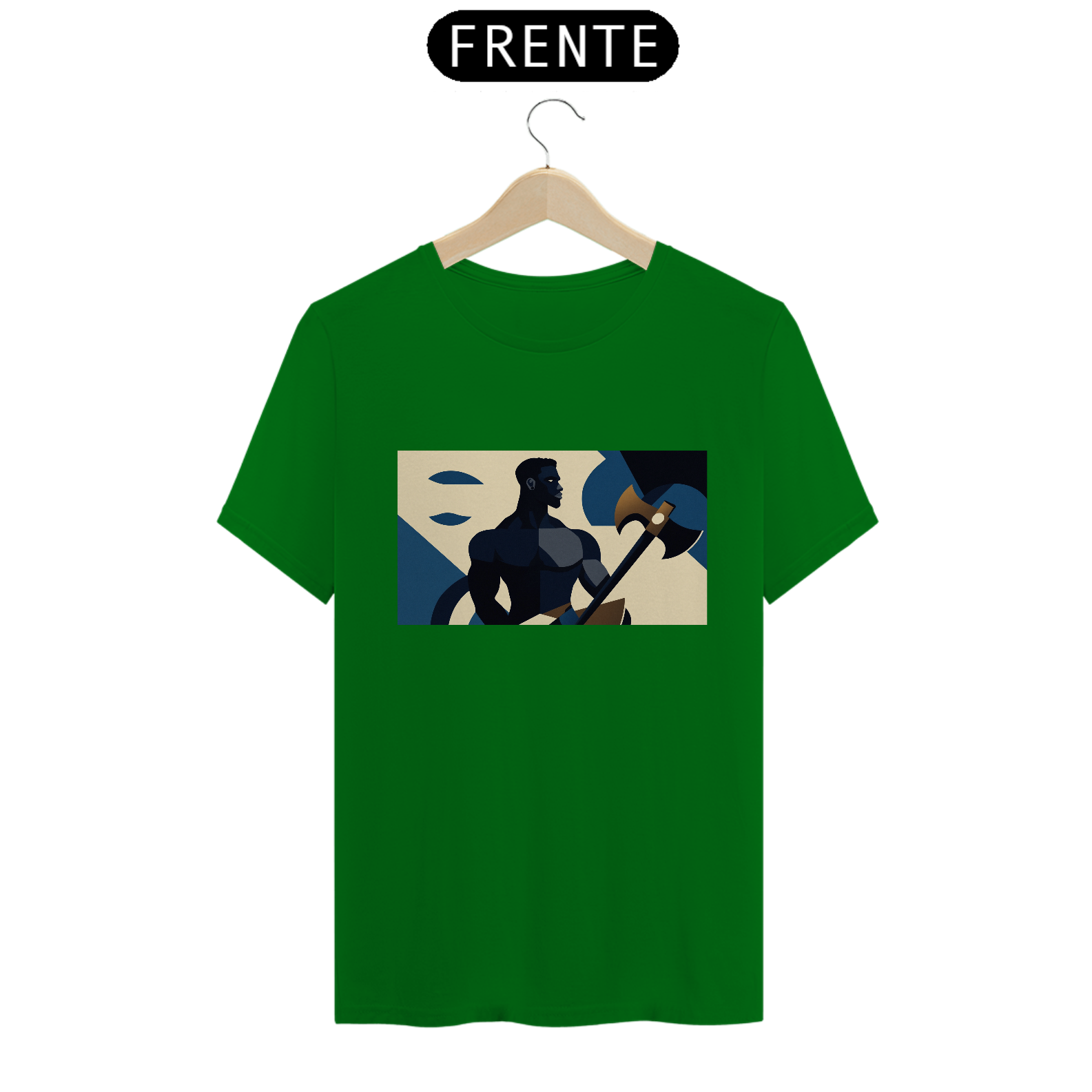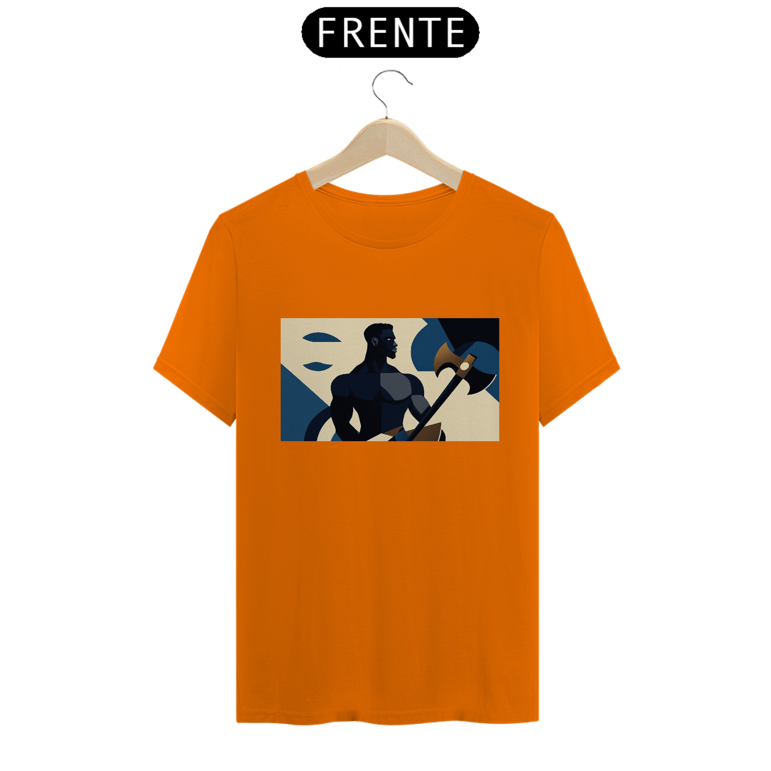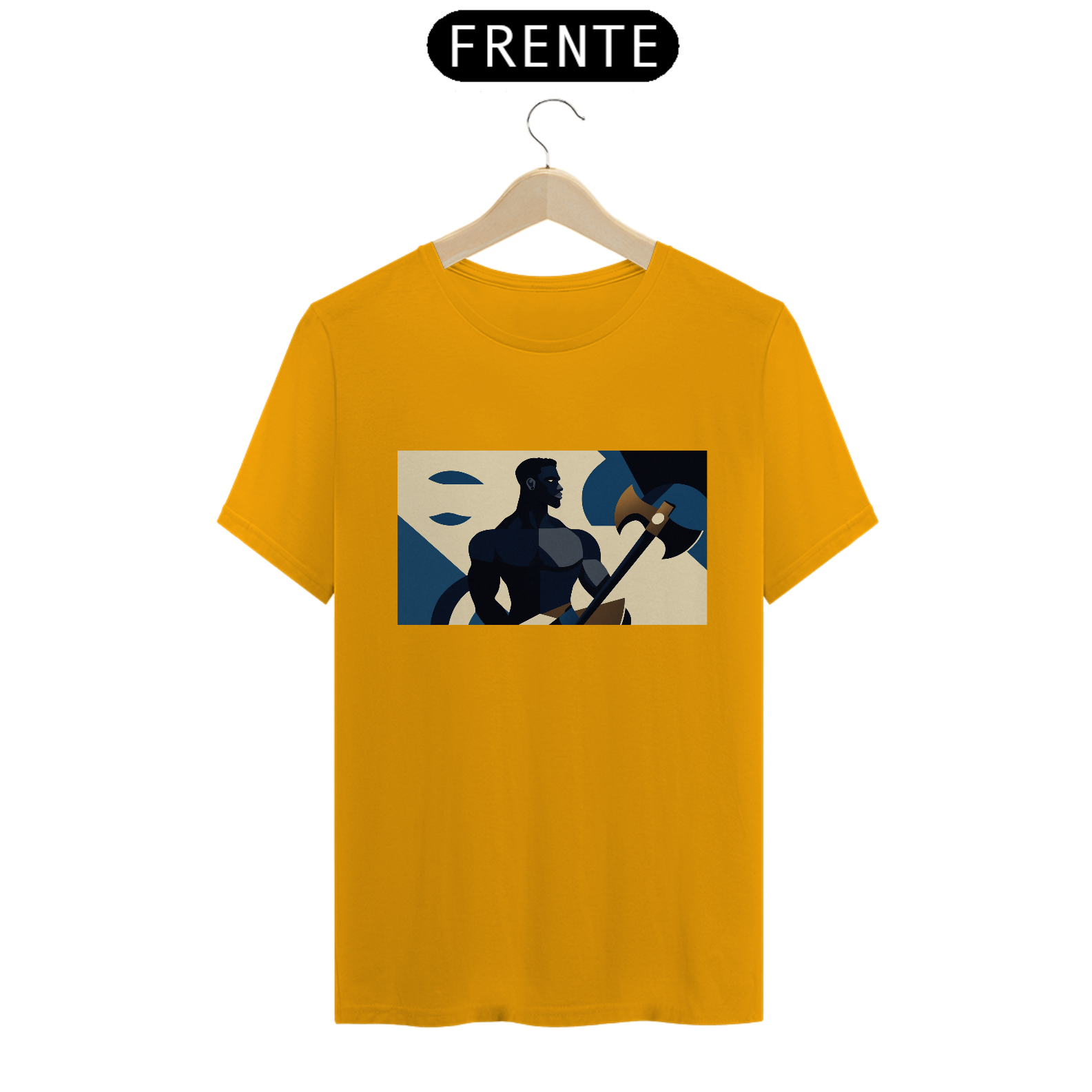 Camiseta "Xangô Poderoso": Inspirada no estilo de propaganda industrial, traz Xangô segurando seu machado, símbolo de justiça e força. Tons azuis e bege criam um visual marcante e atemporal. Vista poder!