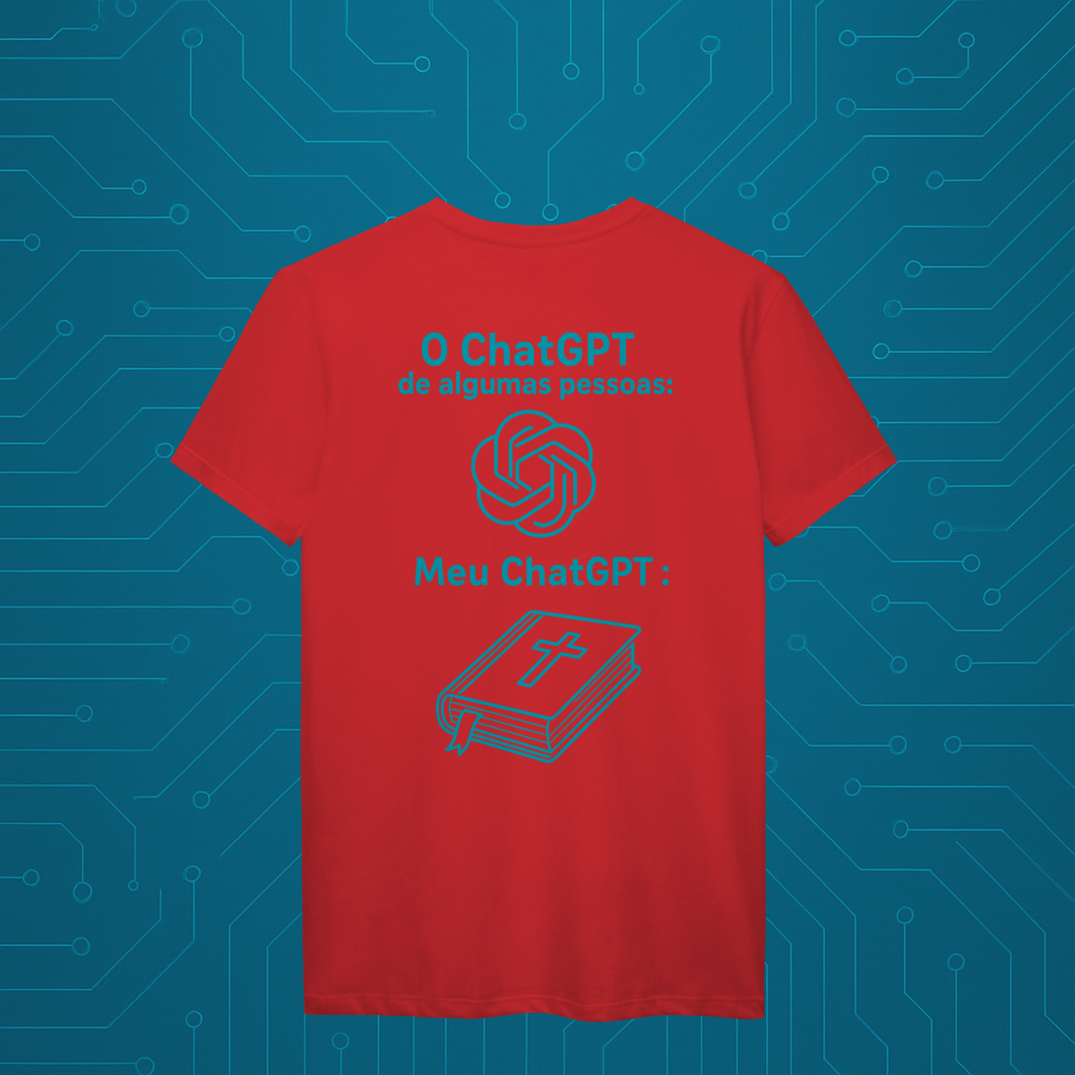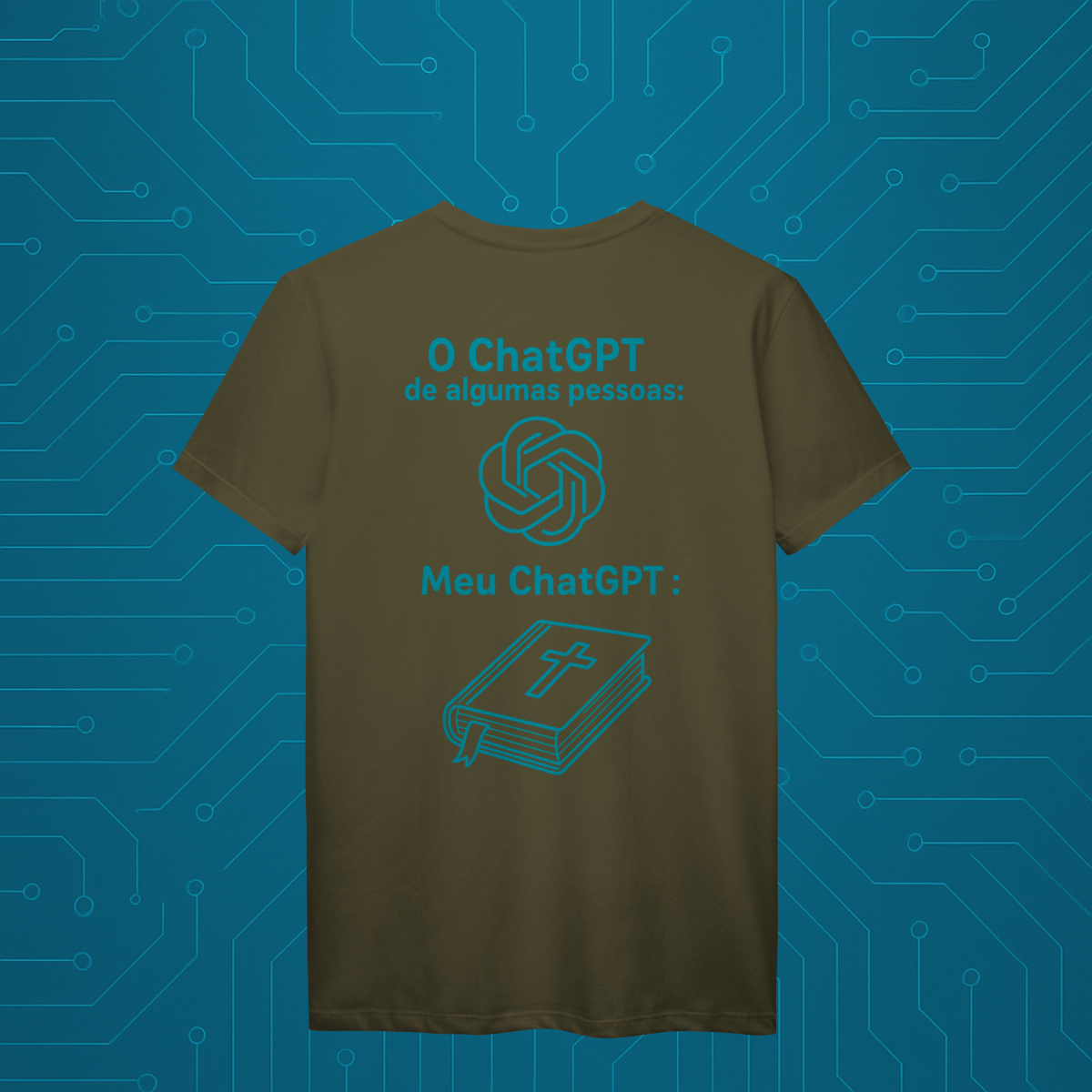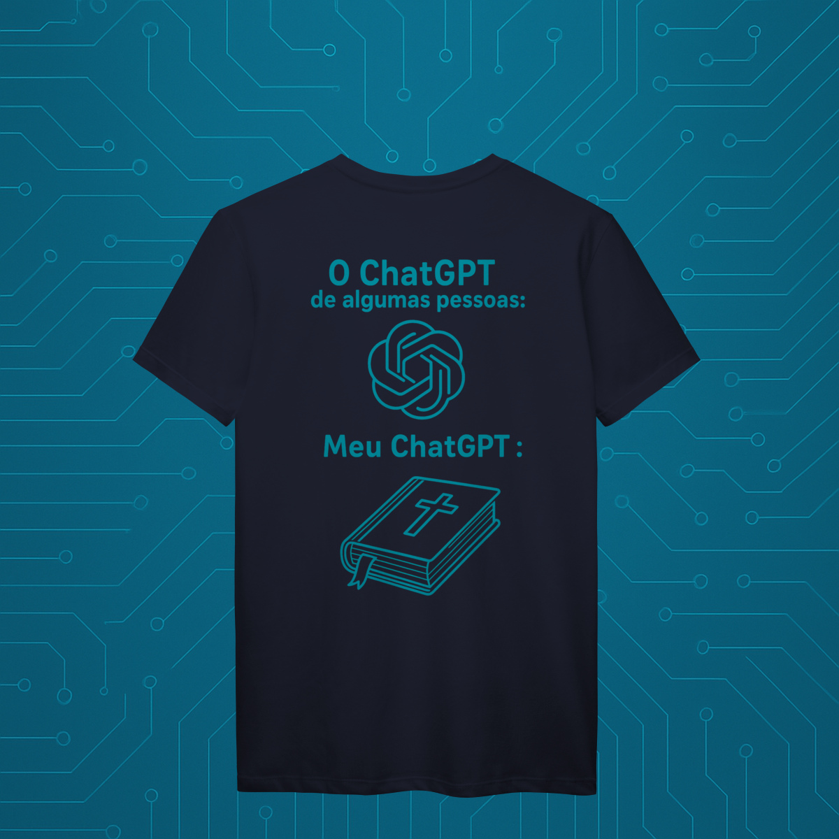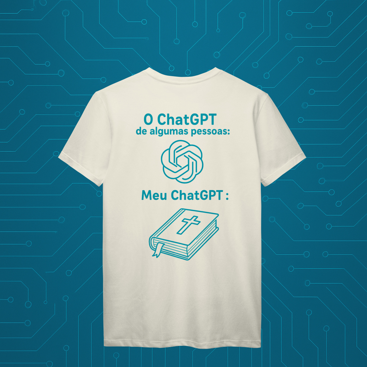 Com um design minimalista, inteligente e carregado de significado, a camiseta “MeuGPT” apresenta dois ícones contemporâneos: o símbolo do ChatGPT e a Bíblia.