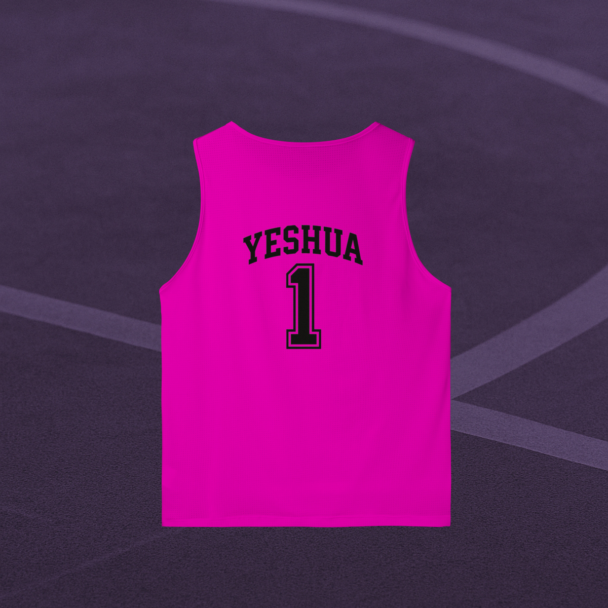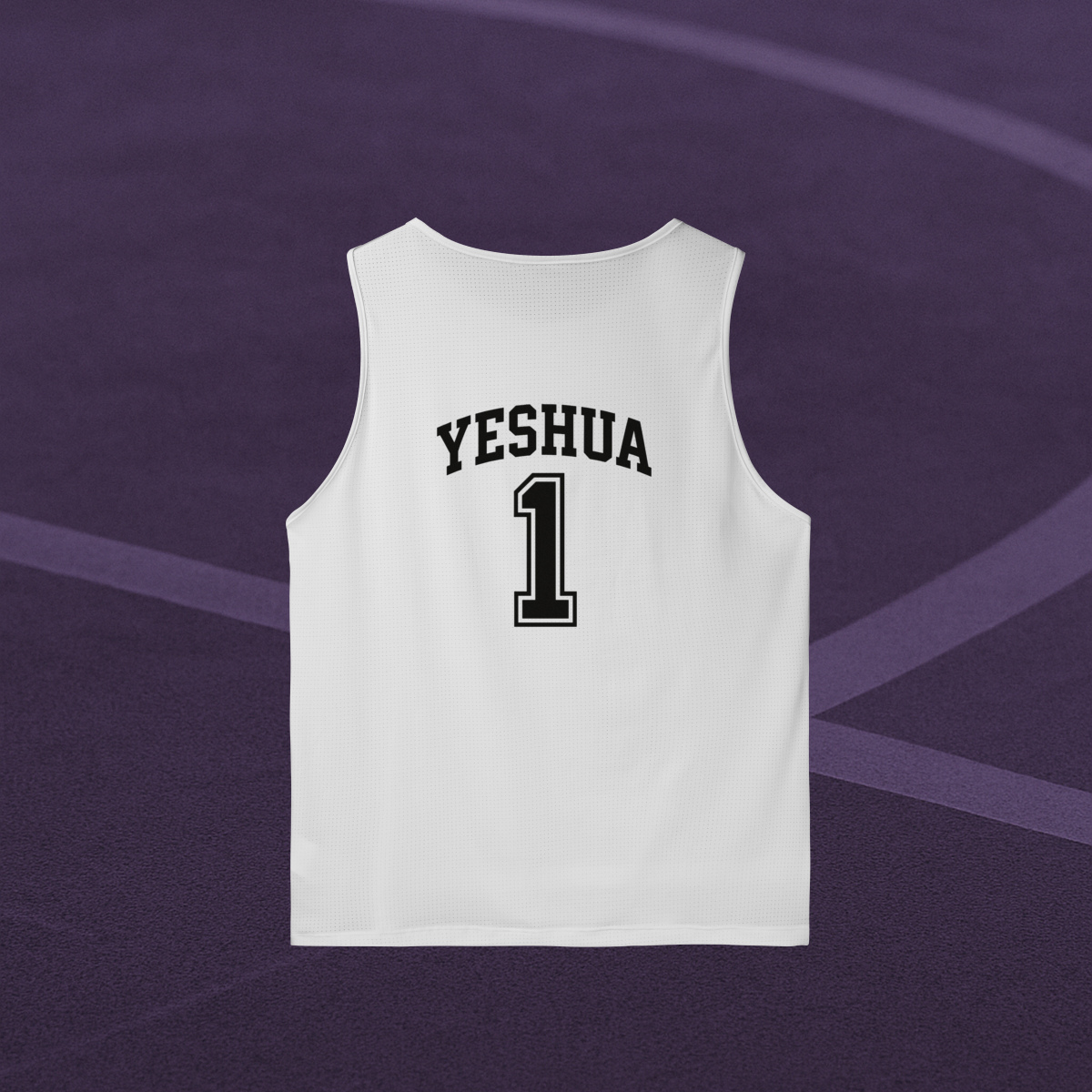 Com um design inspirado nas jerseys clássicas de basquete americano, a regata traz o nome “YESHUA” em tipografia de impacto, curvada como um escudo de honra, acima do número #1.