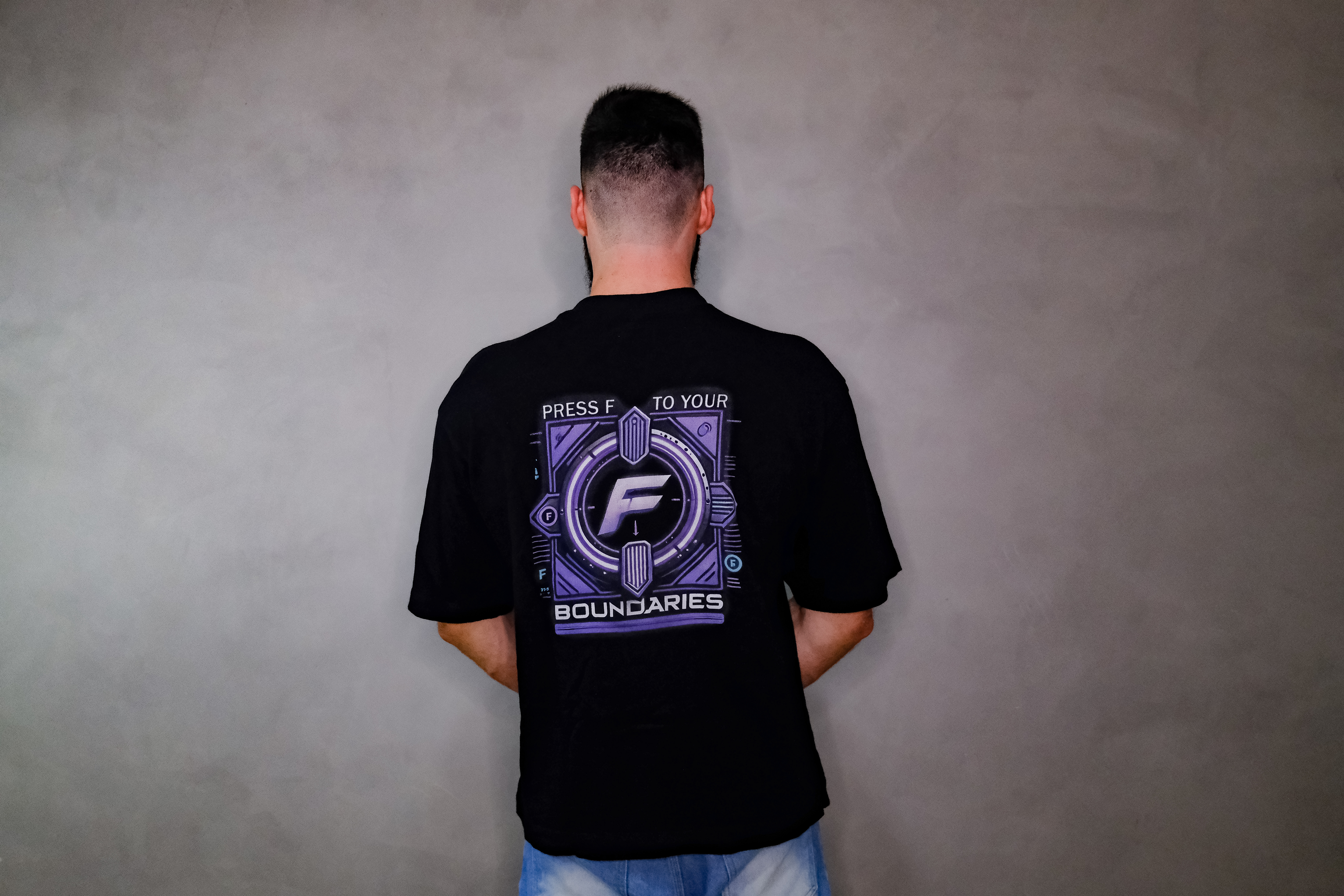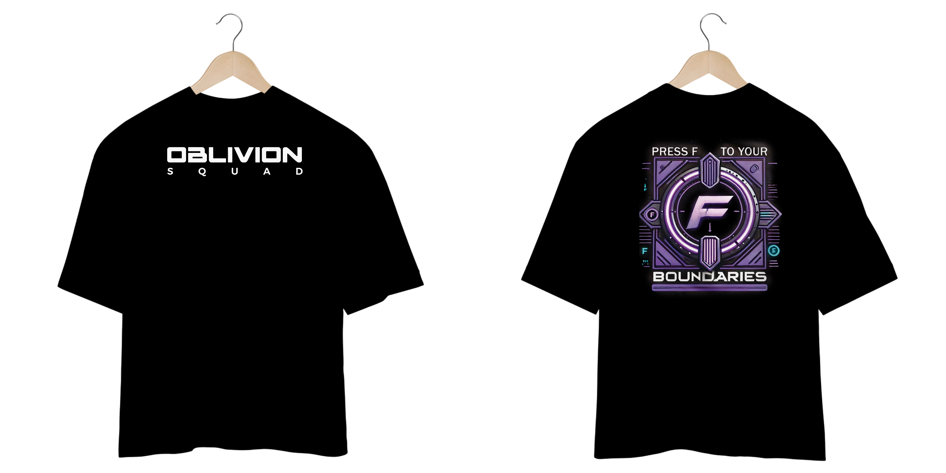A camiseta oversized da Oblivion Squad apresenta um design inspirado na famosa ação "Press F" do universo gamer, mas com uma reviravolta. Ao invés de prestar respeito, aqui você "Press F to your boundaries", desafiando seus próprios limites em todas as áreas. O visual traz uma interface futurística, com elementos de neon roxo e azul, simbolizando o equilíbrio entre controle e superação. O destaque é o grande "F" centralizado, cercado por detalhes que remetem a uma engrenagem de tecnologia avançada, refletindo a constante evolução e resiliência.