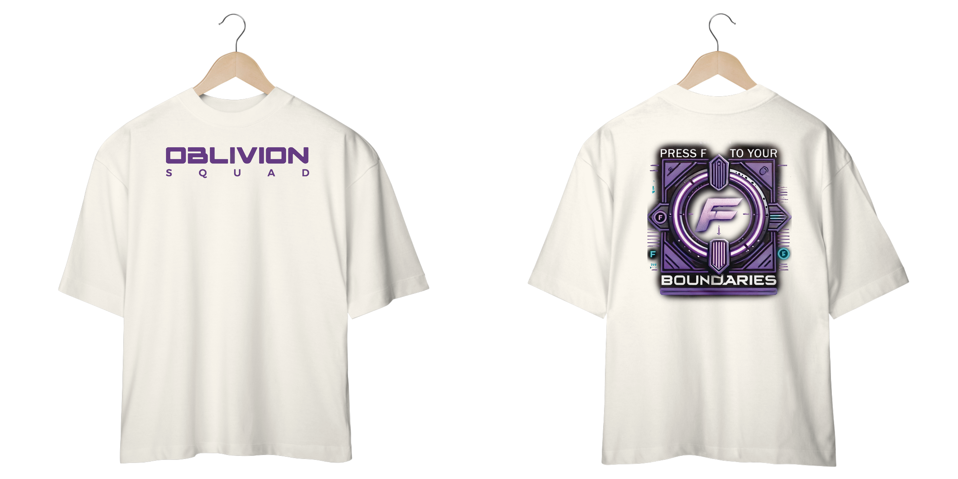 A camiseta oversized da Oblivion Squad apresenta um design inspirado na famosa ação "Press F" do universo gamer, mas com uma reviravolta. Ao invés de prestar respeito, aqui você "Press F to your boundaries", desafiando seus próprios limites em todas as áreas. O visual traz uma interface futurística, com elementos de neon roxo e azul, simbolizando o equilíbrio entre controle e superação. O destaque é o grande "F" centralizado, cercado por detalhes que remetem a uma engrenagem de tecnologia avançada, refletindo a constante evolução e resiliência.