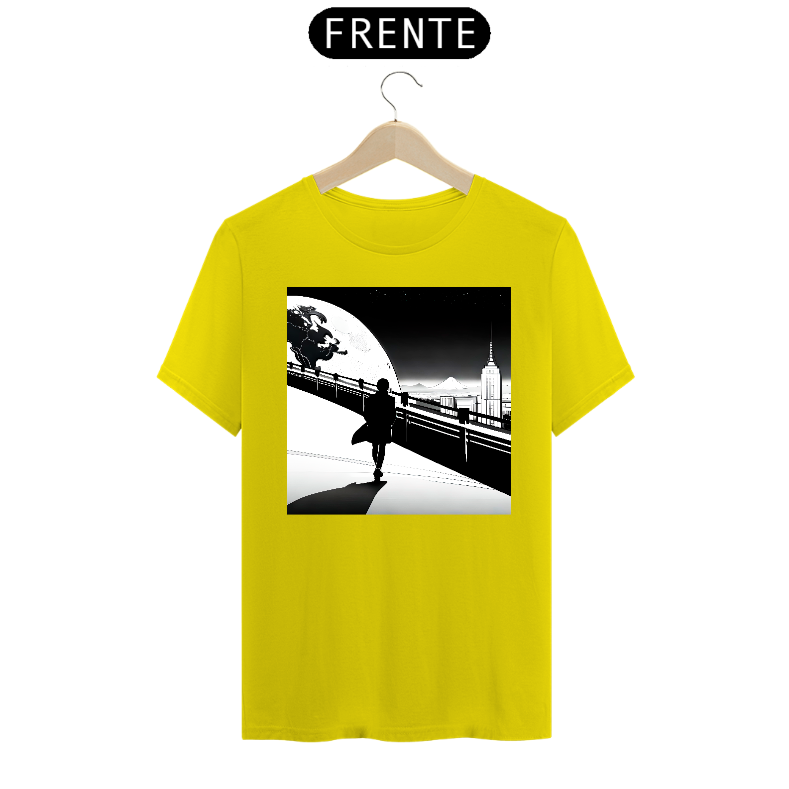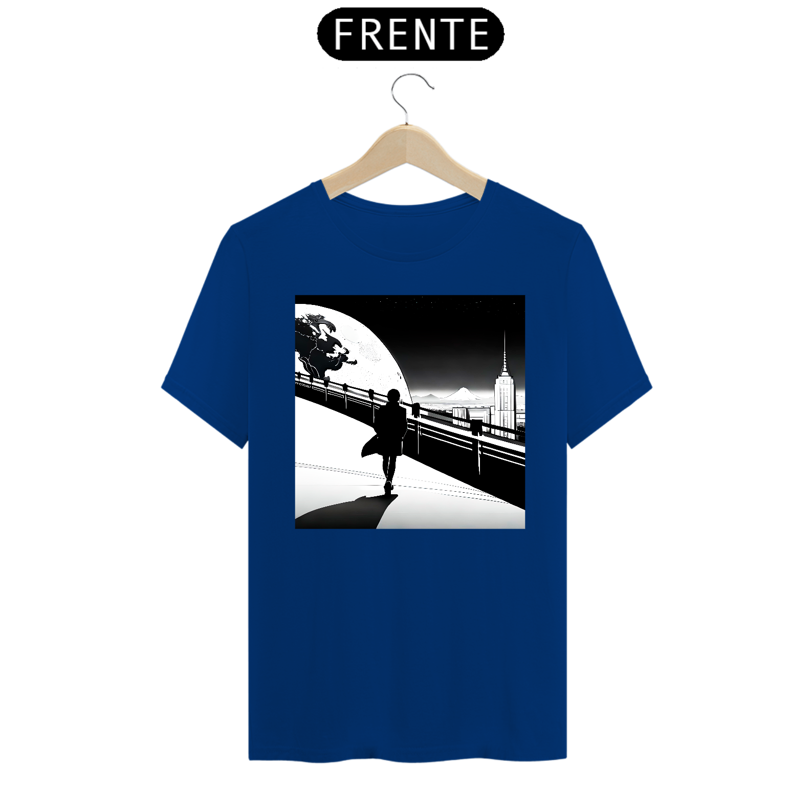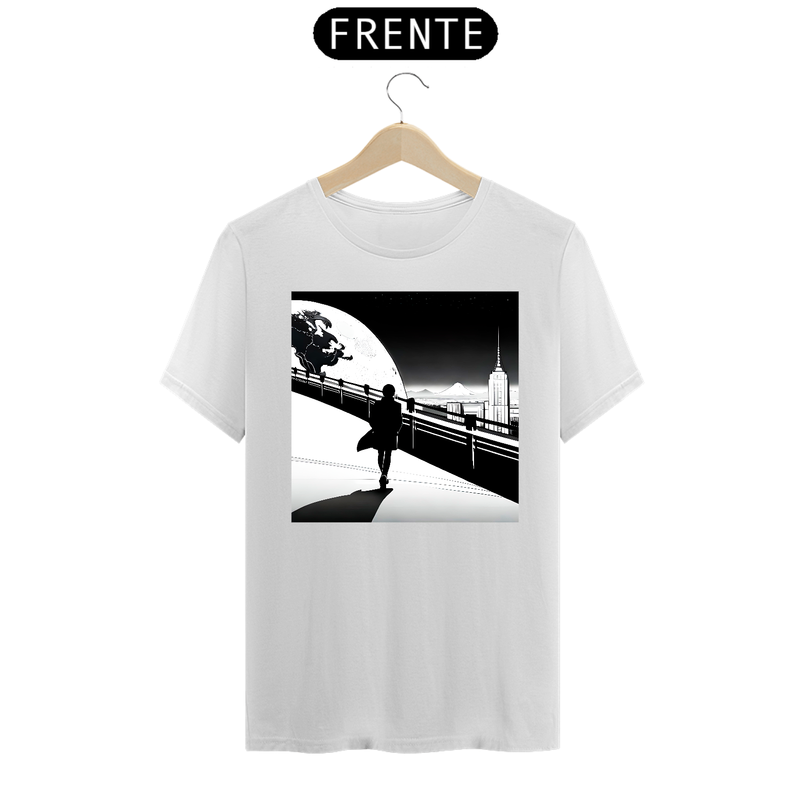 A estampa frontal da camiseta apresenta a silhueta de um homem estilizado, com uma aura de mistério e grandiosidade. Ele é retratado em meio a uma paisagem urbana noturna, onde os arranha-céus e luzes da cidade compõem o cenário perfeito para ressaltar sua presença marcante.