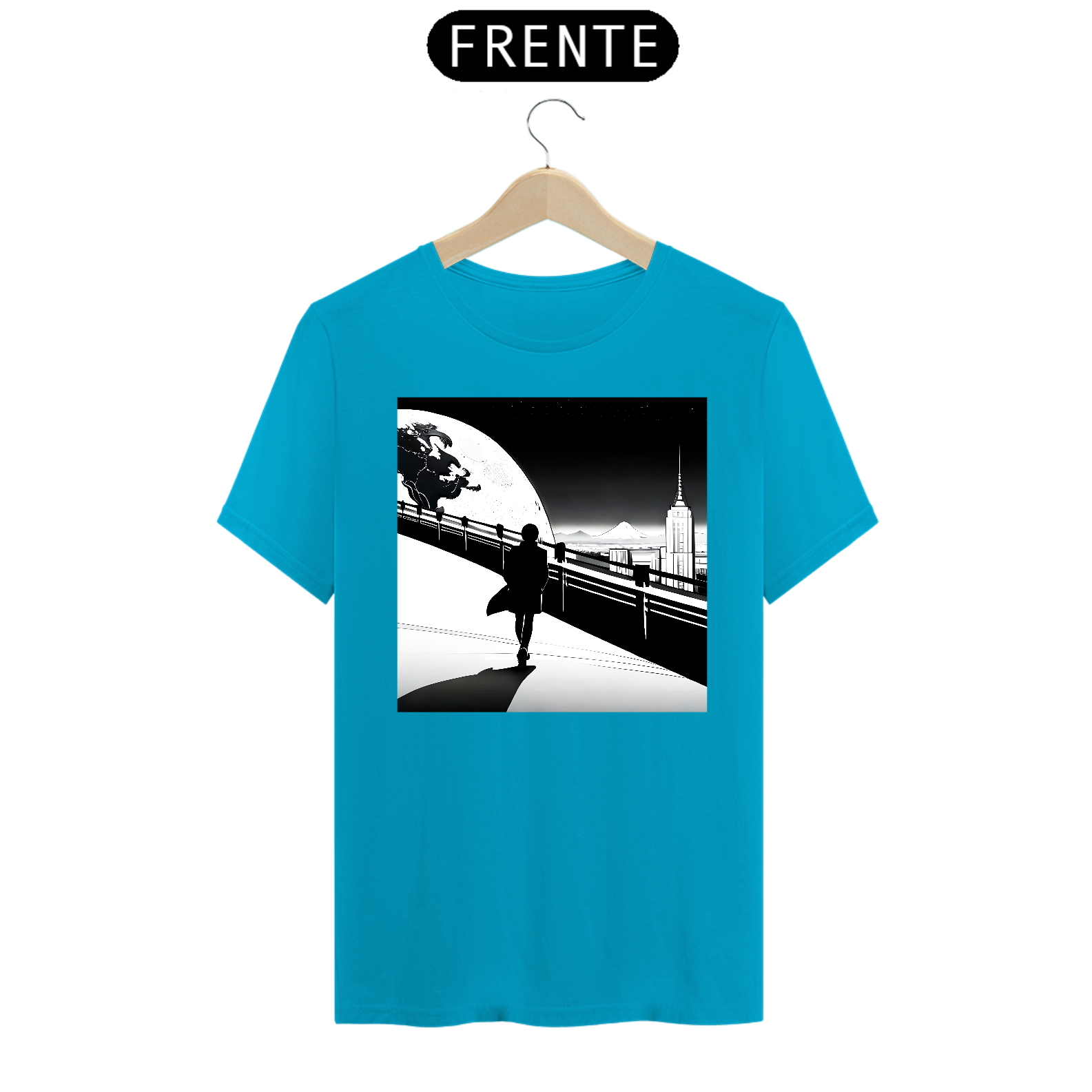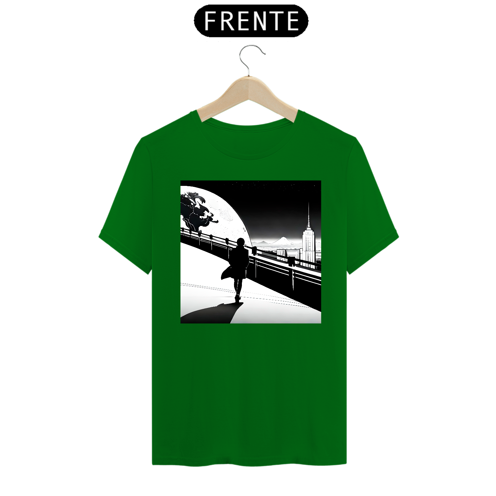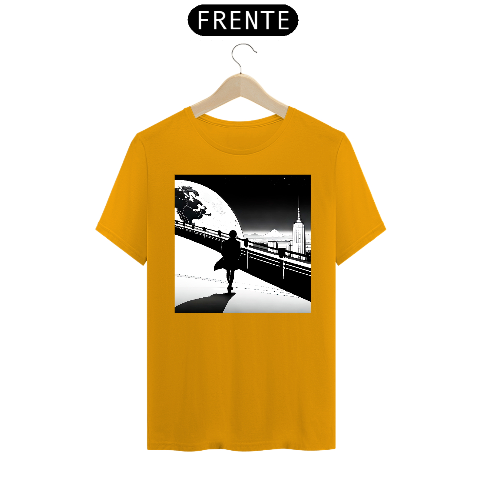 A estampa frontal da camiseta apresenta a silhueta de um homem estilizado, com uma aura de mistério e grandiosidade. Ele é retratado em meio a uma paisagem urbana noturna, onde os arranha-céus e luzes da cidade compõem o cenário perfeito para ressaltar sua presença marcante.