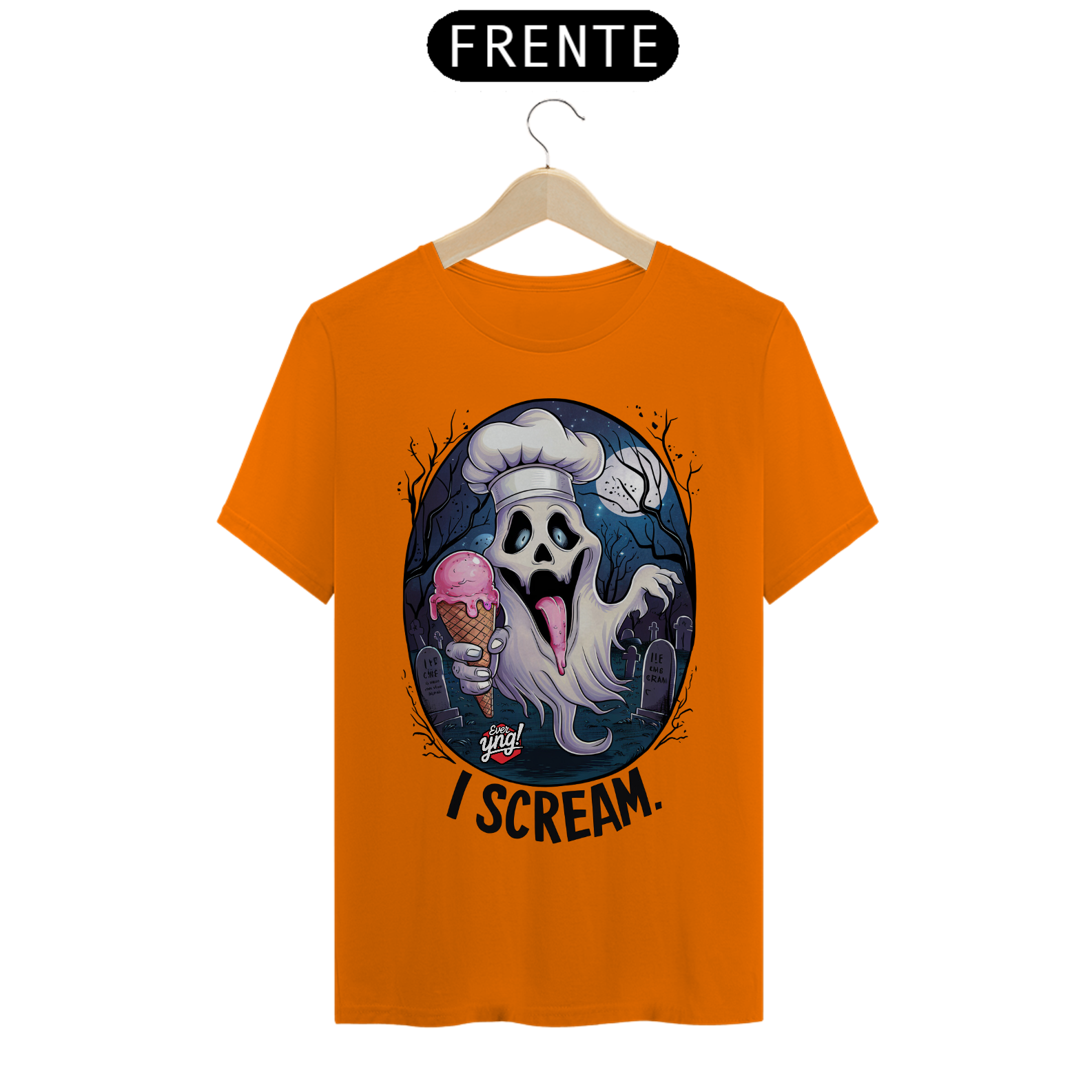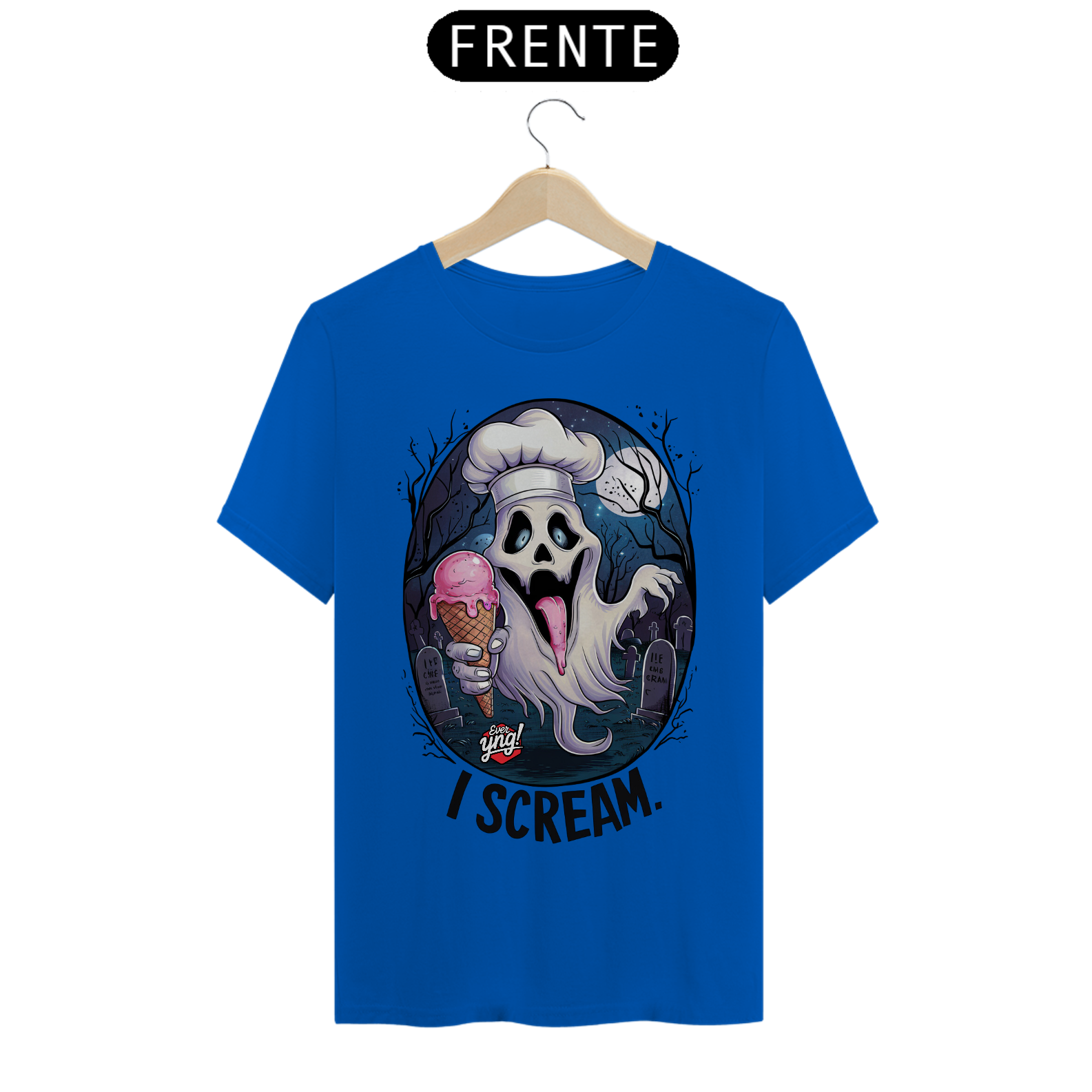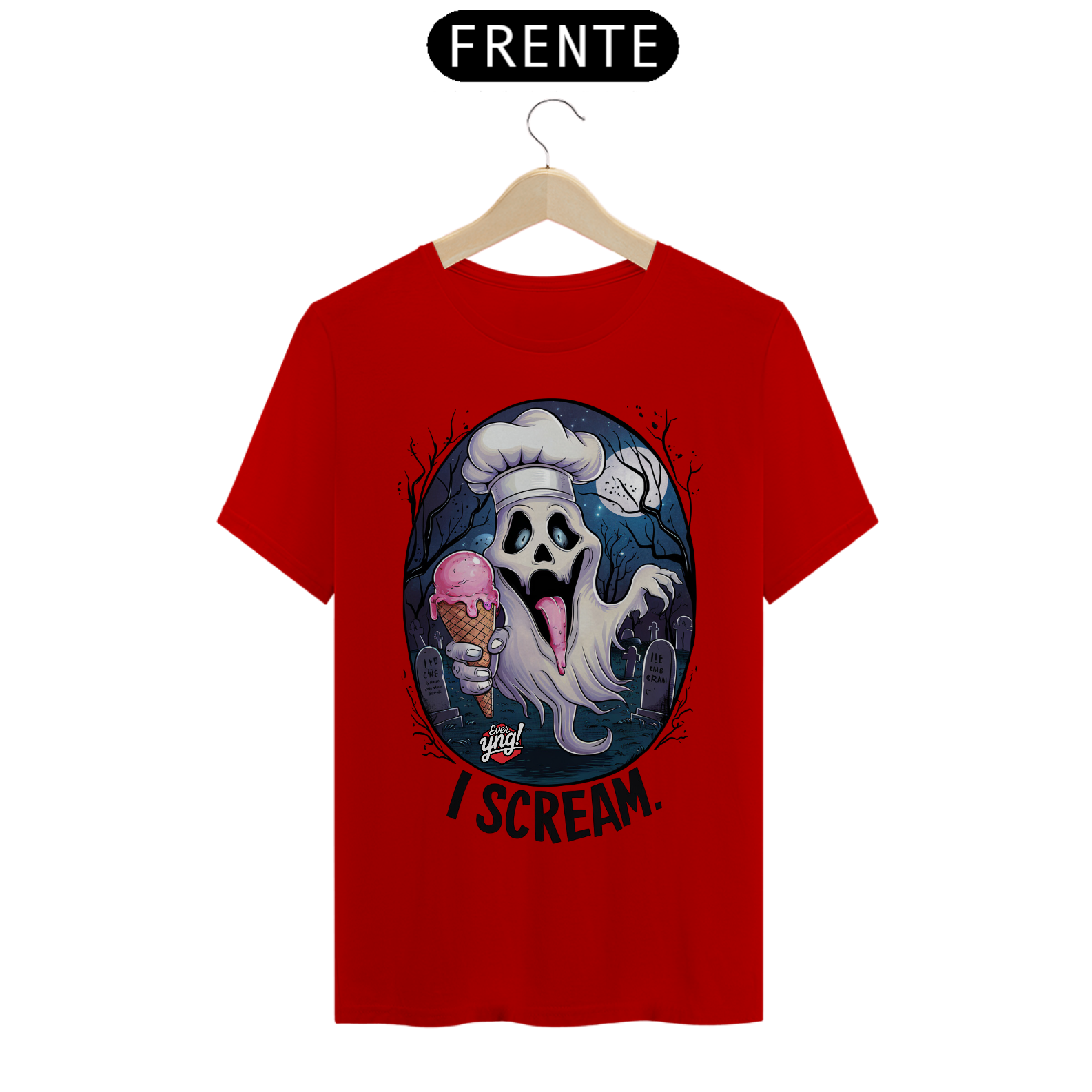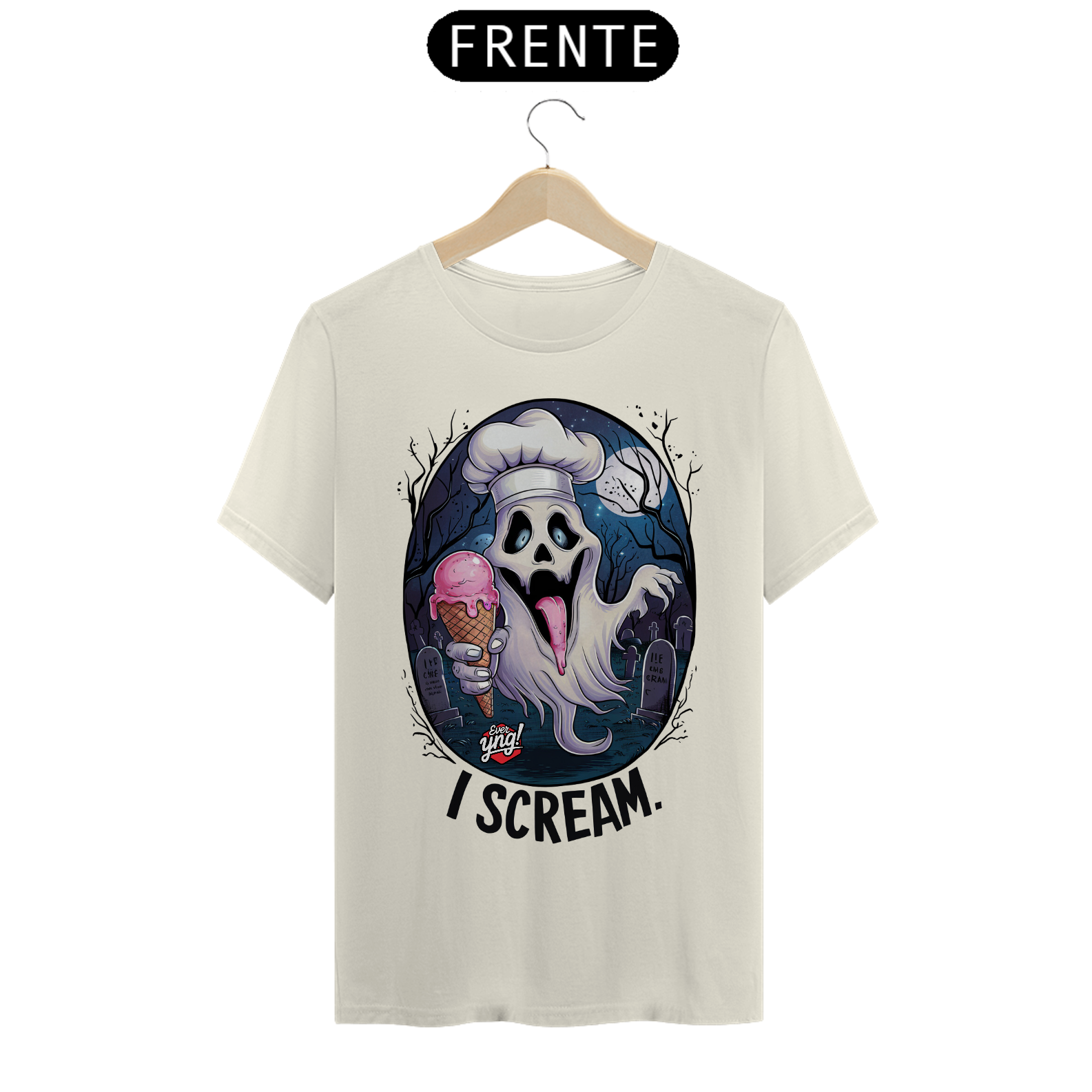 Brinque com o terror e o humor em uma estampa cheia de personalidade! Na ever Yng!, envelhecer é opcional, e com a "I Scream", o susto vira diversão. Um fantasma fantasmagórico com chapéu de chef, rindo com uma casquinha de sorvete na mão, toma o centro dessa peça. O fundo sombrio de cemitério ao luar, com lápides e árvores estéreis, contrasta com o toque cômico da frase "I scream", um trocadilho perfeito com o "Ice cream". Ideal para os ousados e aqueles que gostam de humor inteligente e sombrio.