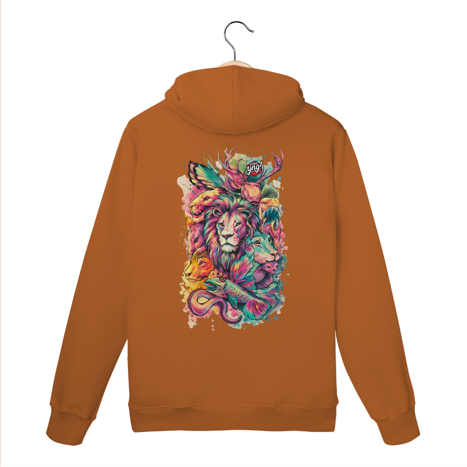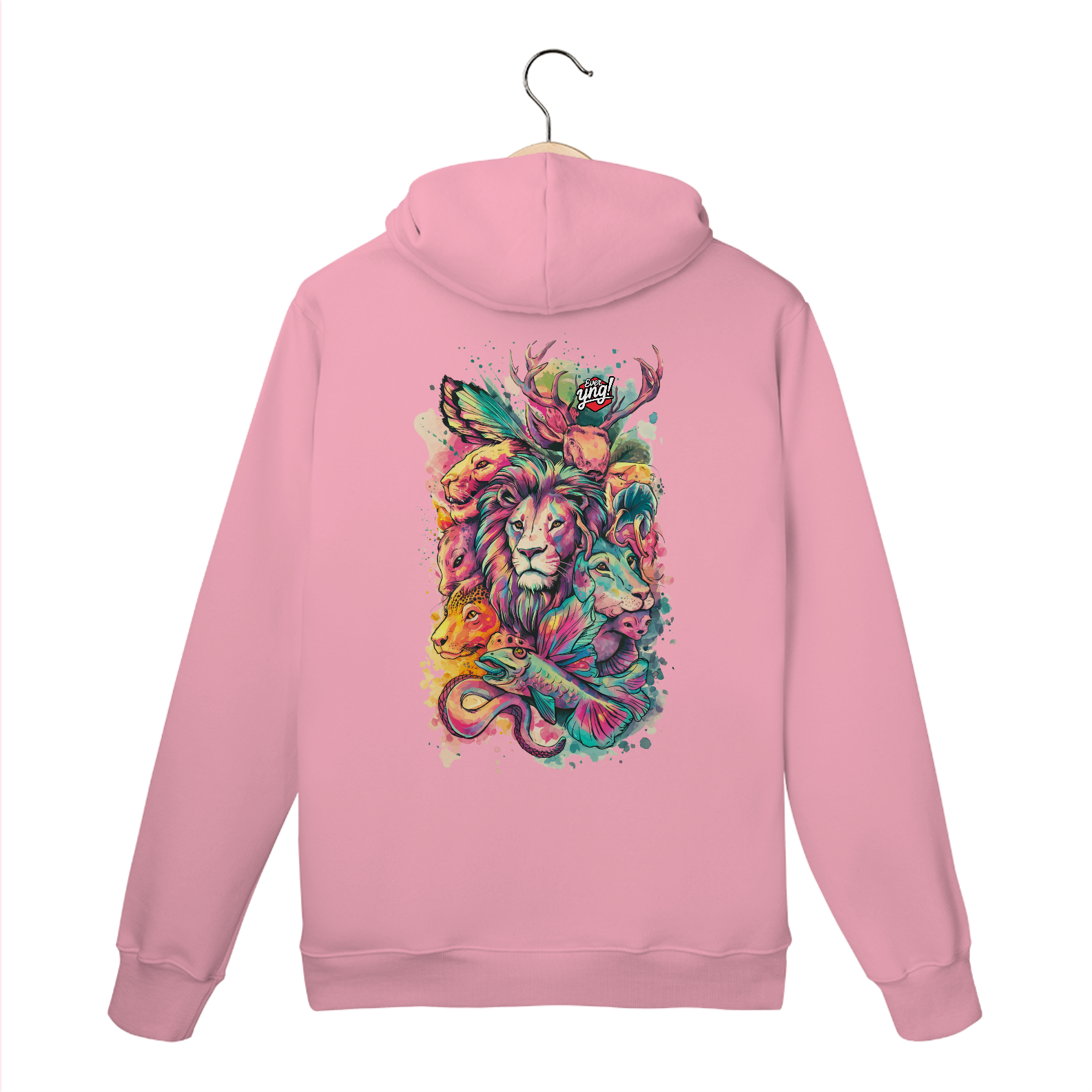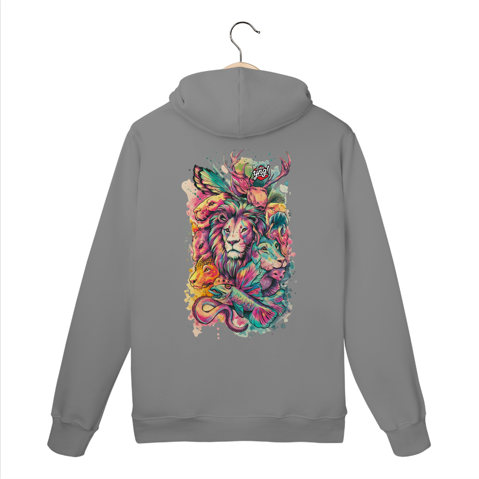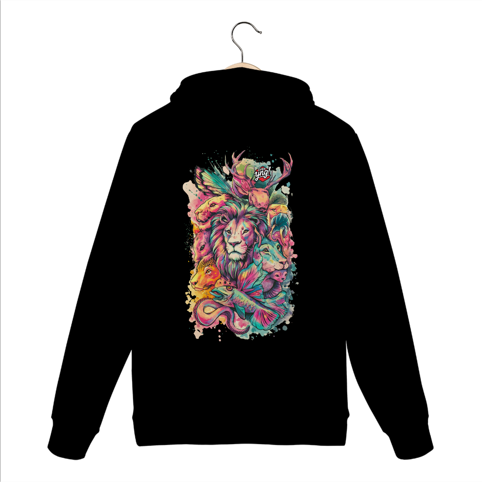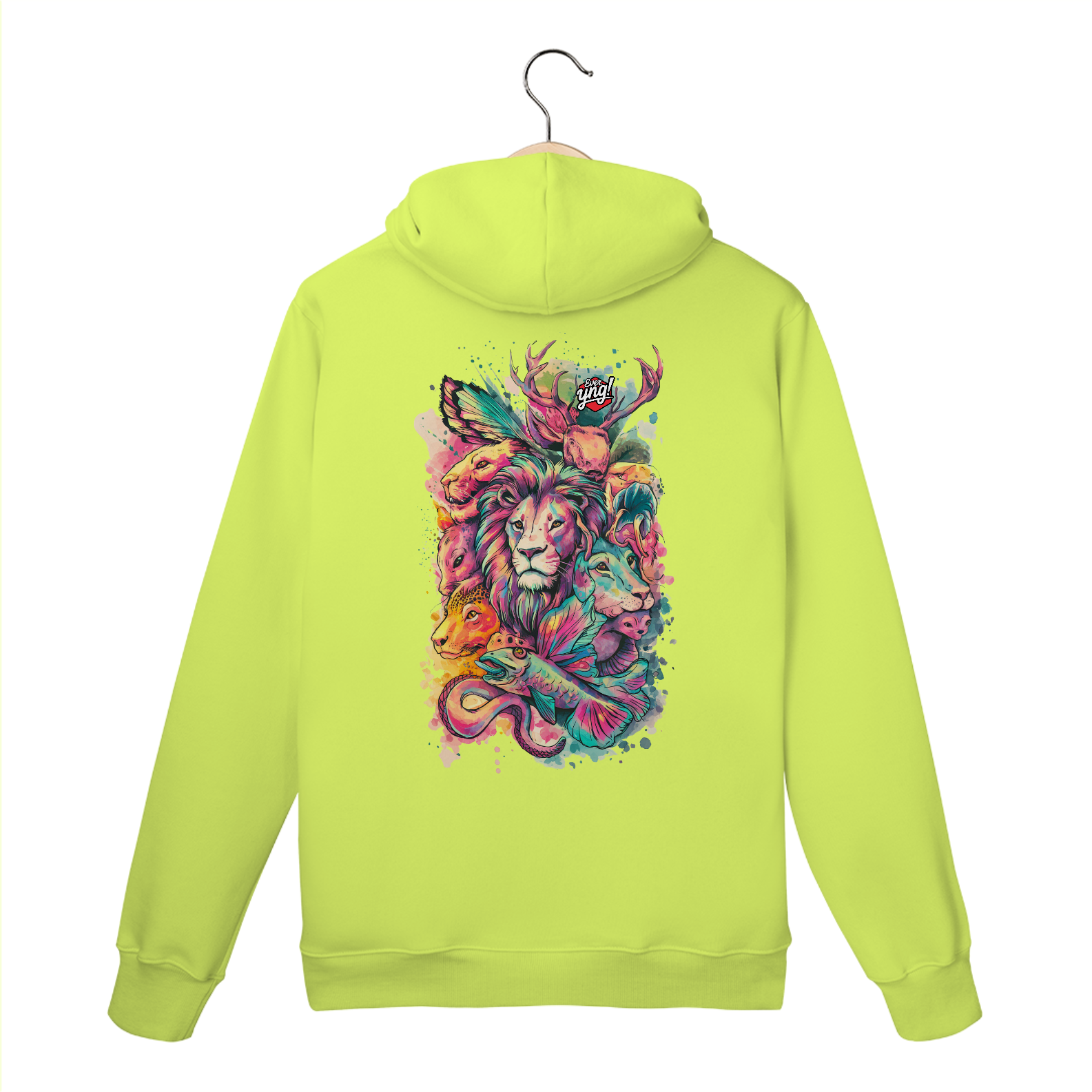 Animais do Abstrato da ever Yng! é uma explosão de cores e formas. Com um leão majestoso ao centro e criaturas como cervo, raposa, peixe e cobra ao redor, essa estampa une a vida selvagem com um toque de fantasia. Perfeita para quem quer carregar a natureza e a arte em uma só peça, esse design vibrante destaca a harmonia e a interconexão entre os seres. Uma verdadeira obra-prima para seu guarda-roupa.