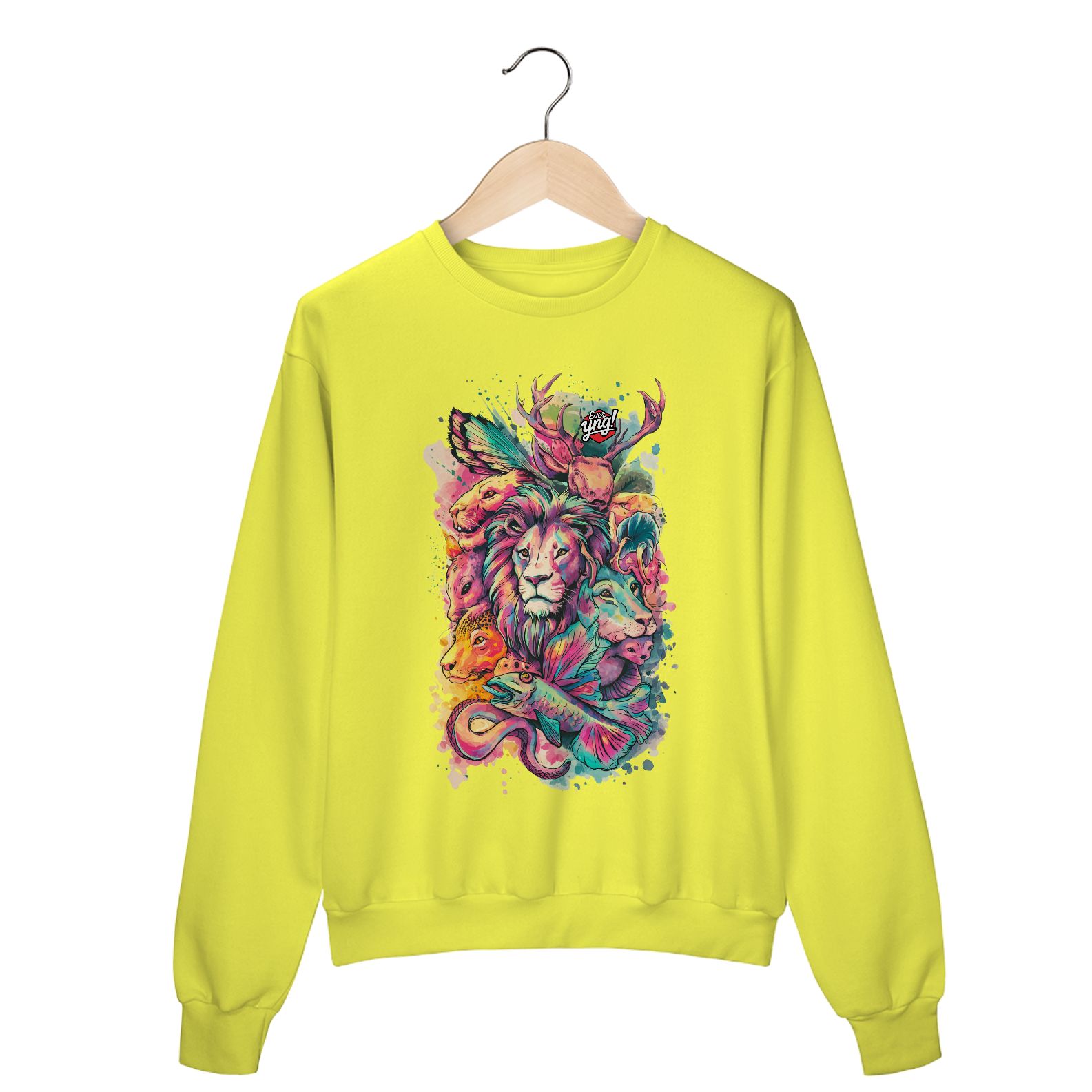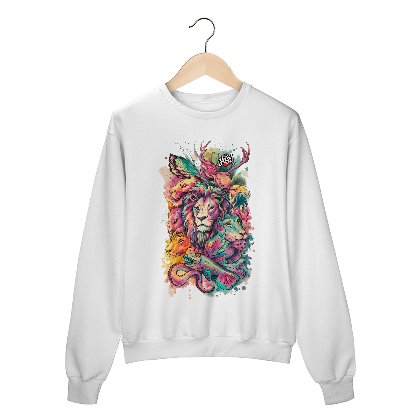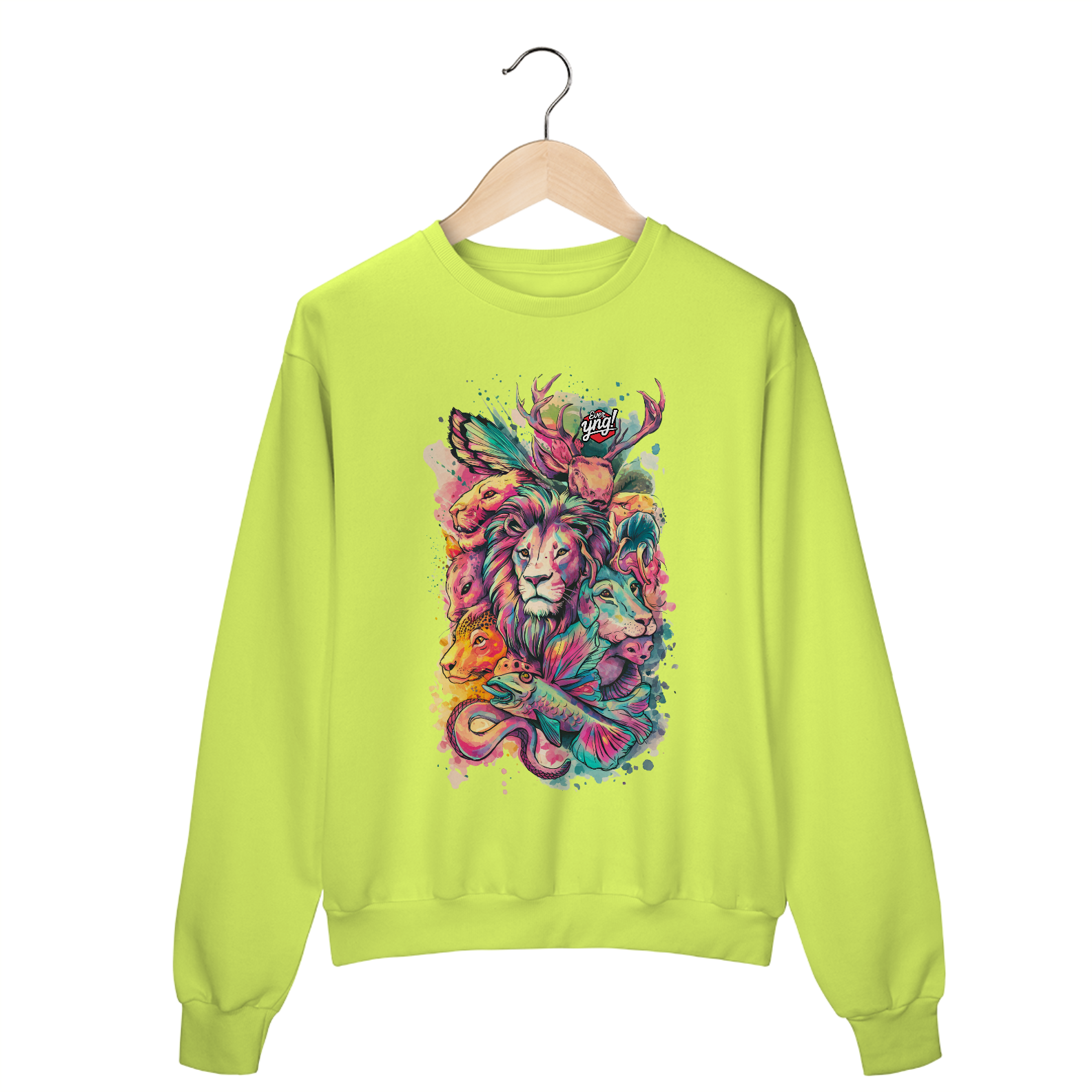 Animais do Abstrato da ever Yng! é uma explosão de cores e formas. Com um leão majestoso ao centro e criaturas como cervo, raposa, peixe e cobra ao redor, essa estampa une a vida selvagem com um toque de fantasia. Perfeita para quem quer carregar a natureza e a arte em uma só peça, esse design vibrante destaca a harmonia e a interconexão entre os seres. Uma verdadeira obra-prima para seu guarda-roupa.