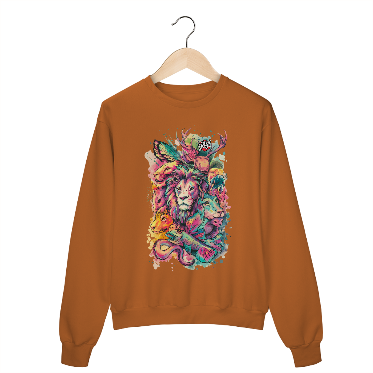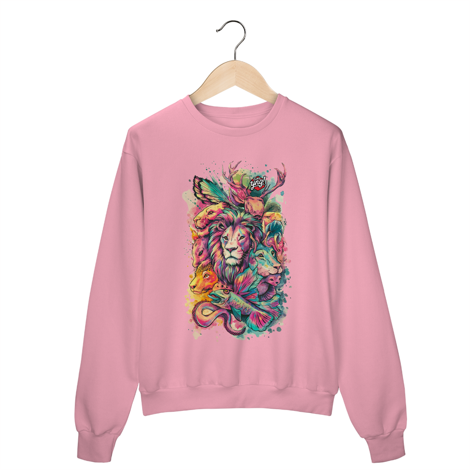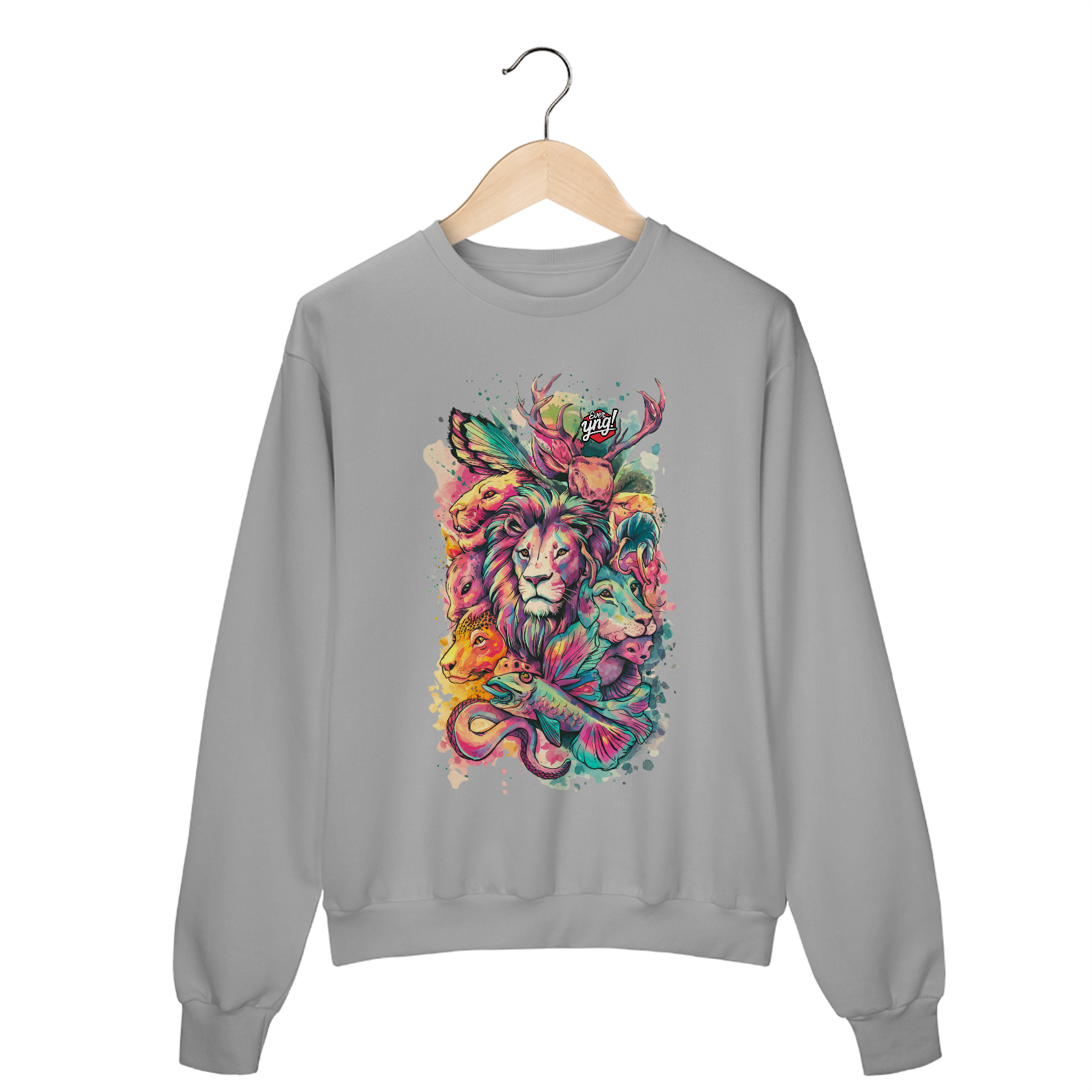 Animais do Abstrato da ever Yng! é uma explosão de cores e formas. Com um leão majestoso ao centro e criaturas como cervo, raposa, peixe e cobra ao redor, essa estampa une a vida selvagem com um toque de fantasia. Perfeita para quem quer carregar a natureza e a arte em uma só peça, esse design vibrante destaca a harmonia e a interconexão entre os seres. Uma verdadeira obra-prima para seu guarda-roupa.