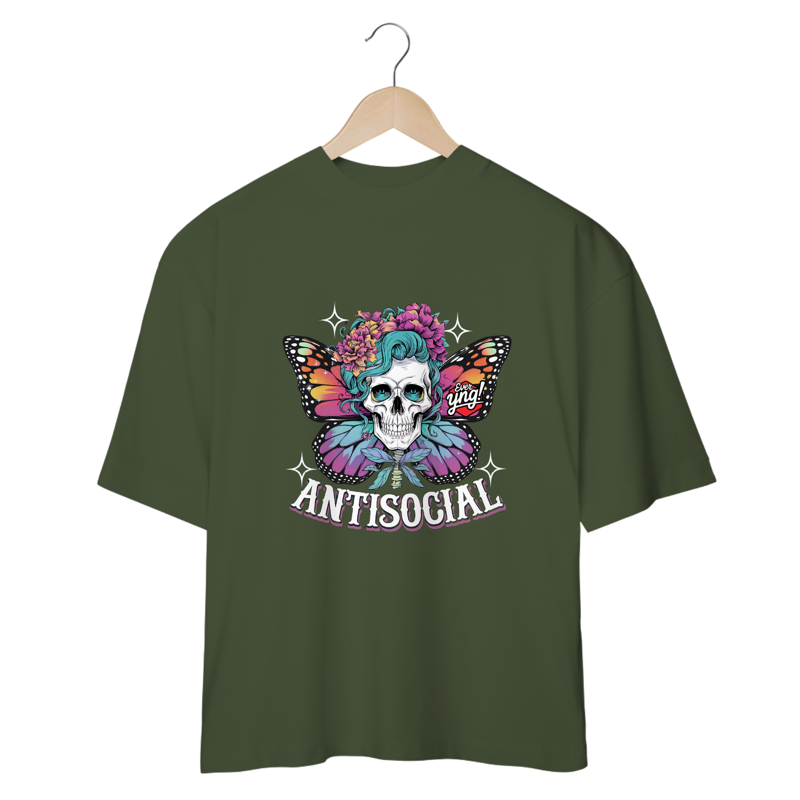 Expresse sua individualidade com "Antissocial floral". Esta peça traz uma caveira vibrante com cabelos azul-petróleo, emoldurada por flores coloridas e adornada com asas de borboleta em tons quentes. Com um fundo escuro que ressalta as cores vibrantes, essa estampa é uma celebração da beleza única e da liberdade. Vista-se de forma ousada e mostre que ser diferente é uma arte!