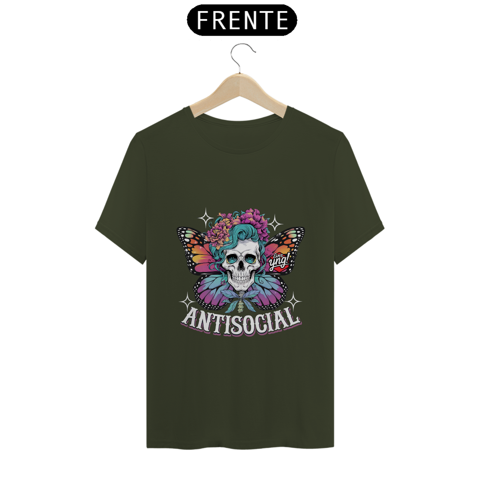 Expresse sua individualidade com "Antissocial floral". Esta peça traz uma caveira vibrante com cabelos azul-petróleo, emoldurada por flores coloridas e adornada com asas de borboleta em tons quentes. Com um fundo escuro que ressalta as cores vibrantes, essa estampa é uma celebração da beleza única e da liberdade. Vista-se de forma ousada e mostre que ser diferente é uma arte!