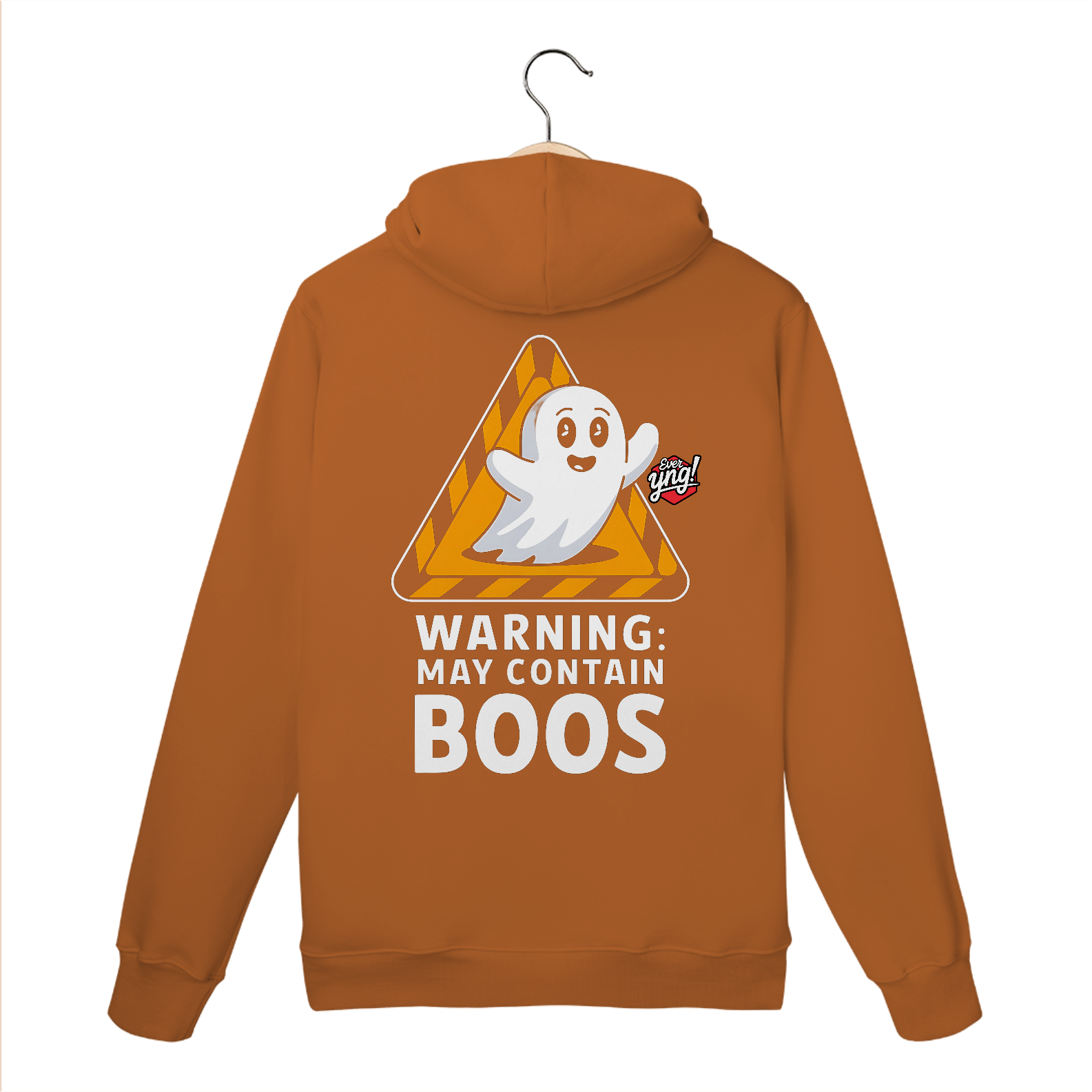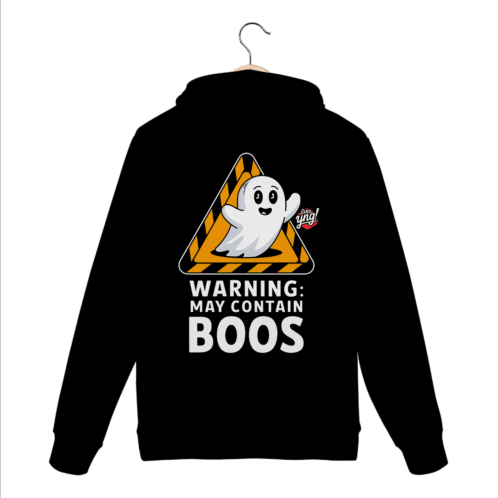 A estampa da Ever Yng! traz um fantasma simpático em um fundo preto, cercado por um sinal de alerta triangular. A frase "AVISO: PODE CONTER BOOS" adiciona um toque de humor leve, ideal para quem adora temas de Halloween com uma abordagem divertida. O design lúdico faz dessa peça uma escolha perfeita para quem quer celebrar o lado brincalhão do Halloween. A Ever Yng! novamente entrega uma estampa de alta qualidade com uma vibe jovem e criativa.