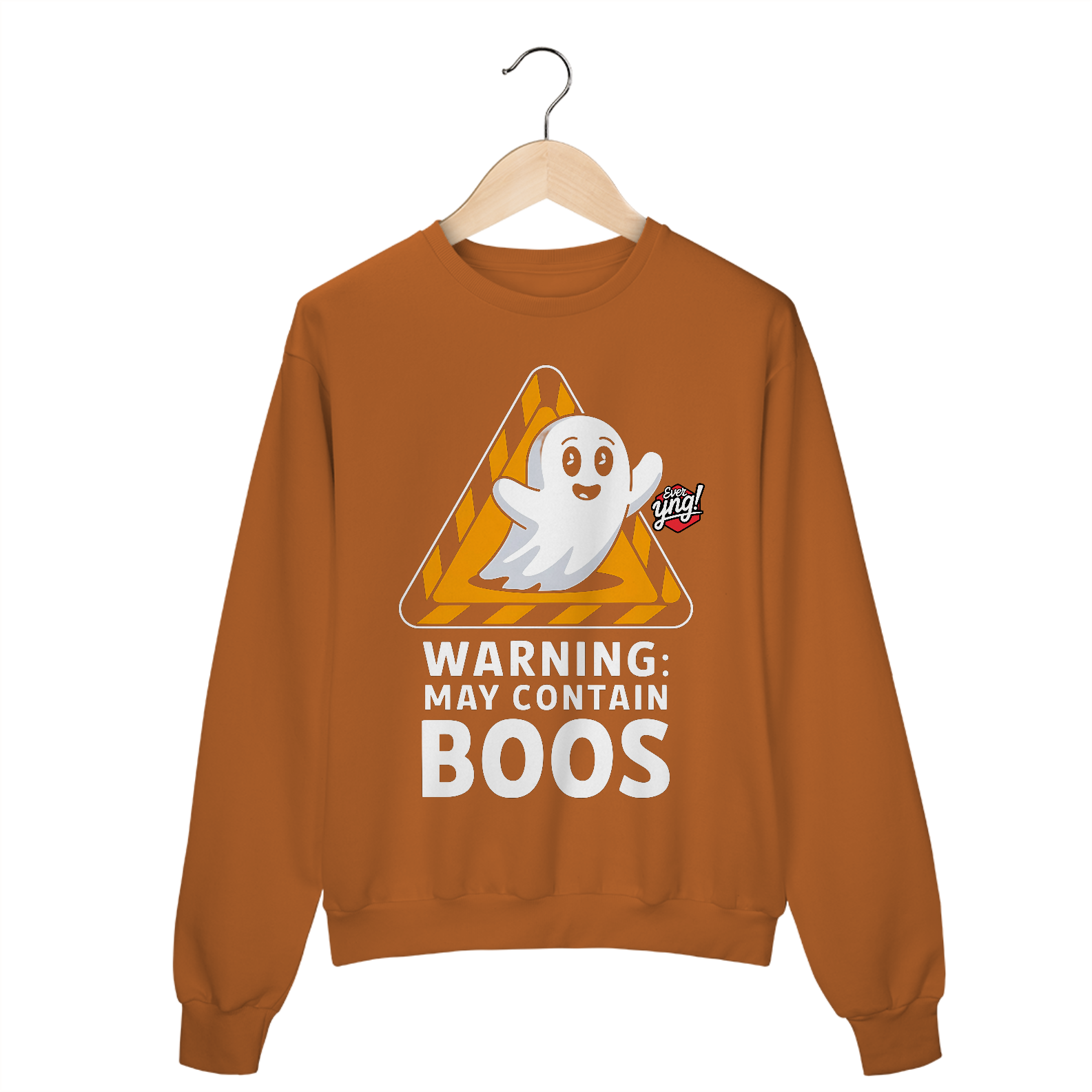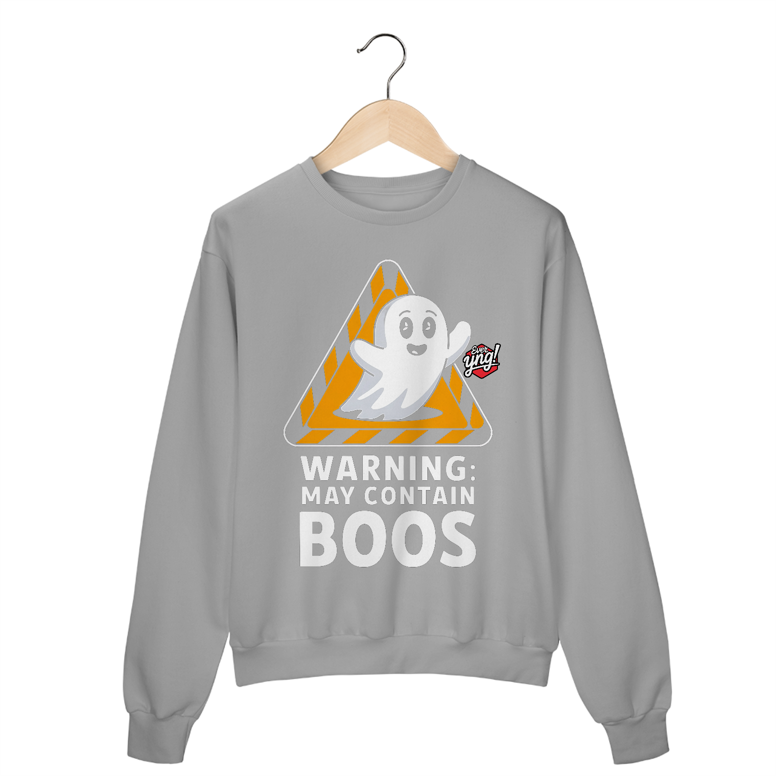 A estampa da Ever Yng! traz um fantasma simpático em um fundo preto, cercado por um sinal de alerta triangular. A frase "AVISO: PODE CONTER BOOS" adiciona um toque de humor leve, ideal para quem adora temas de Halloween com uma abordagem divertida. O design lúdico faz dessa peça uma escolha perfeita para quem quer celebrar o lado brincalhão do Halloween. A Ever Yng! novamente entrega uma estampa de alta qualidade com uma vibe jovem e criativa.