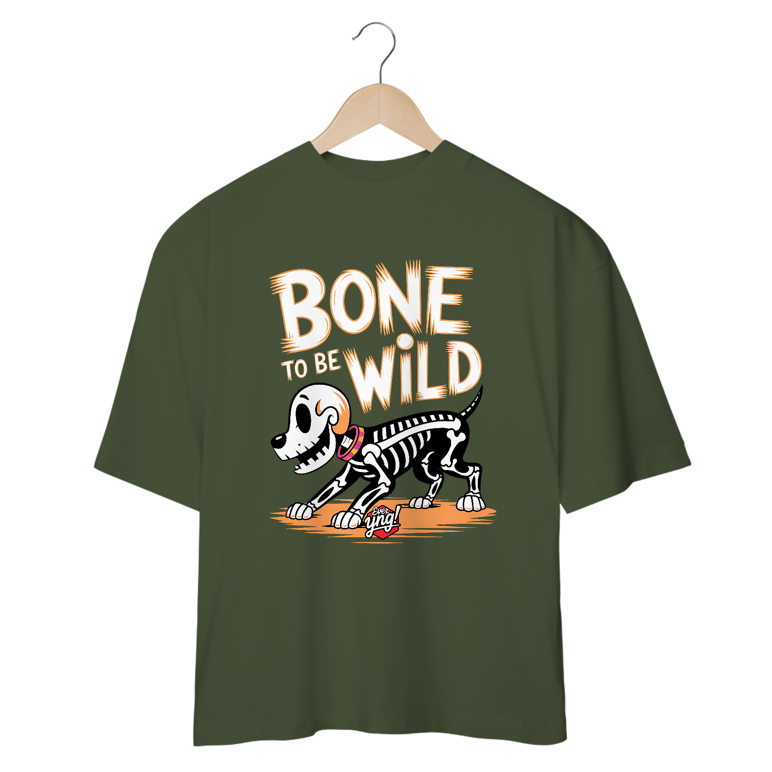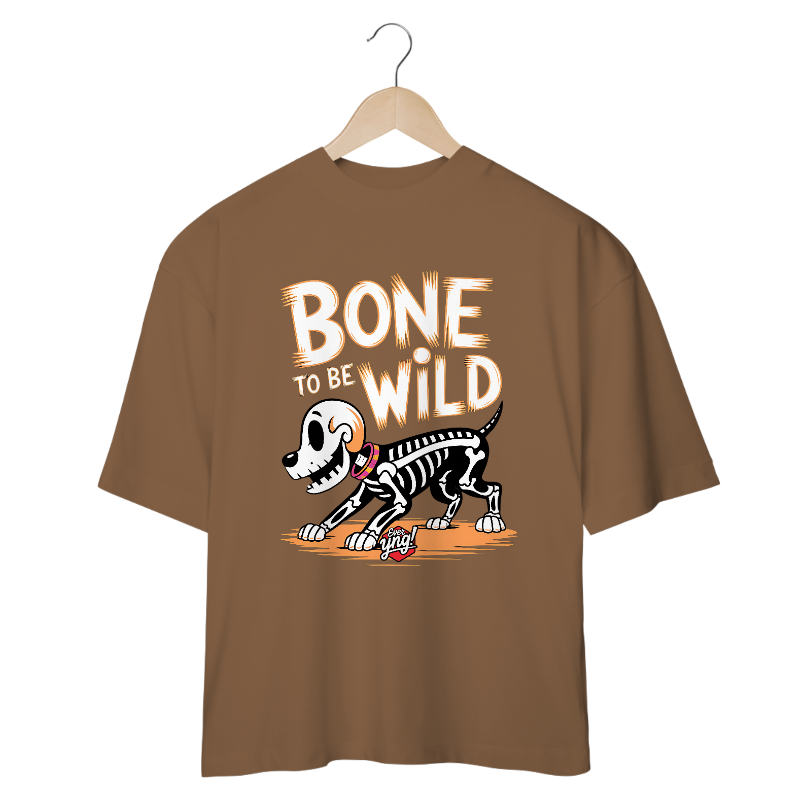 Uma versão renovada da clássica estampa “Bone to Be Wild”, agora com um cão esqueleto caminhando em um visual mais sombrio e moderno. Perfeito para os amantes de Halloween e estilo alternativo. A Ever Yng mantém a qualidade e inovação em cada detalhe!
