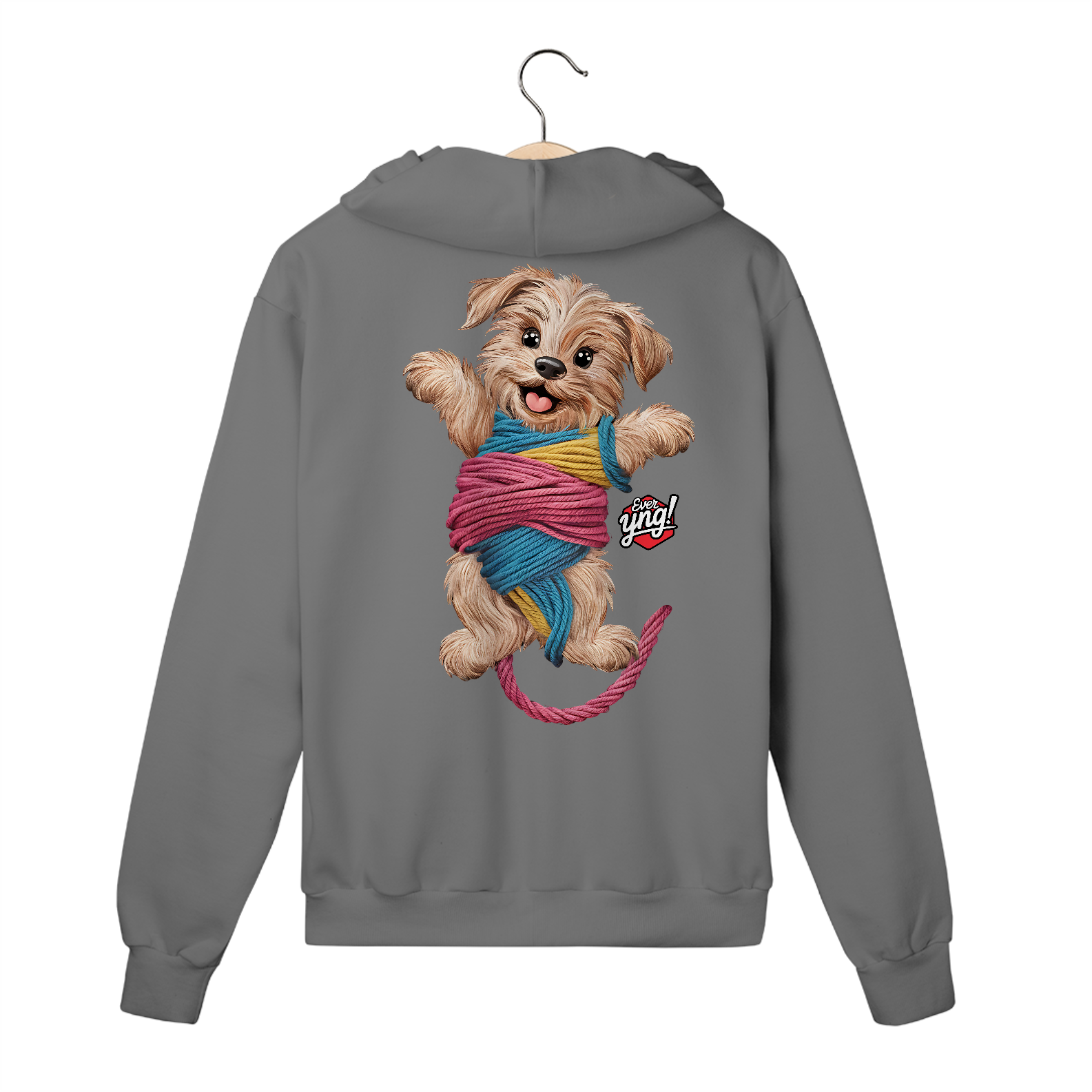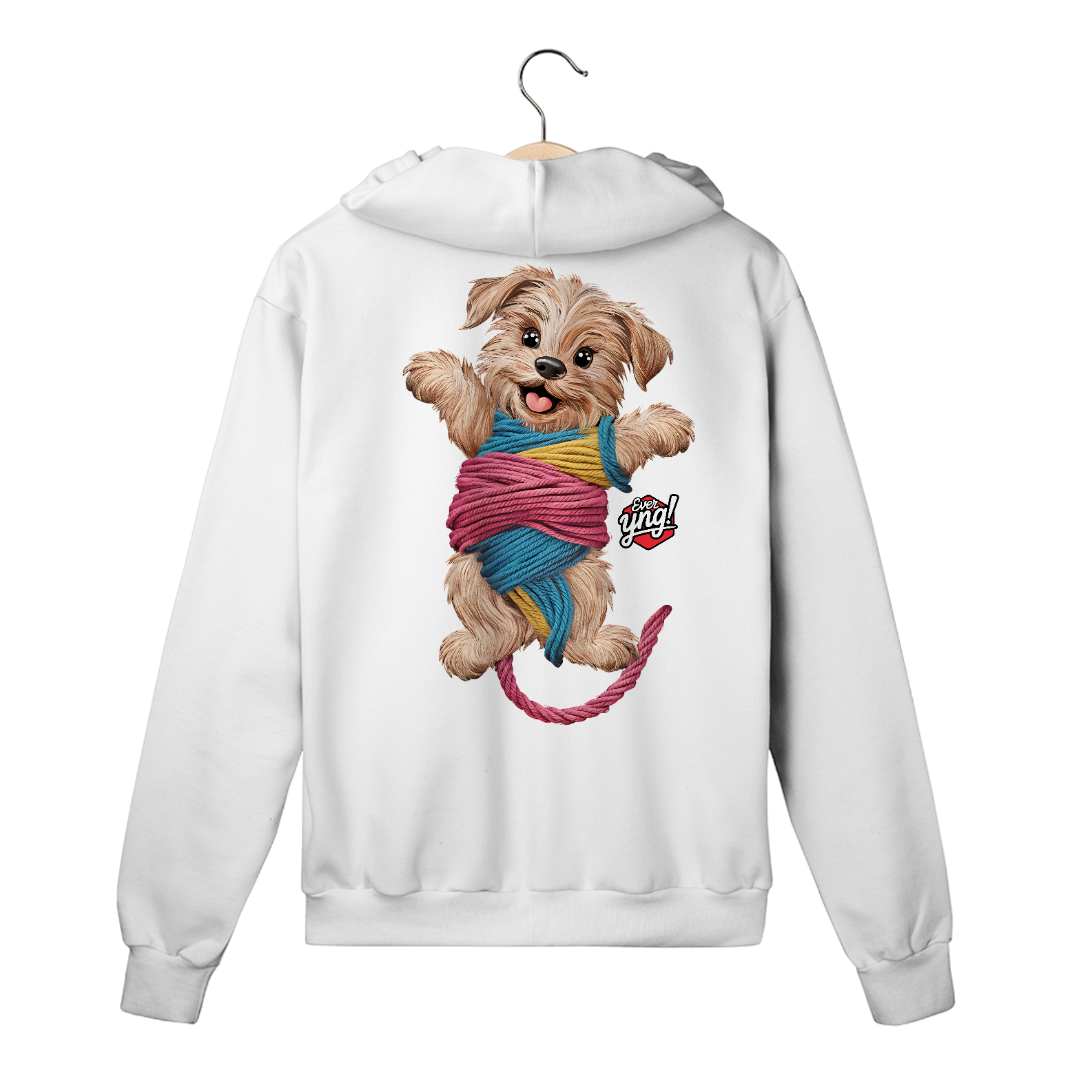 Traga um pouco de alegria com "Cachorrinho brincalhão". Esta peça apresenta um cão fofo envolto em fios coloridos, com uma expressão animada que derrete corações. Vista-se de alegria e celebre a vida com um sorriso!