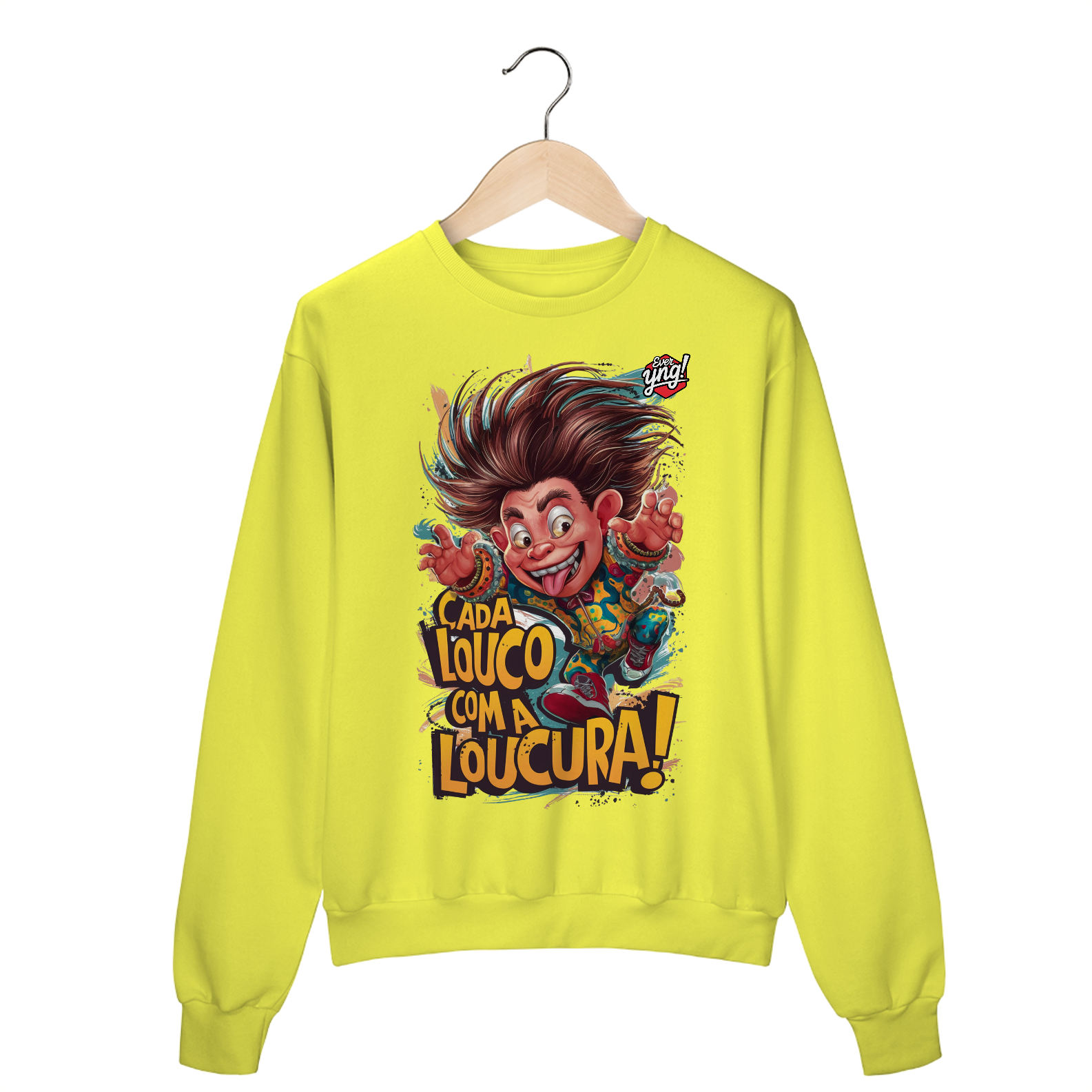 Uma explosão de cor e energia, esta estampa vibrante traz um personagem saltitante, com um sorriso exagerado e cabelos desgrenhados, expressando pura loucura. A frase em negrito "CADA LOUCO COM A LOUCURA!" complementa perfeitamente o clima divertido e animado do design. Feita para aqueles que abraçam a vida com intensidade e leveza, a camiseta ever Yng! é ideal para quem não tem medo de ser diferente e divertido.