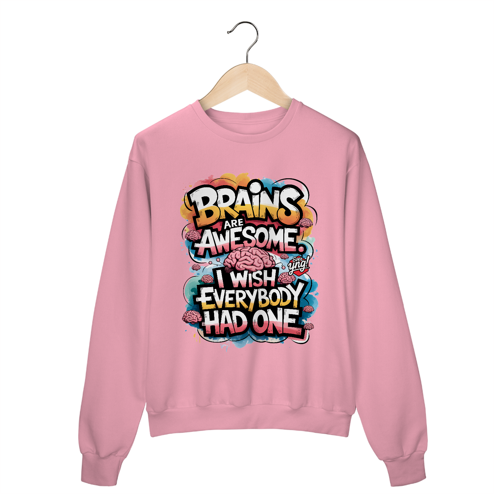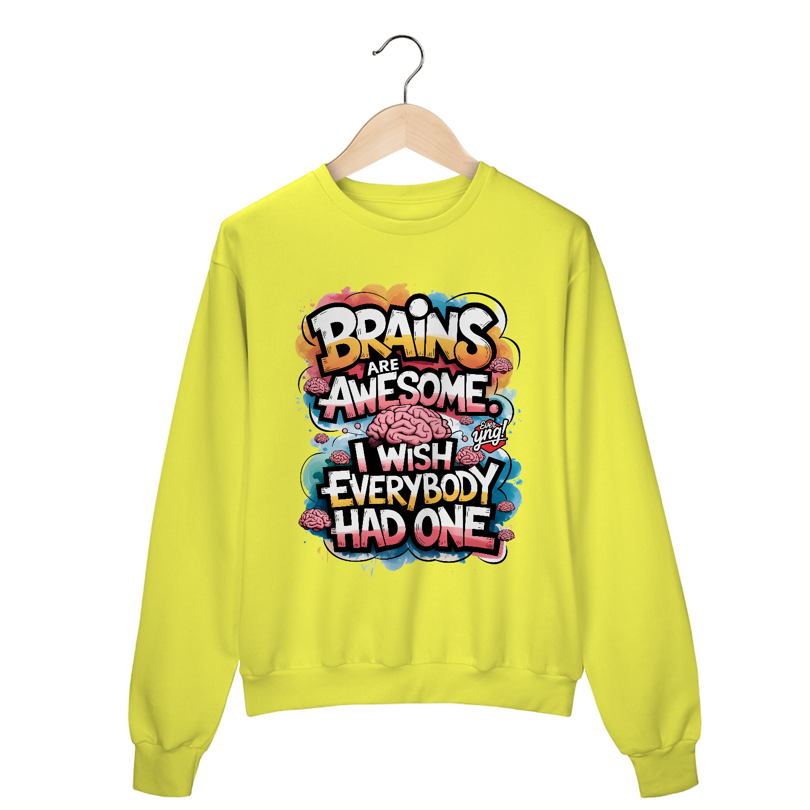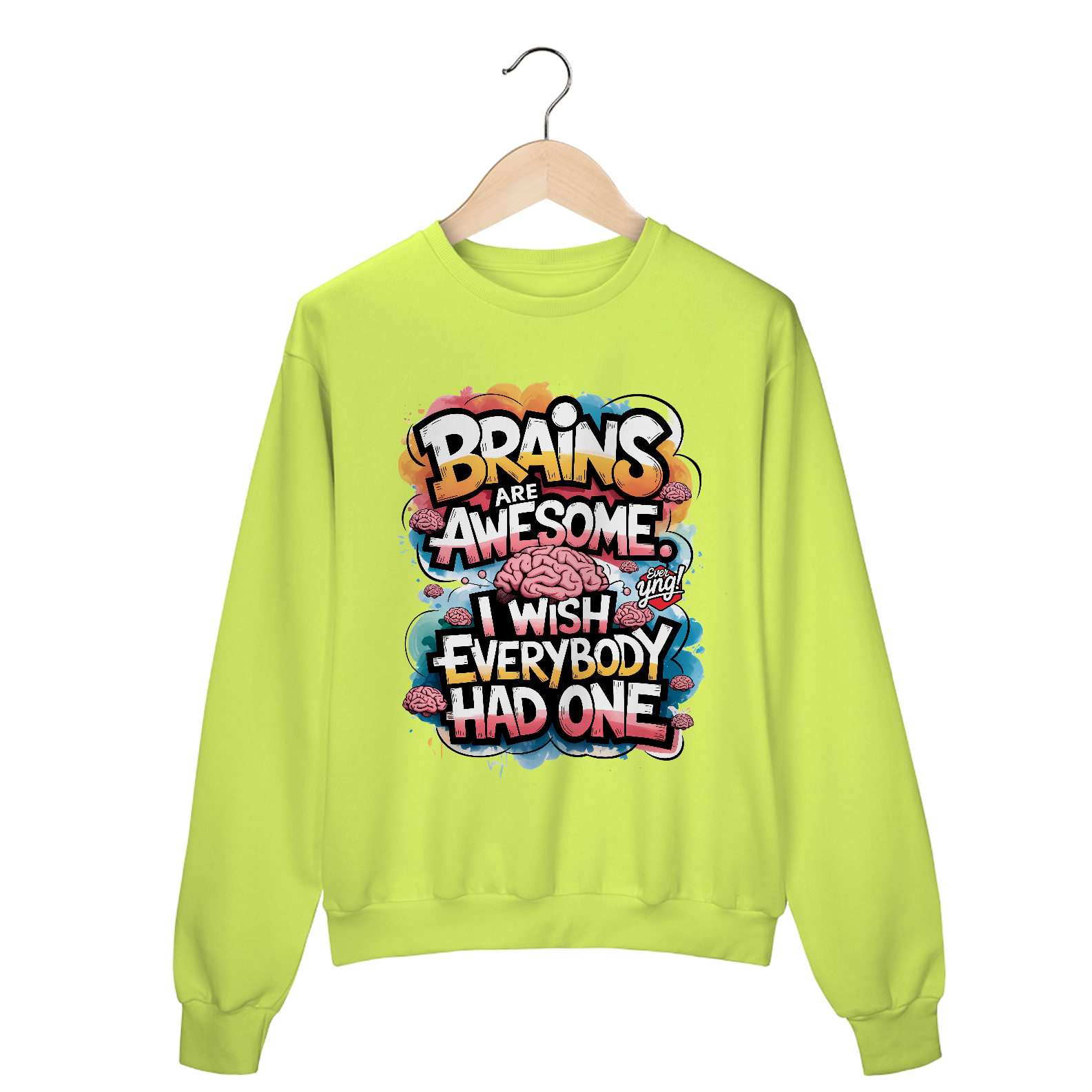 Uma explosão vibrante de cores e ilustrações de cérebros estilizados, com a frase “CÉREBROS SÃO INCRÍVEIS” flutuando no centro da composição. Uma peça energizante para aqueles que querem destacar sua inteligência com muito estilo. A Ever Yng capricha em criatividade com essa estampa cheia de cor e energia!